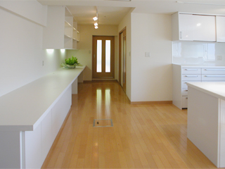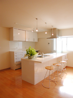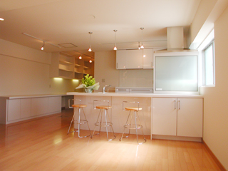家庭の中でも個人化が進む昨今ですが、Iさん御一家では御夫婦を中心に中学・高校のあわせて3人の子供さんの5人家族が、とても良い距離感で、まるでハーモニーを奏でるように、心地よい空気のファミリーを築いておられます。この家族のためのリフォームは、家族どうしの距離感をどう計るかがポイントだと考えました。 そこで、空間の連続性と回遊性を意識してプランニングしました。 リビング─キッチン─PCコーナーのどこにいても、常に連続した空間の全体が感じられ、言葉をかわさなくても気持ちが伝わりあう距離感、言葉をかけたい時にはいつでも話せる心地よい距離感が生まれてきます。 |
