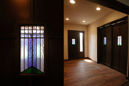 この教会の象徴とも言うべき、大窓の十字架ごしに、山を望む景色をロゴマークとしてデザインし、エントランスやロビーの扉にステンドグラスとしてはめ込んだ。