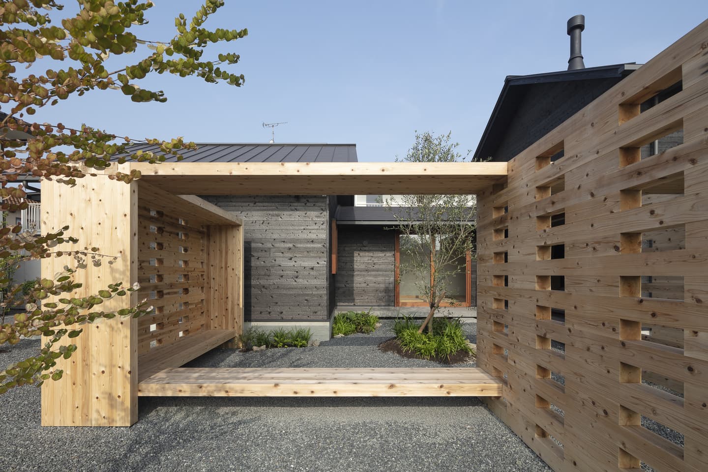 水路を挟んだ前面道路とは木の束で作ったベンチで領域を区切り、隣の畑とはゲートを兼ねた天蓋付きのベンチが両側からの居場所を作ります。