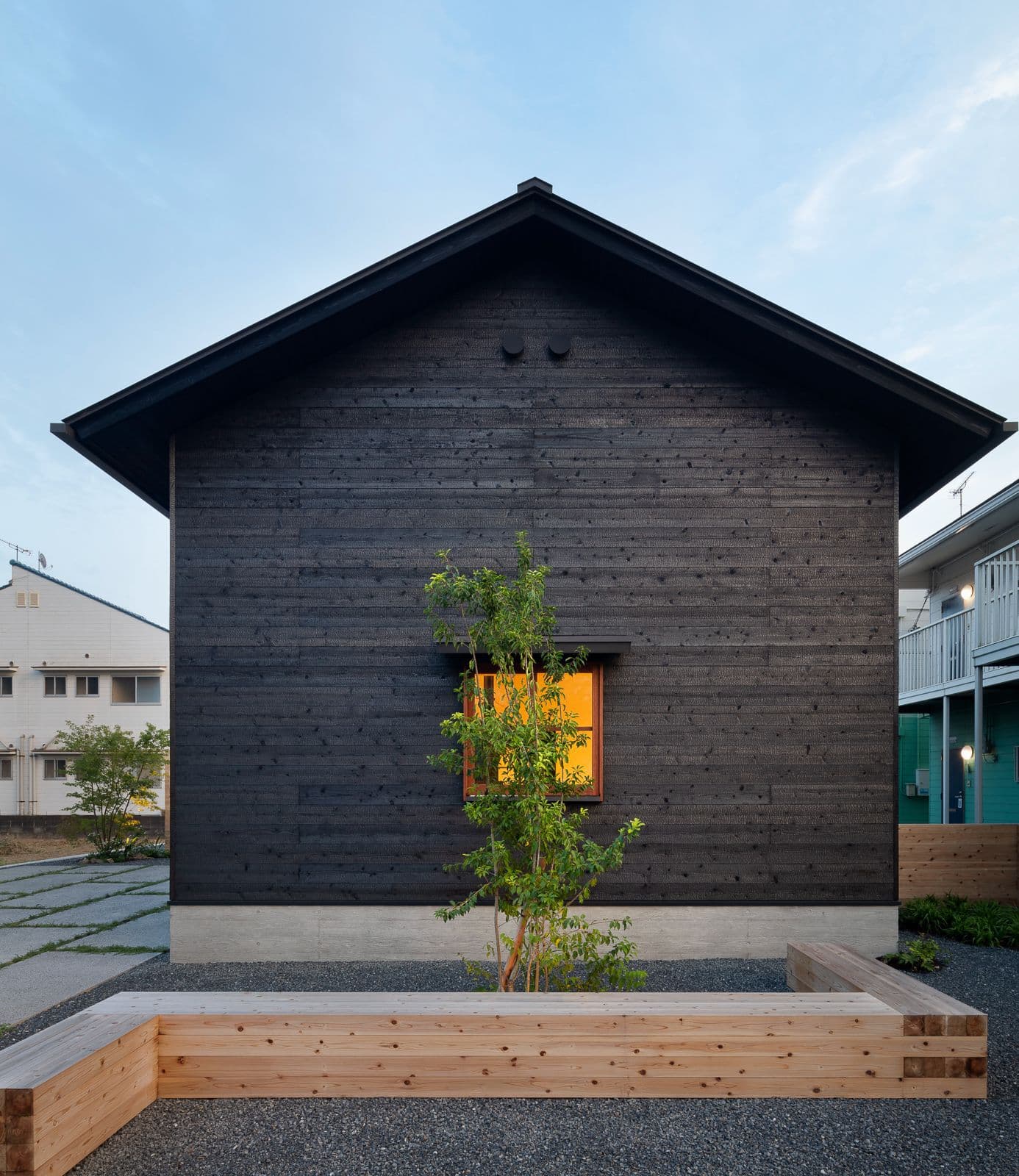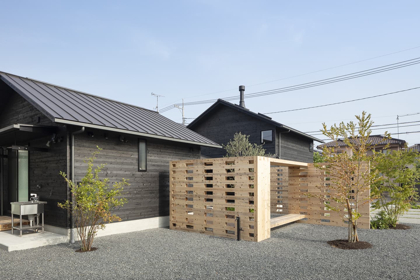 両親が耕す畑に隣接した敷地に建つ、コンパクトな住宅です。住まいと畑の間にの作業の合間に対話が生まれる屋外の居場所を設けて「畑の間」と名付けました。そこには天蓋付きのベンチがあり、畑と家を繋ぐ庭でありながら、「屋外の部屋」でもあります。「畑の間」を中心に、ロフト付きのLDKと、バスルーム付きの寝室が向かい合う配置で、屋内空間を限りなくコンパクトにした最小限の住宅です。ロフトを子供部屋として利用することで、延床面積を小さくすることができ、屋外空間を豊かにすることができました。