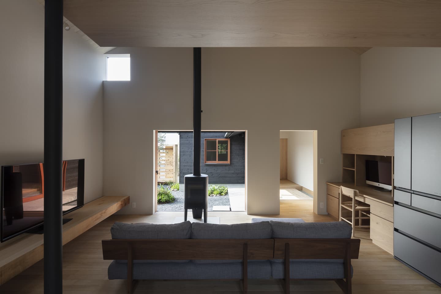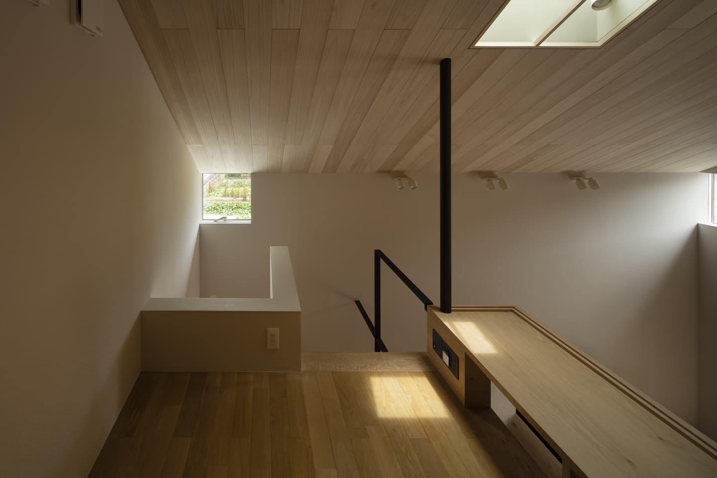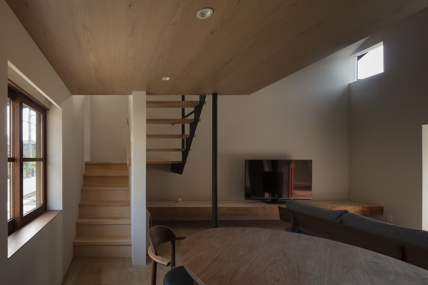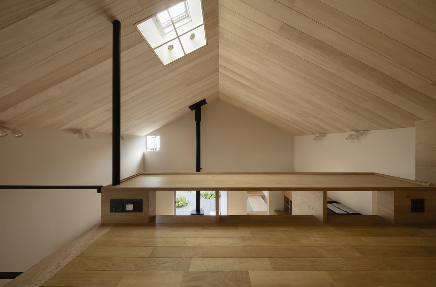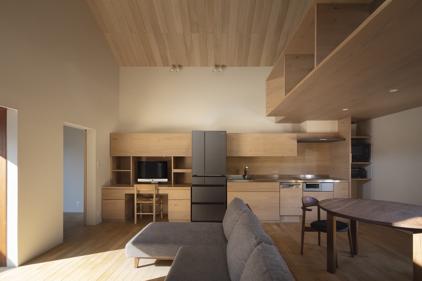 北側はワンボリュームのロフト付きLDK。子供部屋は設けず、ロフトが子供部屋を兼ねます。ダイニングの天井高を2100にして、床に座る机で宙に浮いた家具のようなロフトは、居場所の距離を近づけます。