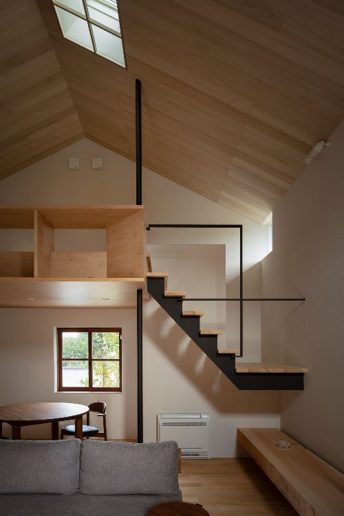 ロフトへ上がる階段は、裏を回って踊り場から突然現れます。柱と手すりのデザインが相まって一つの家具に見えるようです。