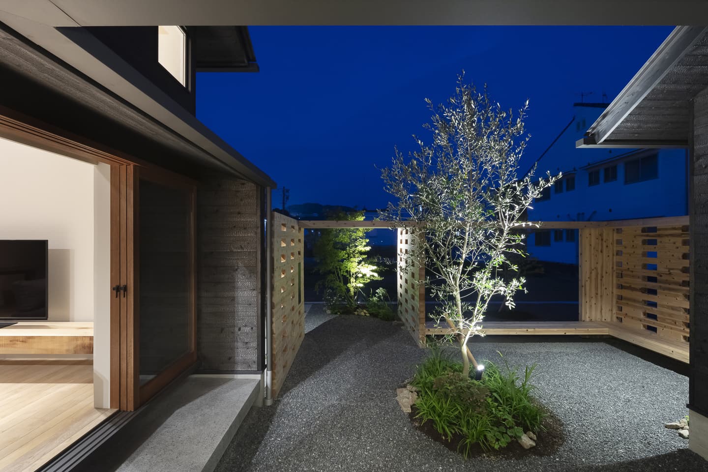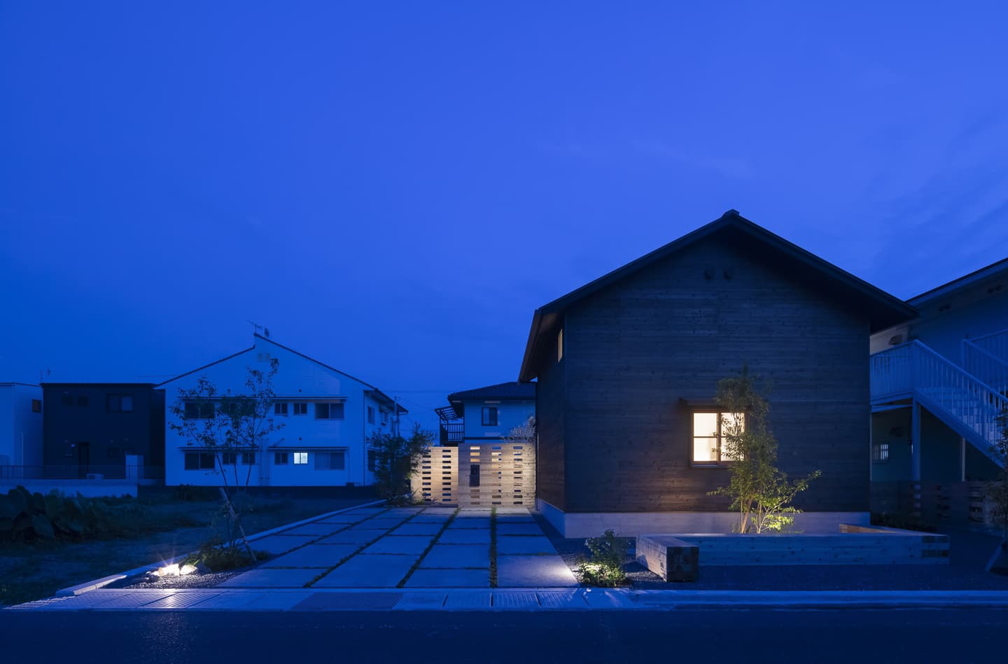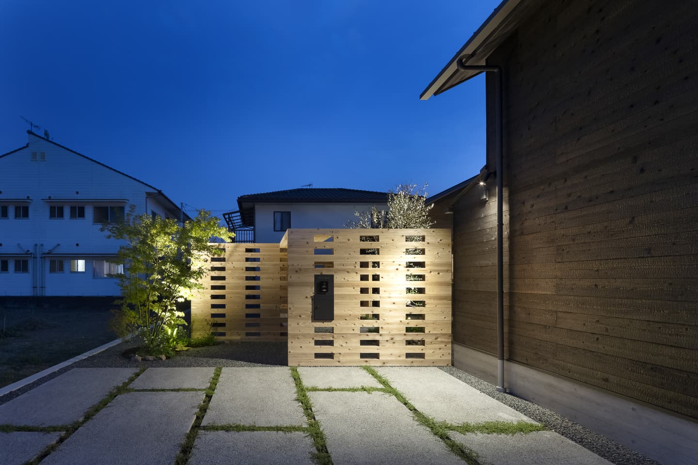 室内の光が溢れてくる畑の間。夜の玄関庭としても暖かな光で包みます。