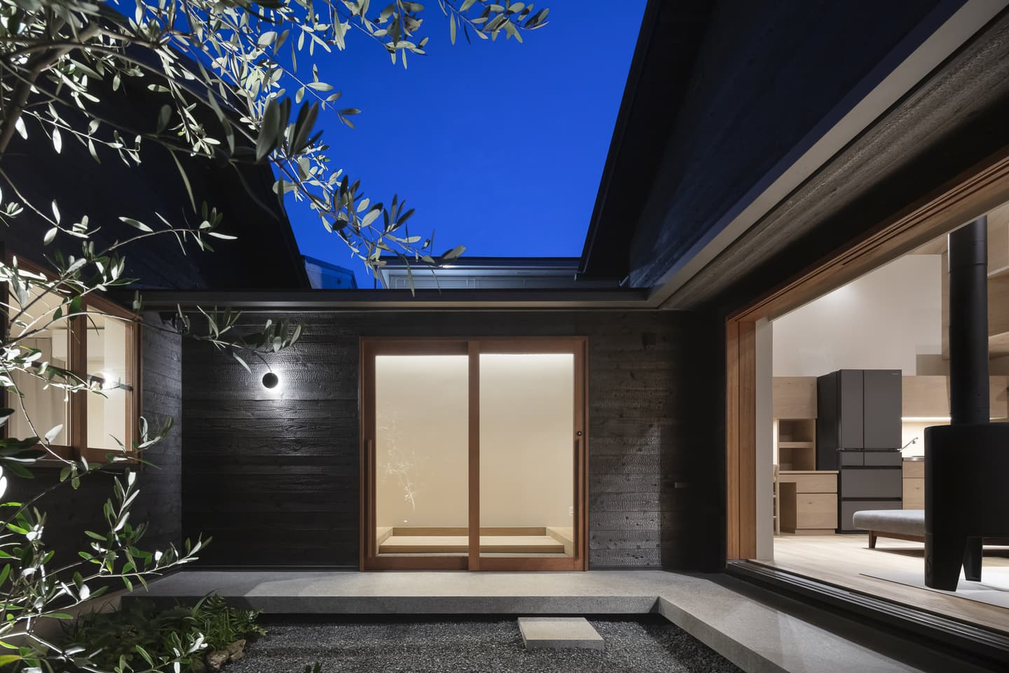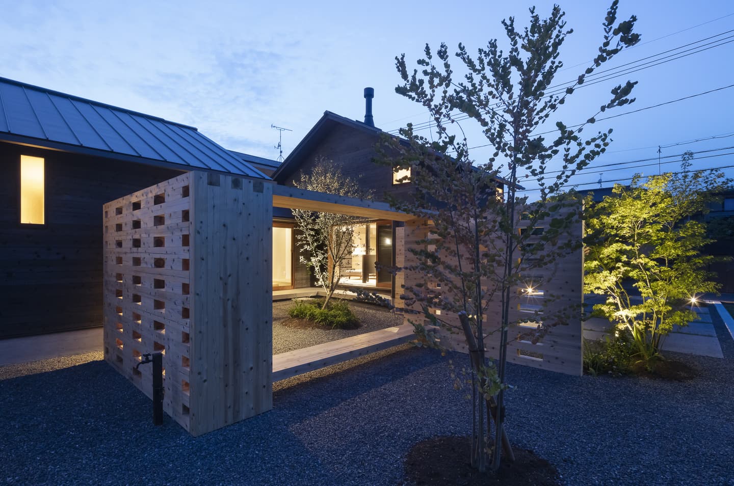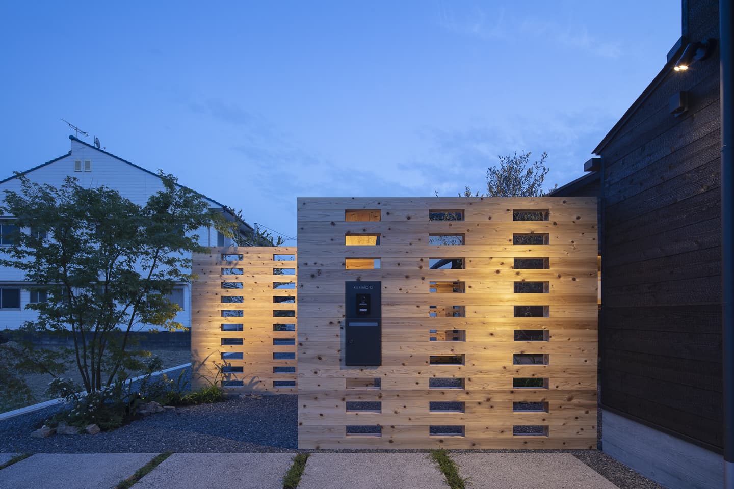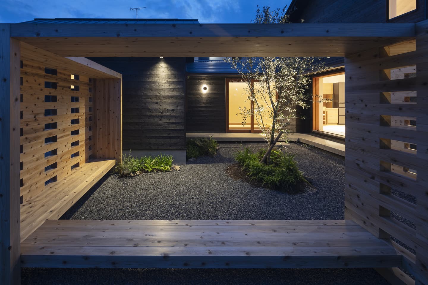 室内の光が溢れてくる畑の間。夜の玄関庭としても暖かな光で包みます。