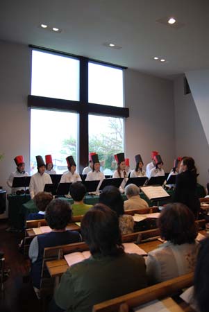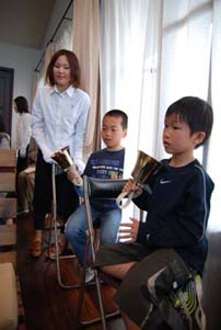 十字架を背景にたくさんのハンドベルがならんでいます。 ハンドベルは、アメリカの教会でカリヨンの練習をするために考案された楽器だそうです。(カリヨンはヨーロッパの教会でヤカンを叩いて人々に知らせていたのが起源だそうです。)