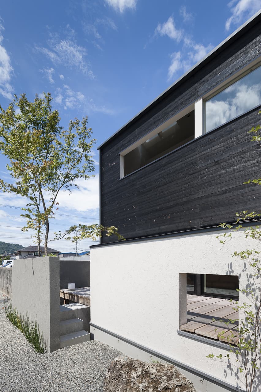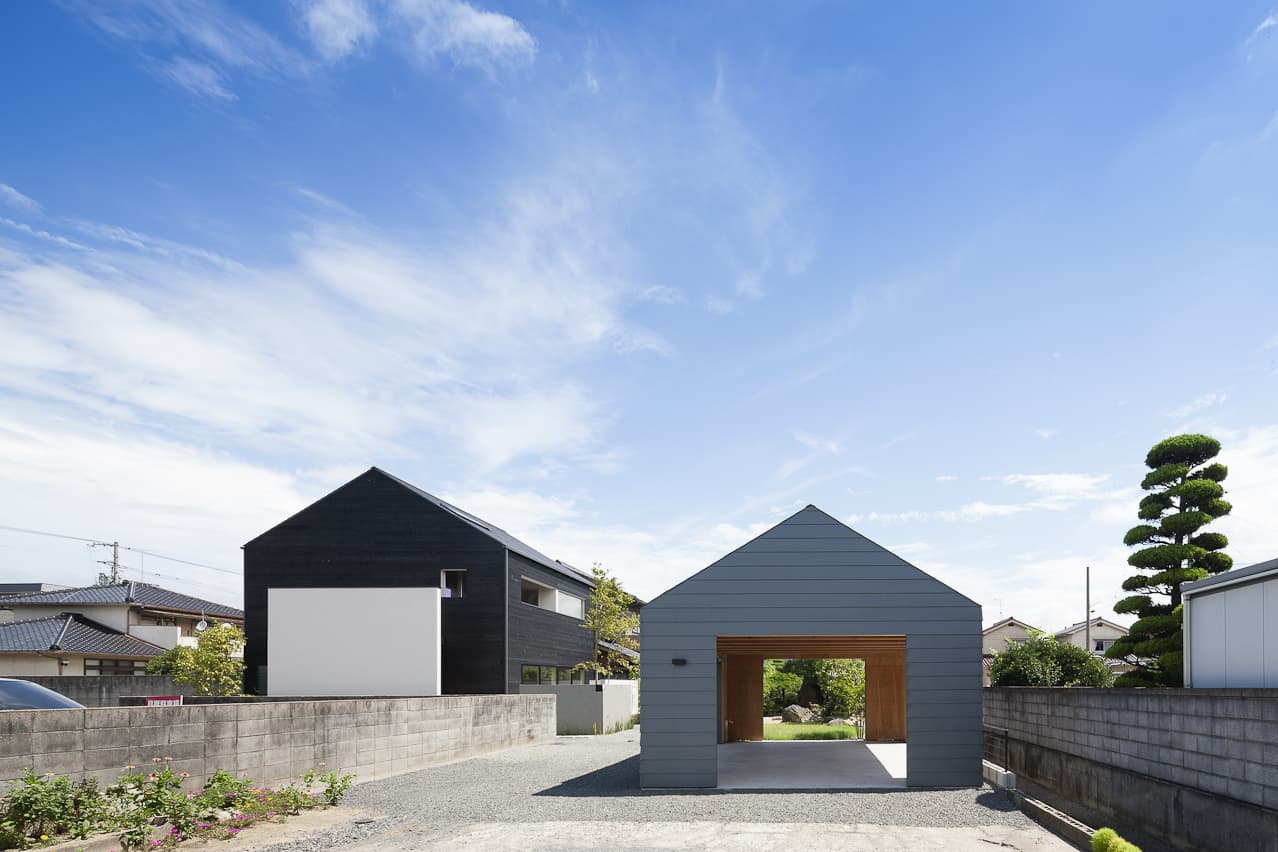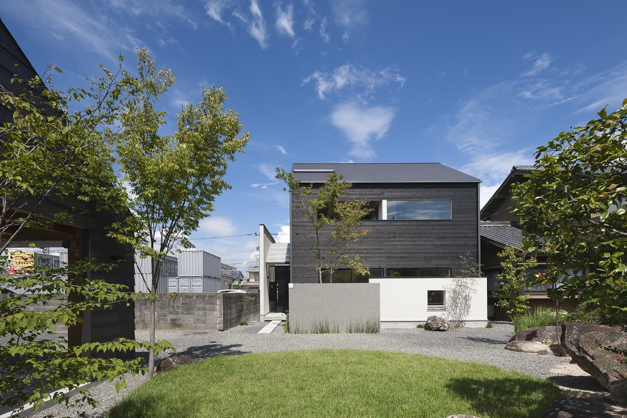 黒い焼杉、白い壁、ガンメタリックのガレージが、モノトーンで小さな群を作ります。