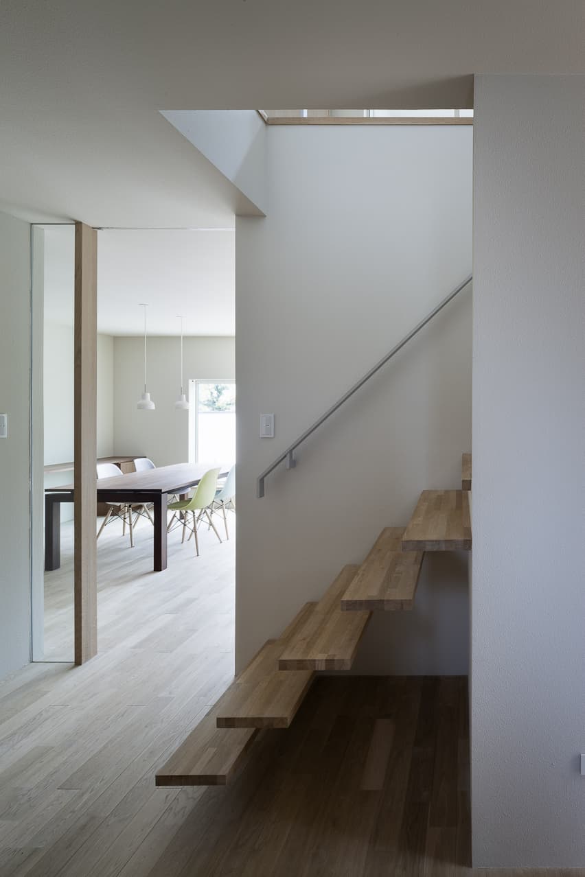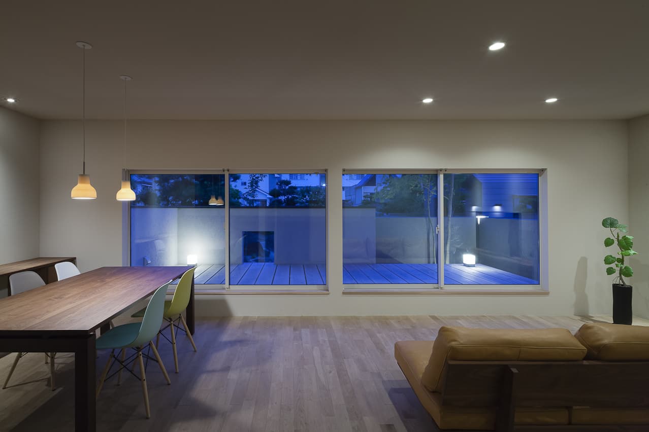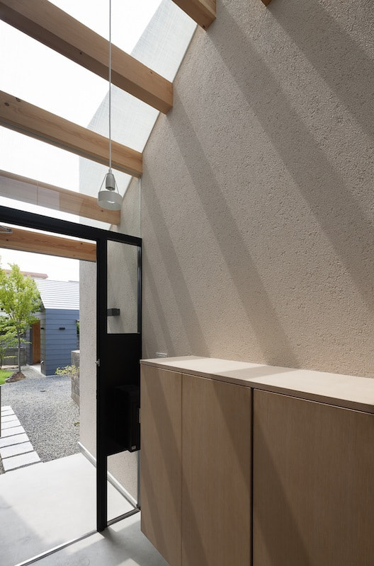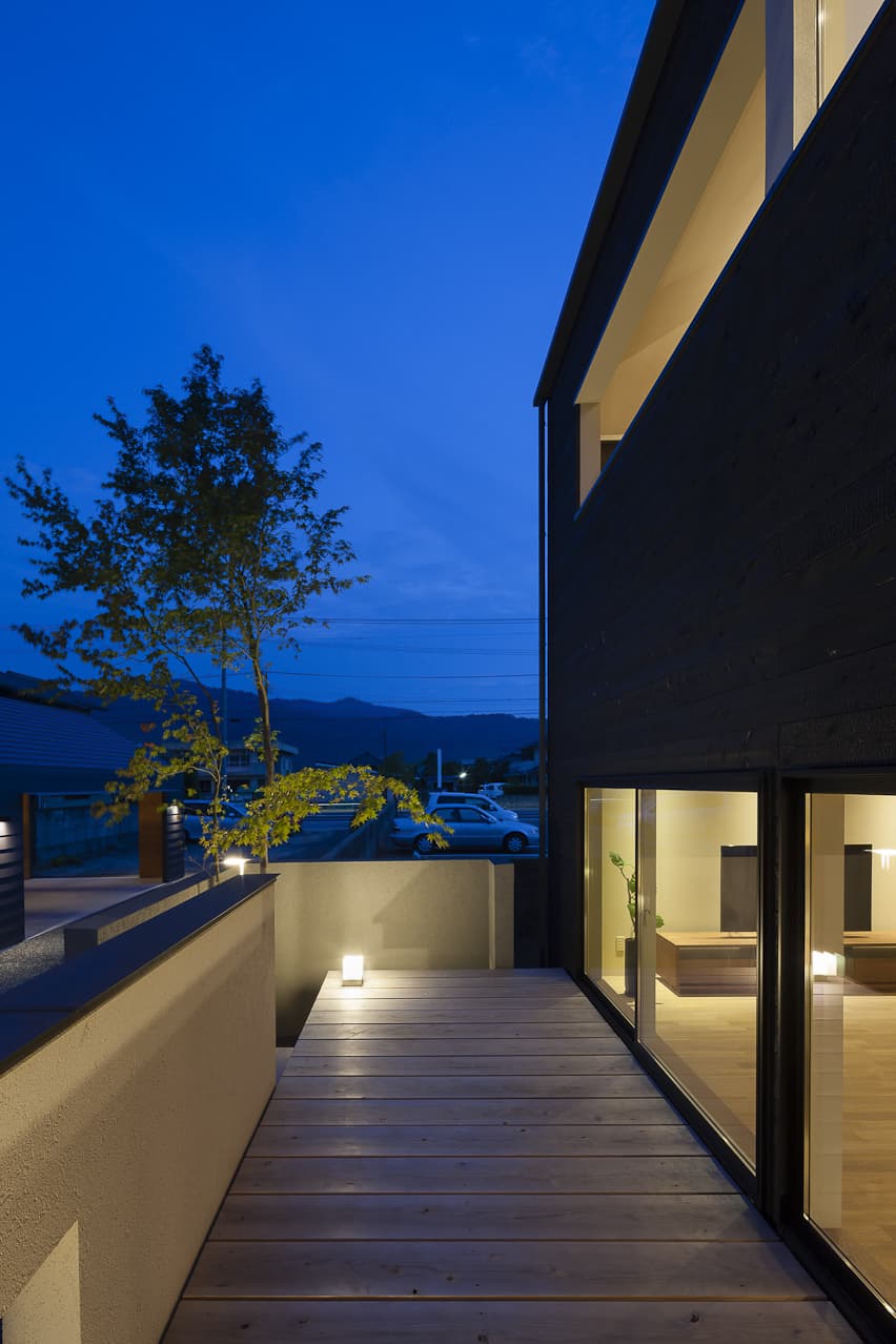 黒い焼杉、白い壁、ガンメタリックのガレージが、モノトーンで小さな群を作ります。