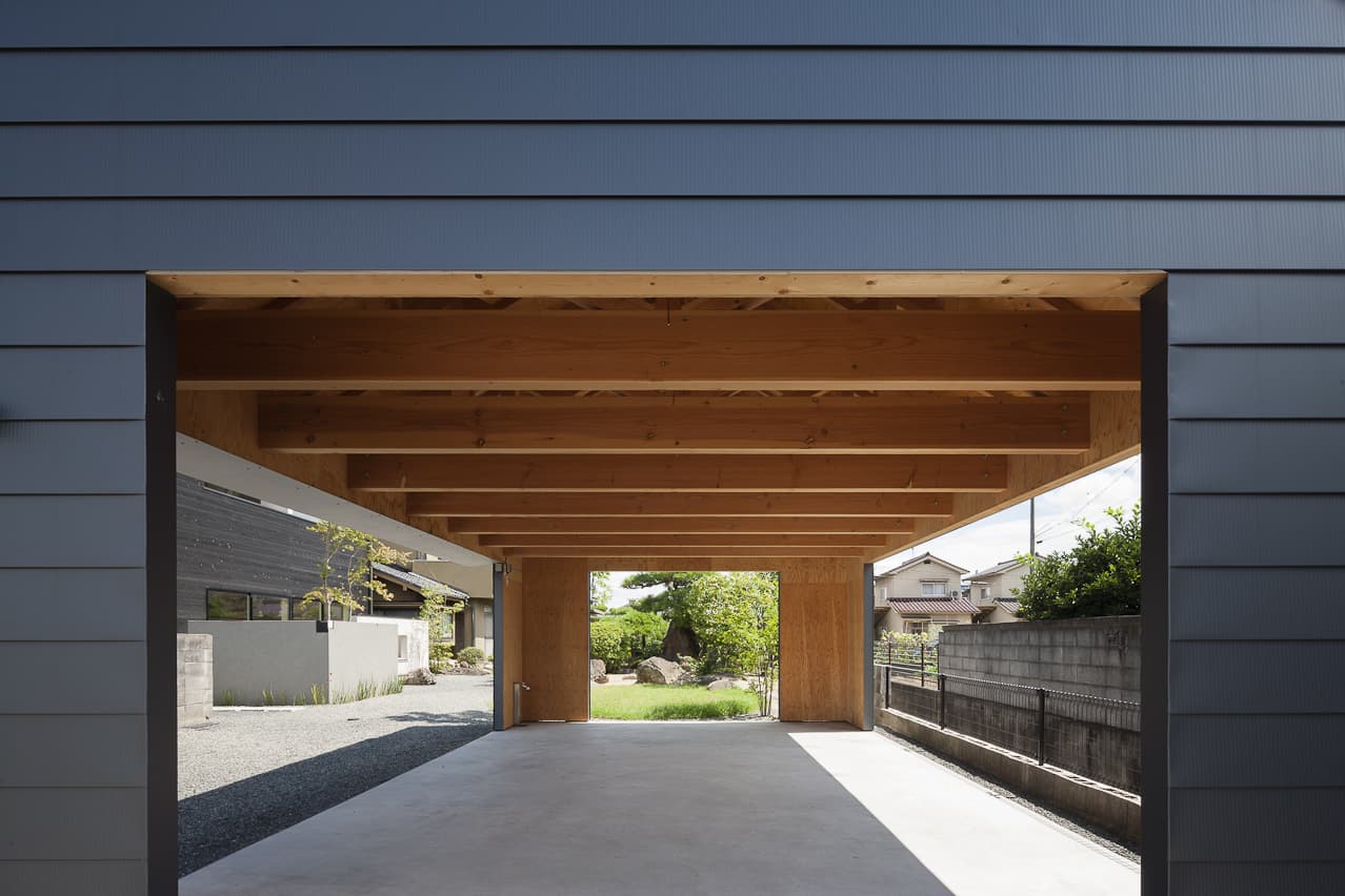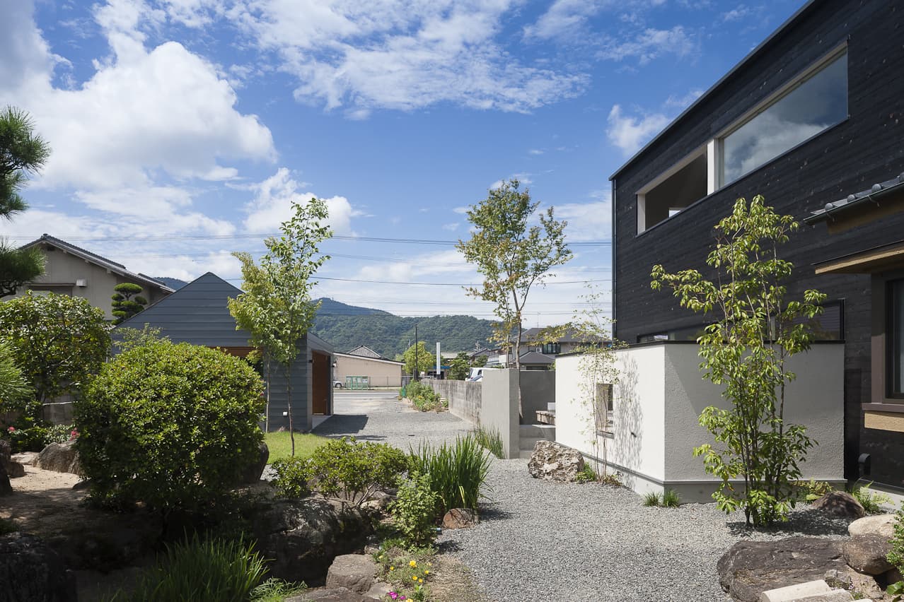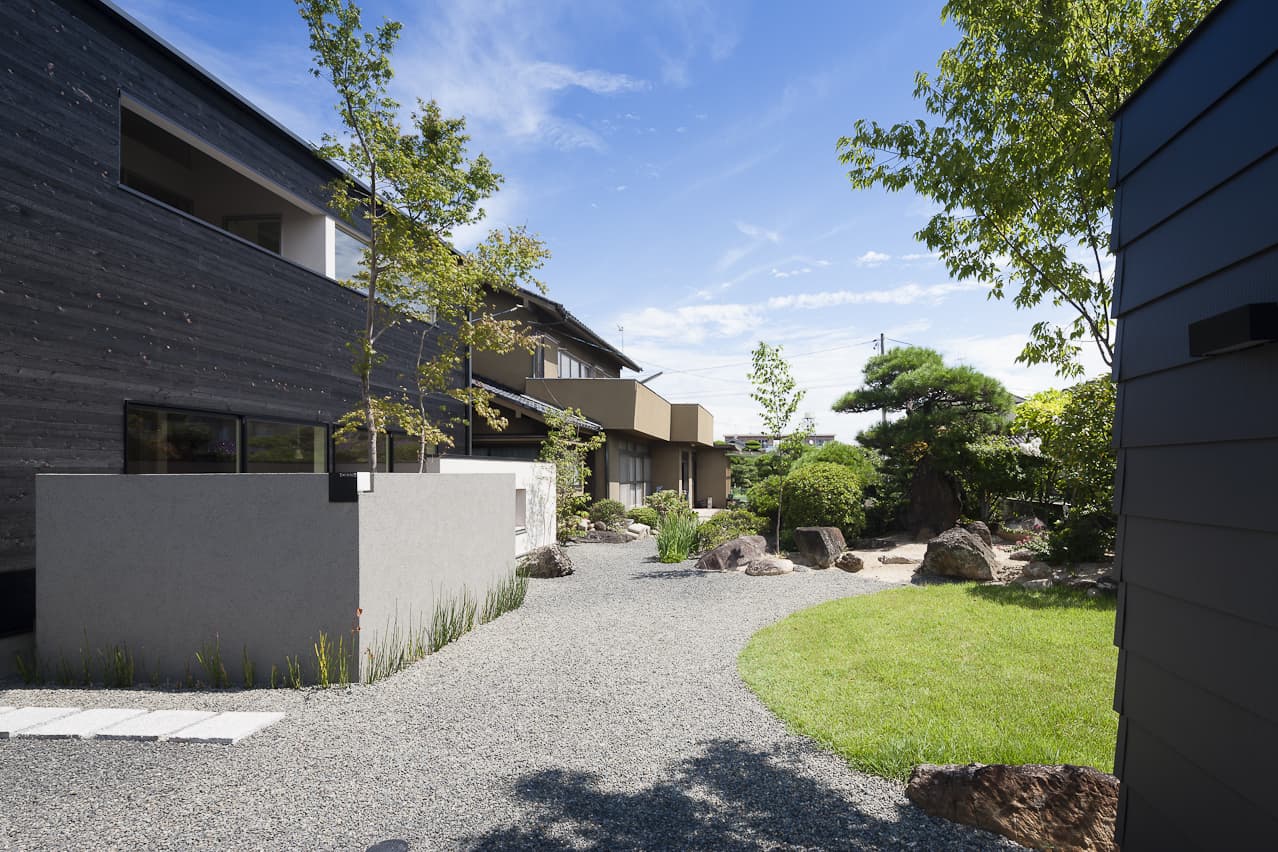 入り組んだ旗状区画の市街地に、親世帯と並んで建つ子世帯のコンパクトな住宅とガレージです。鱗状の表面をした焼杉の、マットブラックな外壁には、庭の緑がみずみずしく映え、歴史を重ねた母屋と心地よいハーモニーを奏でます。母屋の築山とガレージの間に、子世帯の庭を設け、棟の間を走り回る子供達が、世代間の交流をもたらします。