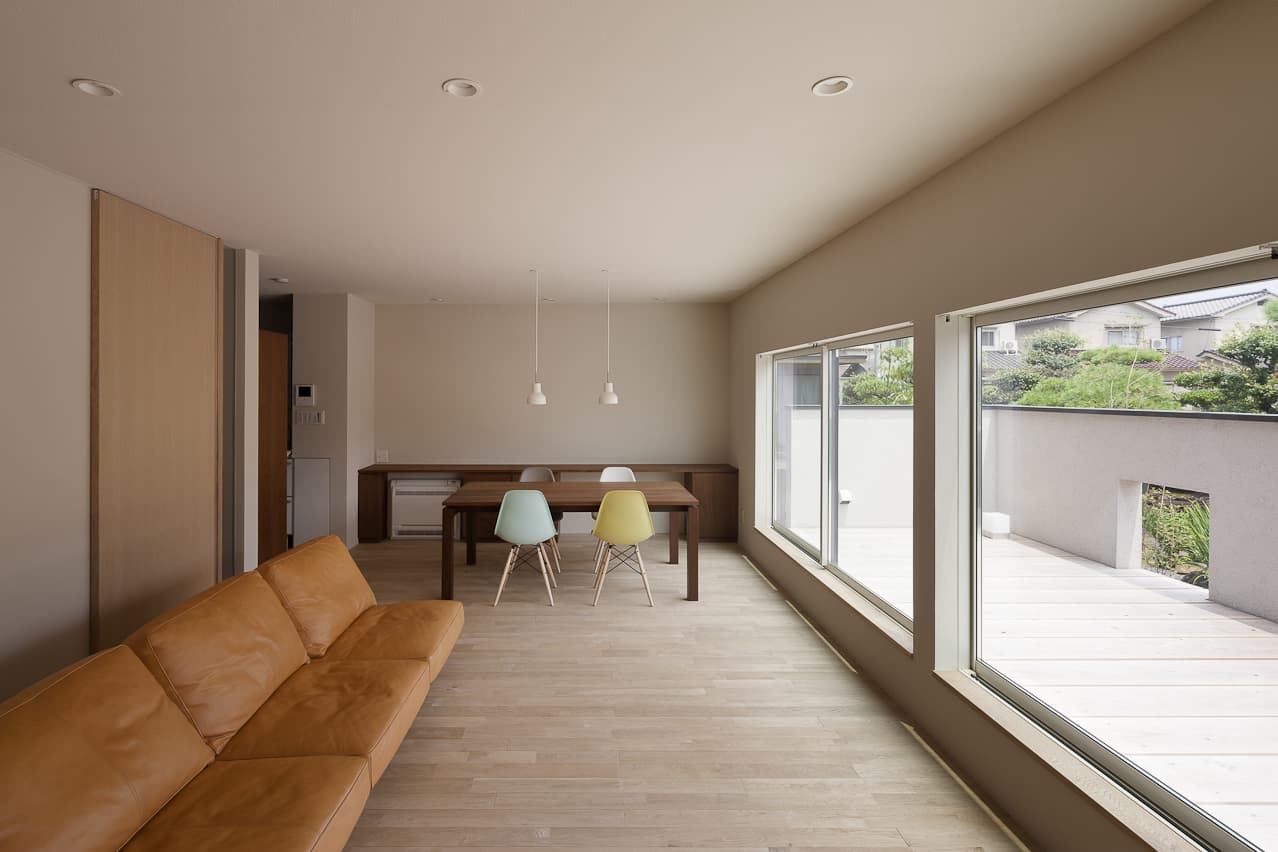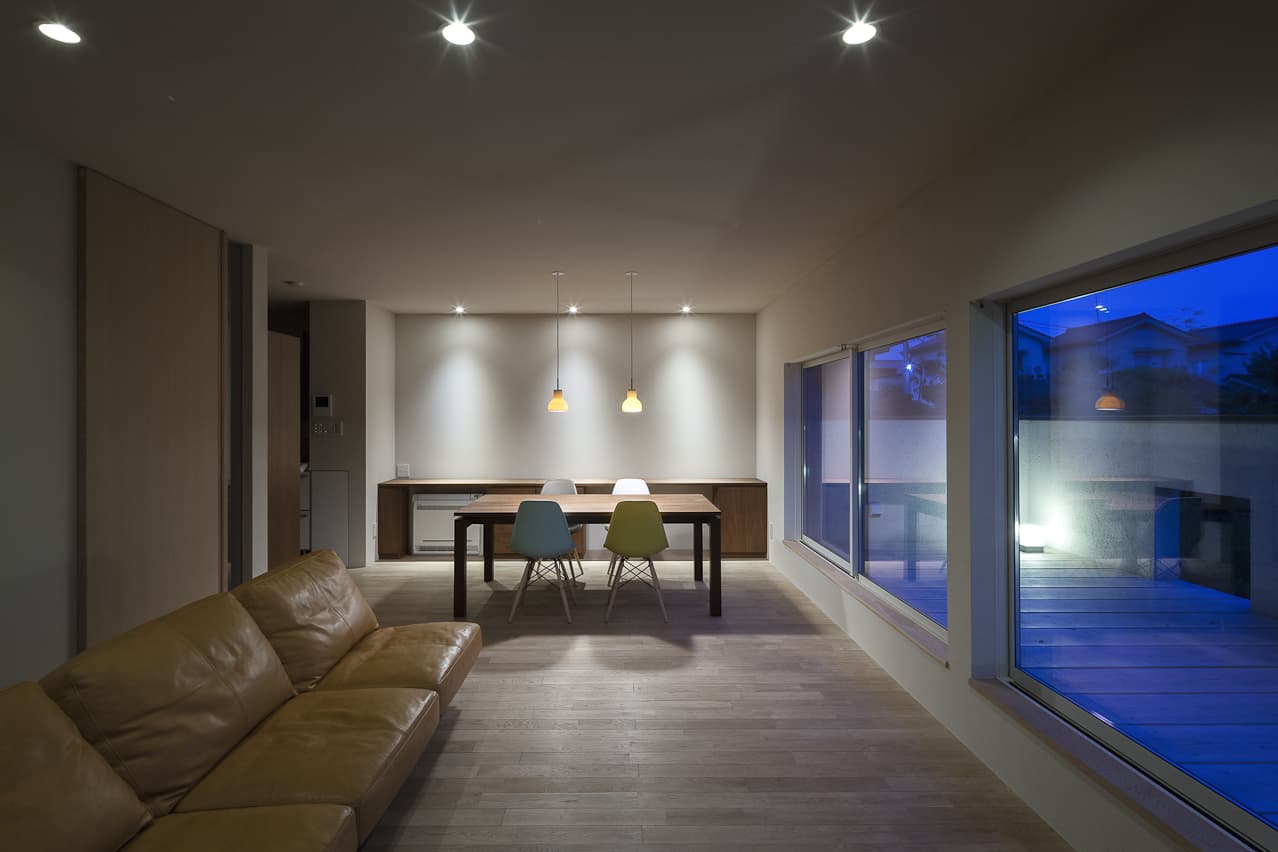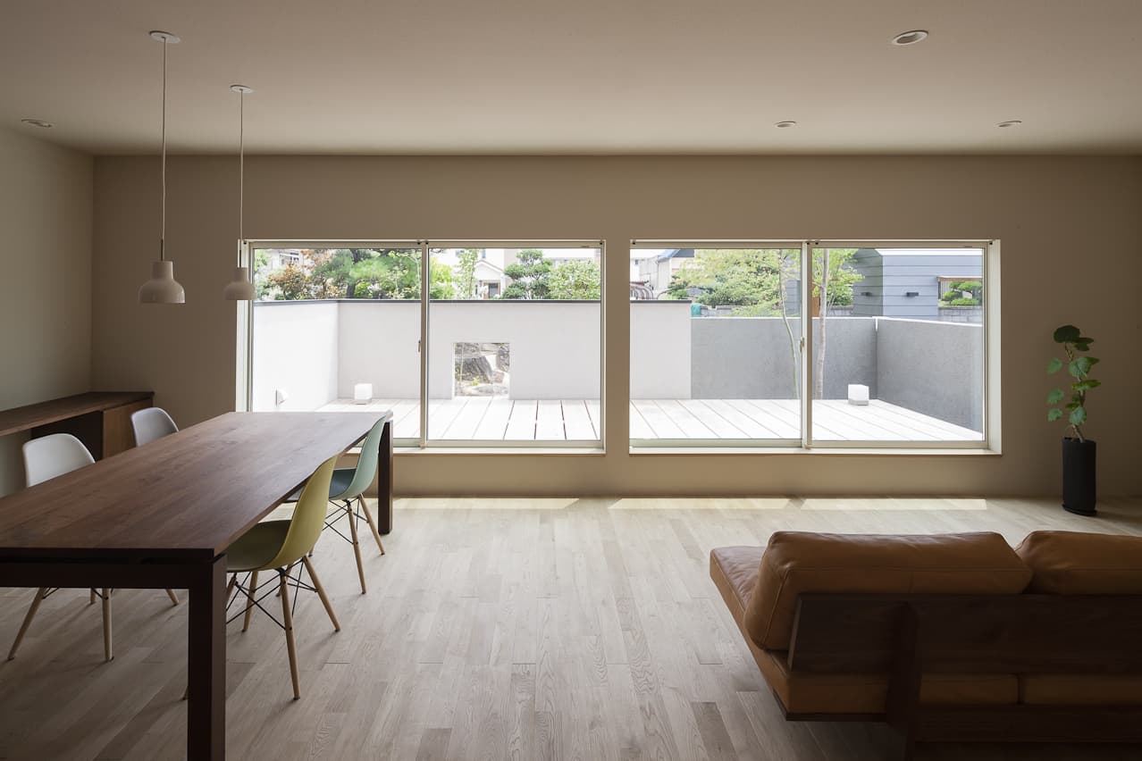 入り組んだ旗状区画の市街地に、親世帯と並んで建つ子世帯のコンパクトな住宅とガレージです。鱗状の表面をした焼杉の、マットブラックな外壁には、庭の緑がみずみずしく映え、歴史を重ねた母屋と心地よいハーモニーを奏でます。母屋の築山とガレージの間に、子世帯の庭を設け、棟の間を走り回る子供達が、世代間の交流をもたらします。