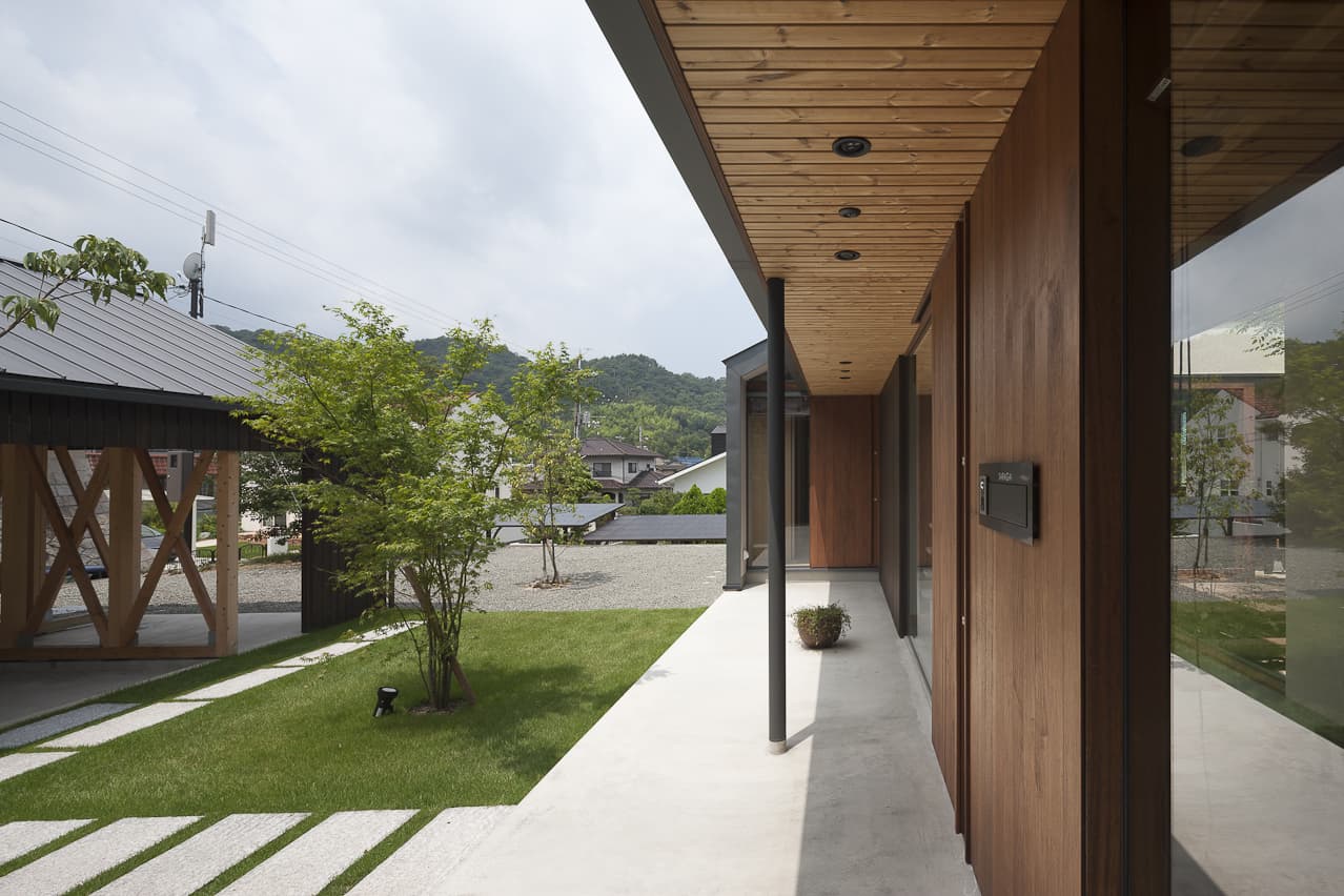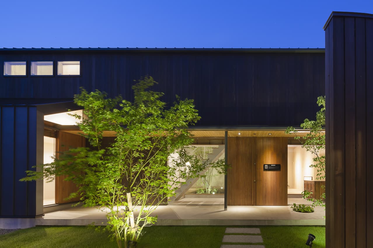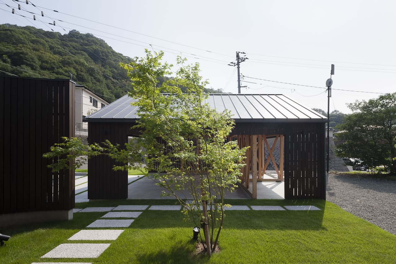分棟に並び建つガレージと住宅。背後の山から飛来する広葉樹の種子が芽吹き、やがて木立に包まれていく計画です。住宅の中庭にはプライベートな中庭があり、暮らしの中に周囲の自然が混ざり合う住宅です。
