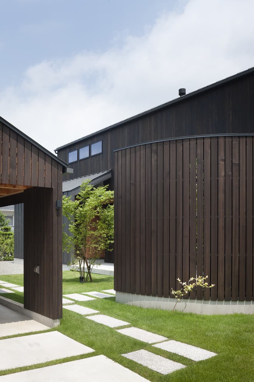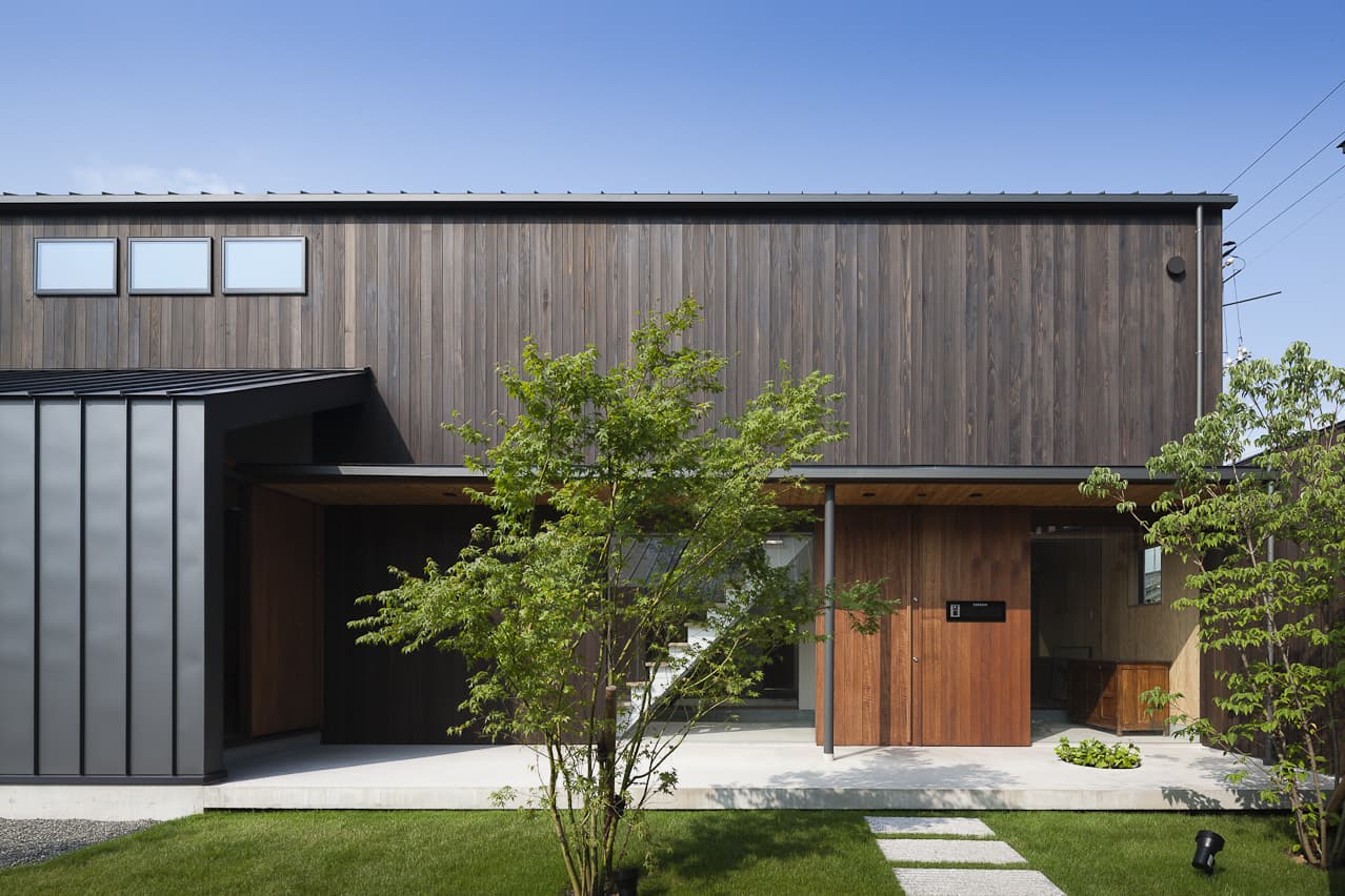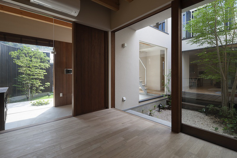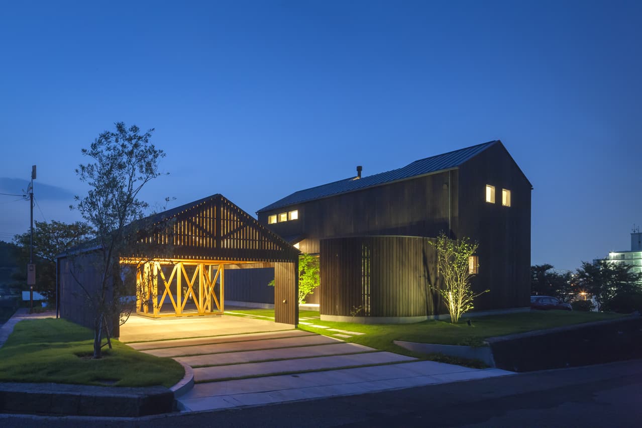 分棟に並び建つガレージと住宅。背後の山から飛来する広葉樹の種子が芽吹き、やがて木立に包まれていく計画です。住宅の中庭にはプライベートな中庭があり、暮らしの中に周囲の自然が混ざり合う住宅です。