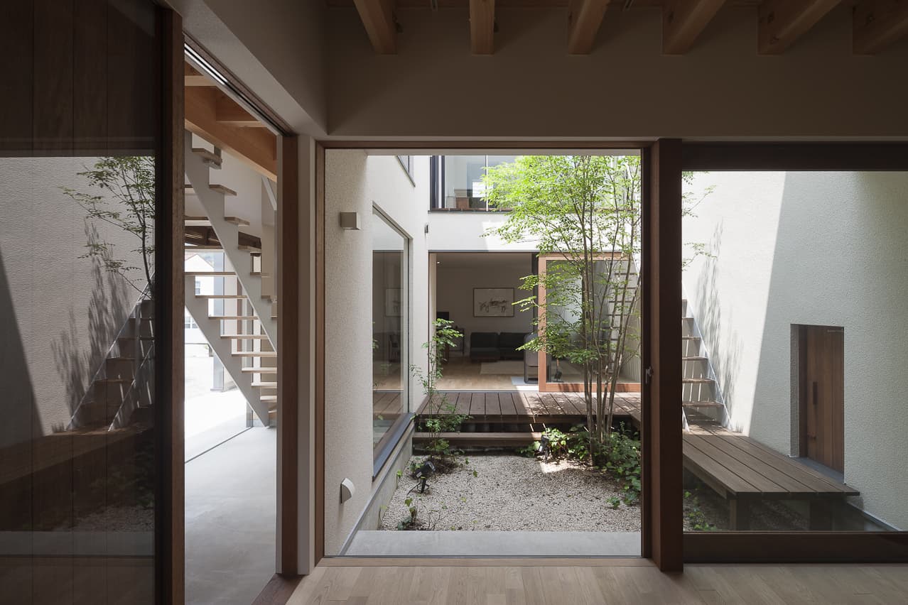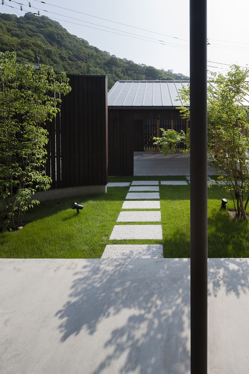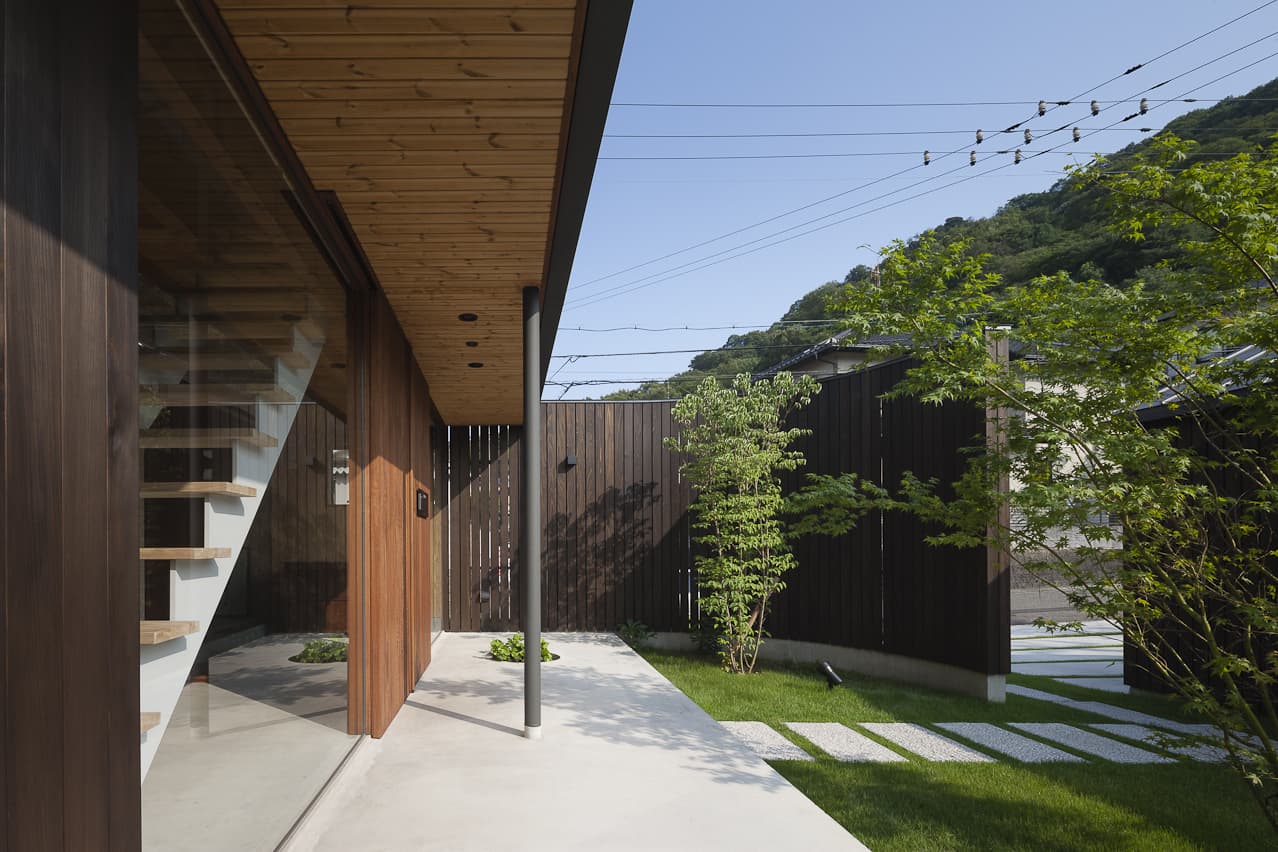 道路との境界はなく、段差と引きのある外構が心理的な結界となっている。