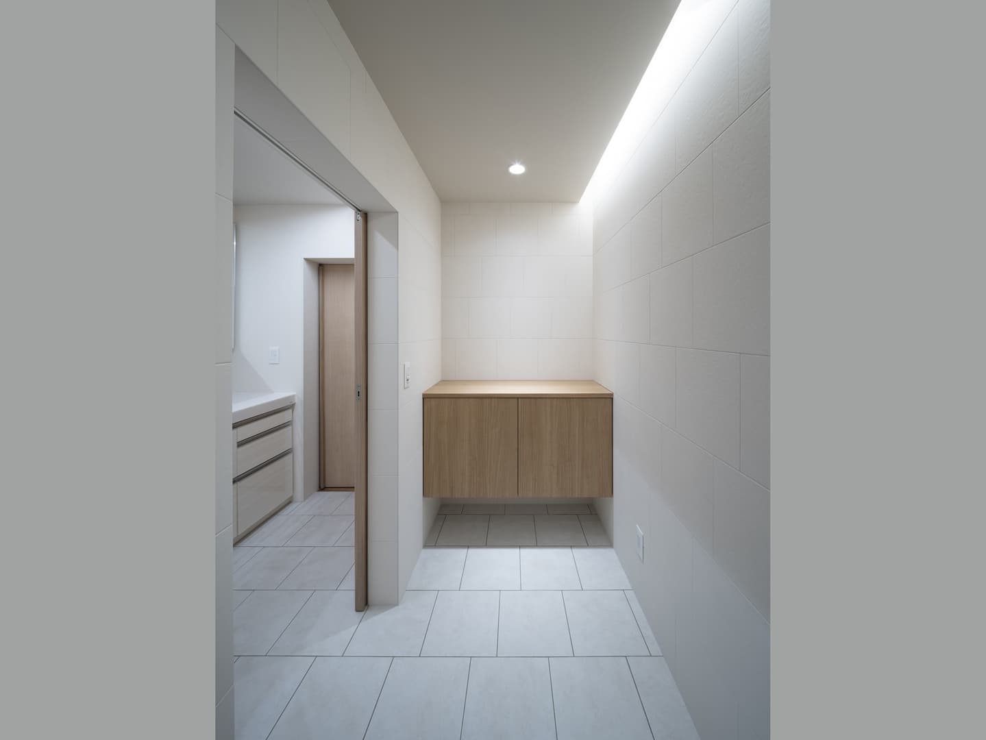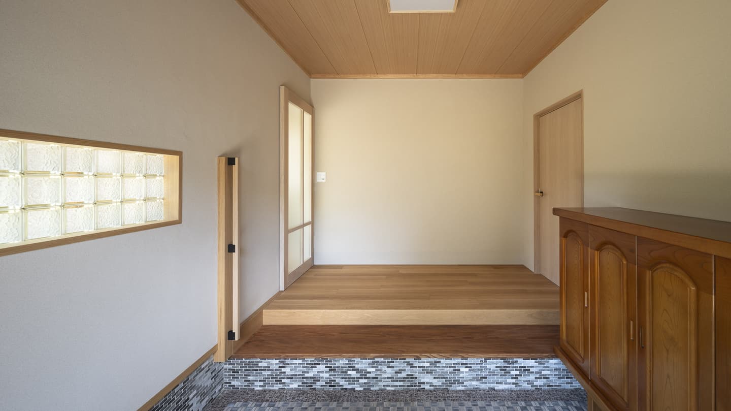 玄関は既存の床タイルやガラスブロック、下駄箱や敷台をそのままにして、正面に耐力壁を新設。老後に備えた手すりはオリジナルです。左手の引き戸から広縁へとつながります。