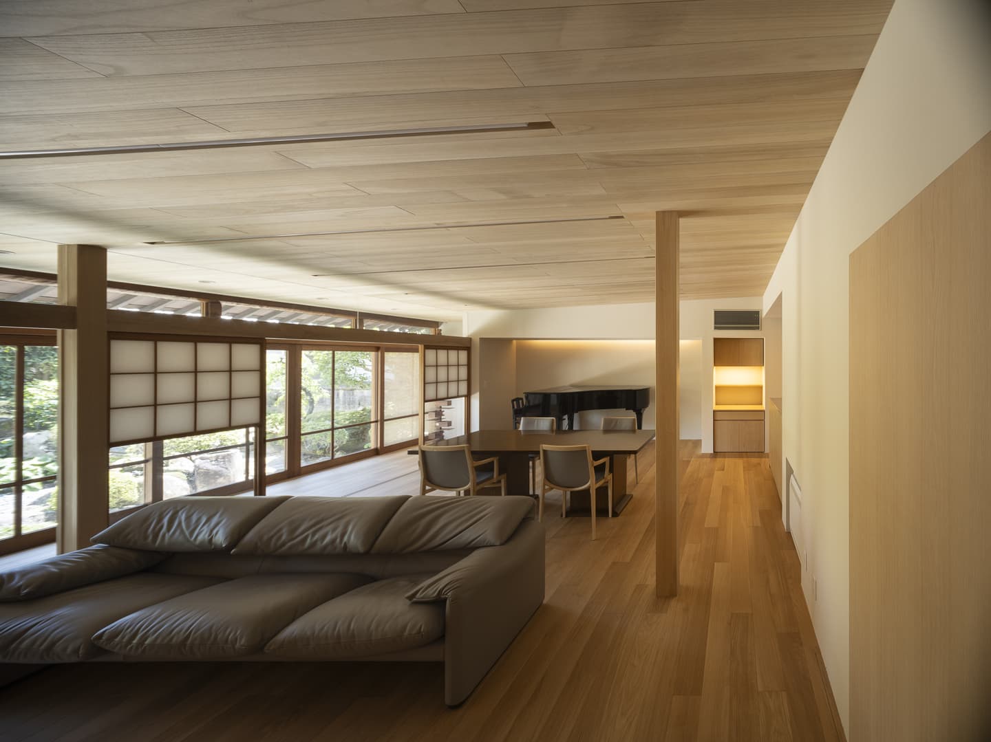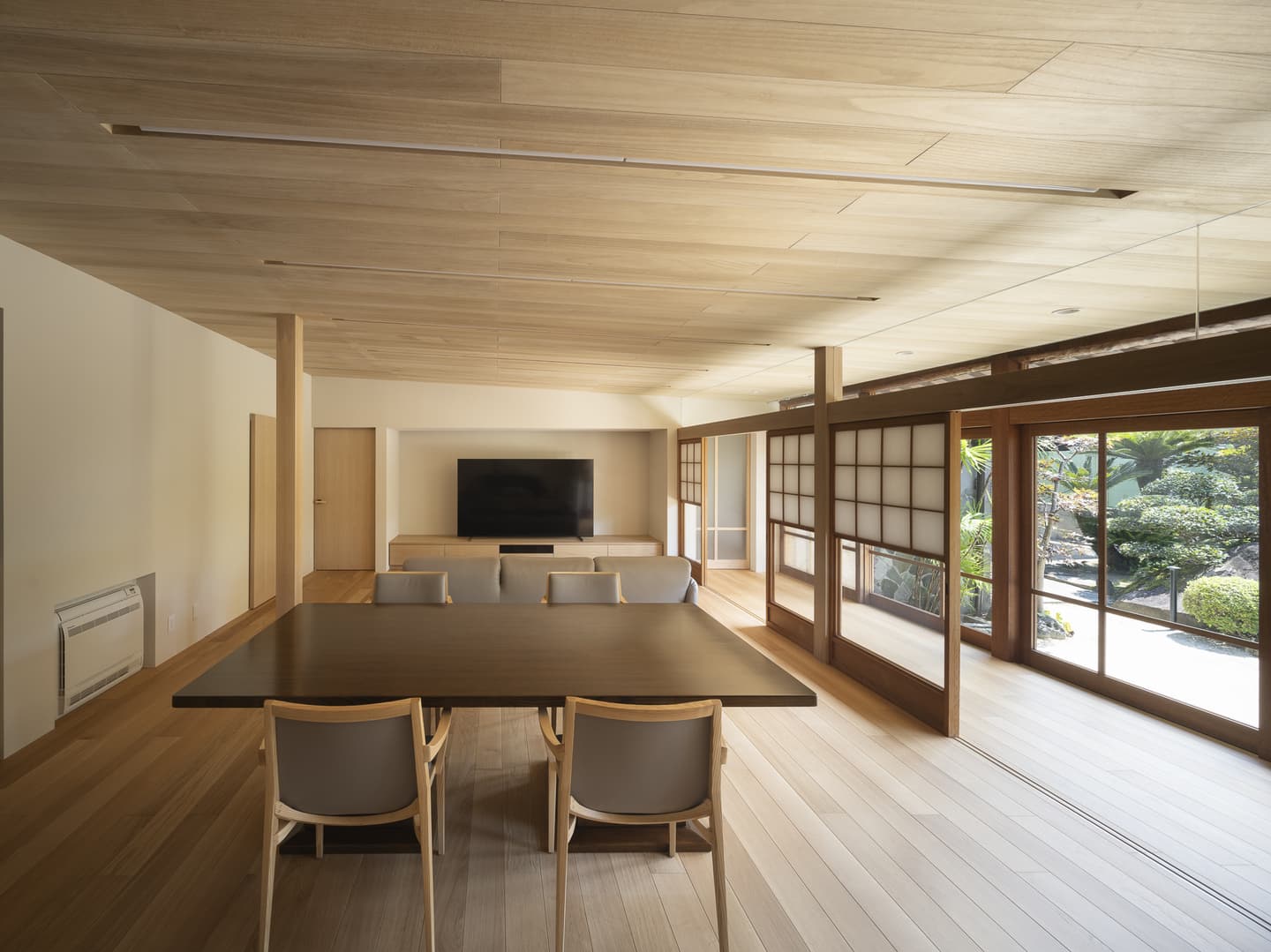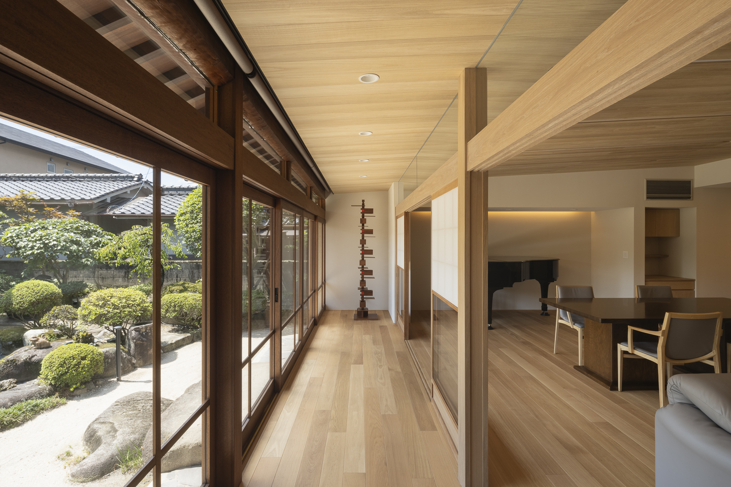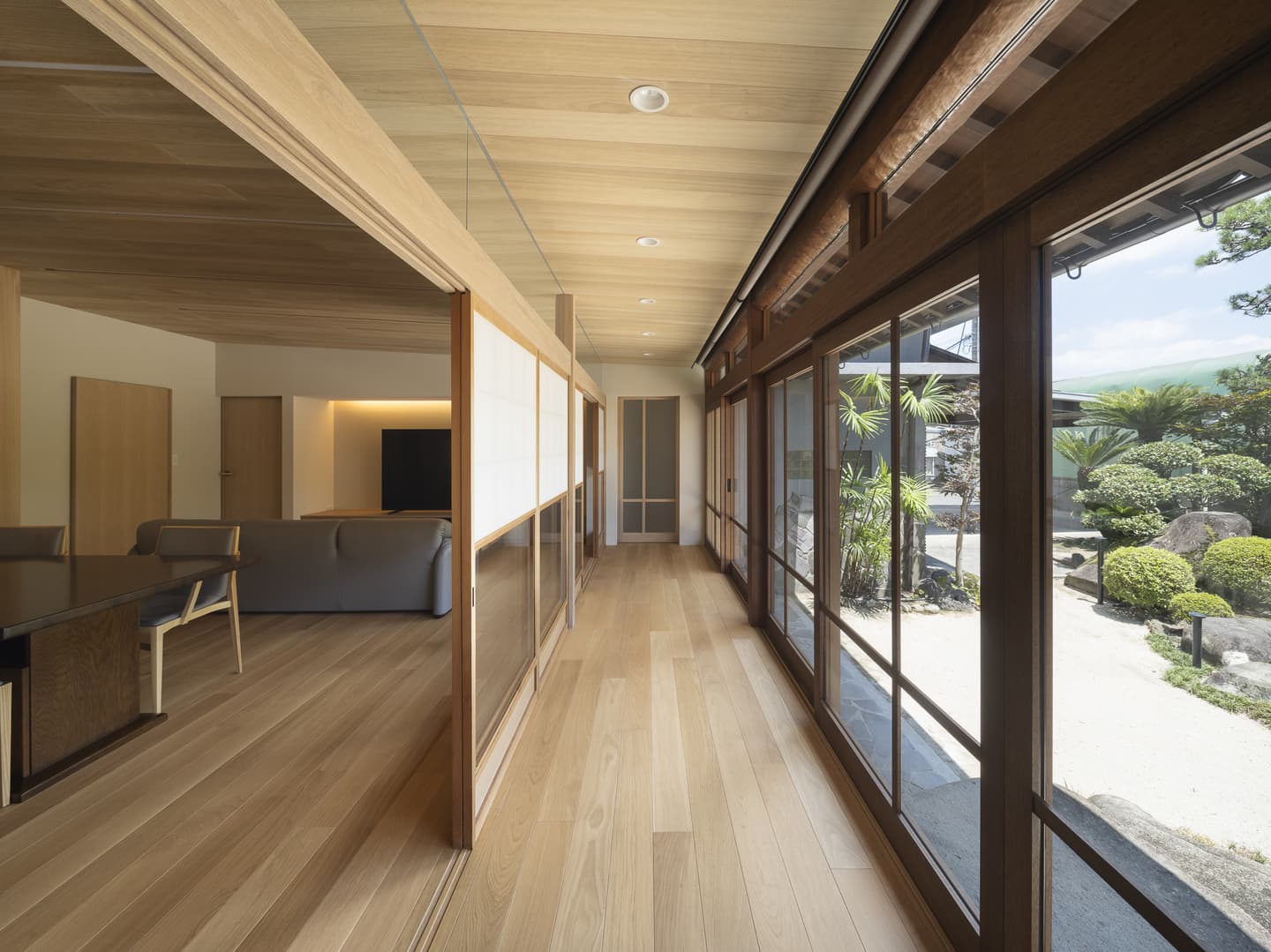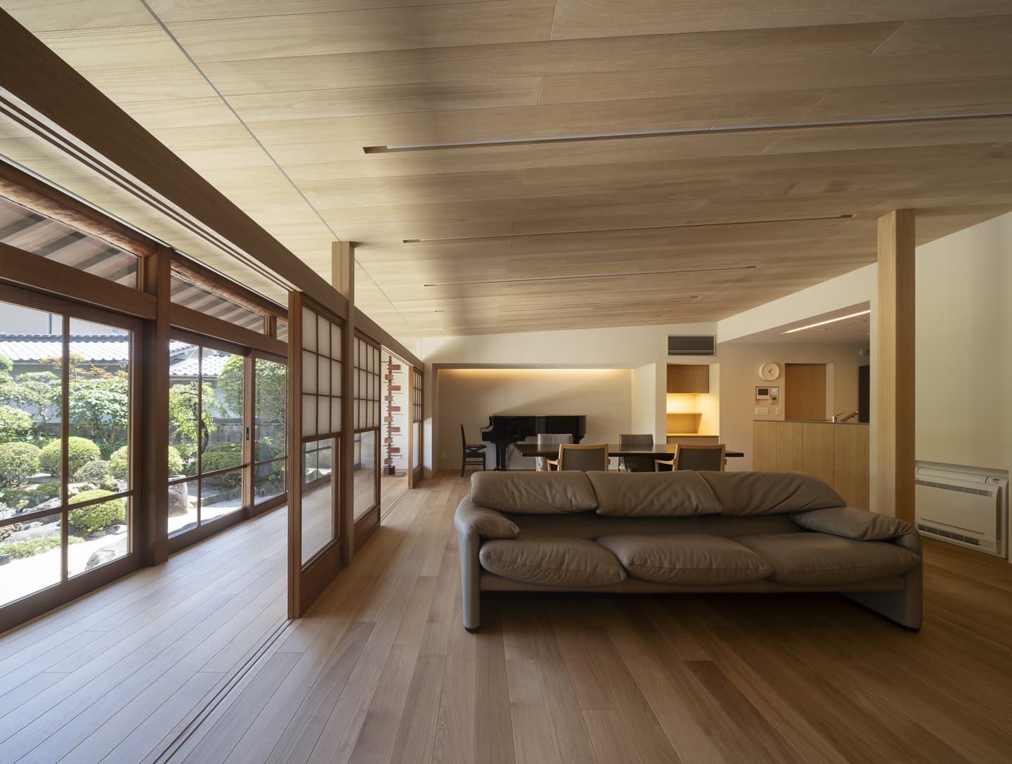 広縁を経由するLDKは開け放てば庭とつながります。既存の雪見障子を残しながら、欄間をガラスに変更。元は三つの和室だった内部は、欄間ごと間仕切りを取り除き連続感のある一つの大きな空間にしています。