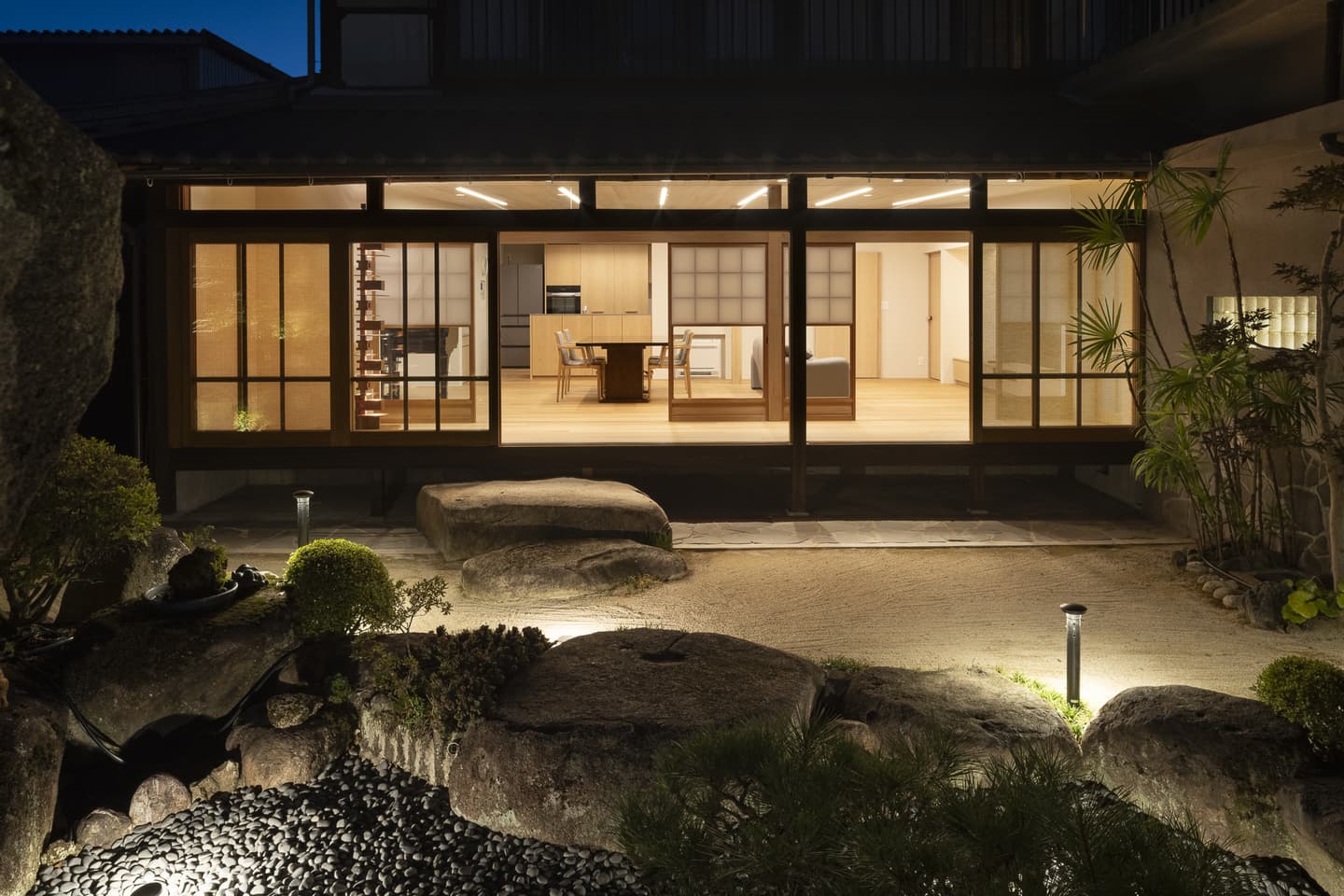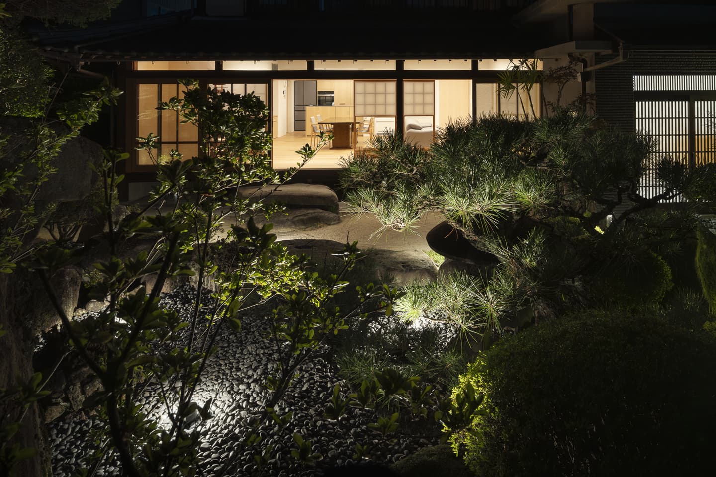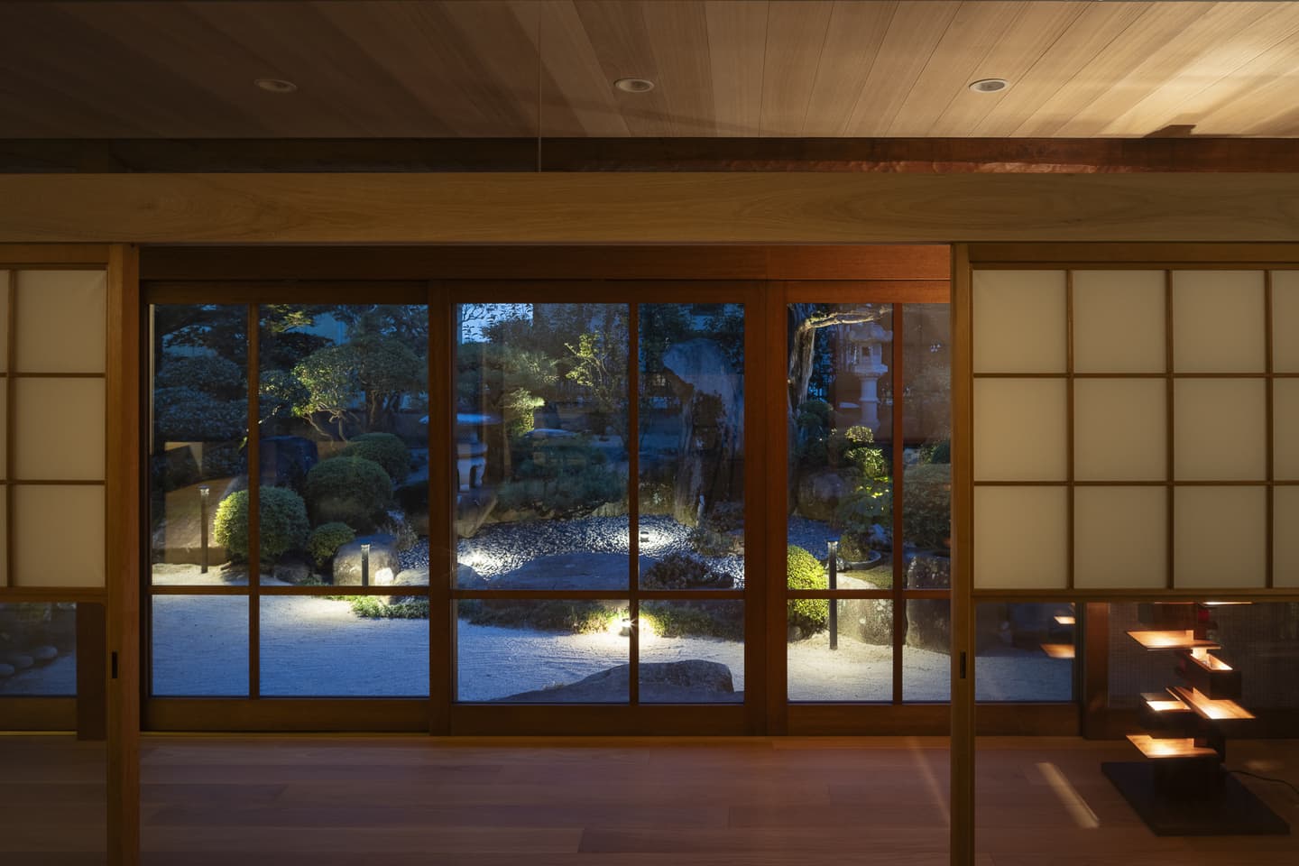 夜を過ごす時間も大切に考えて、広縁を通して庭とつながるライティング計画にしました。ベース照明は天井のスリットに埋め込み、調光を最大にすると平均照度526lx確保できます。