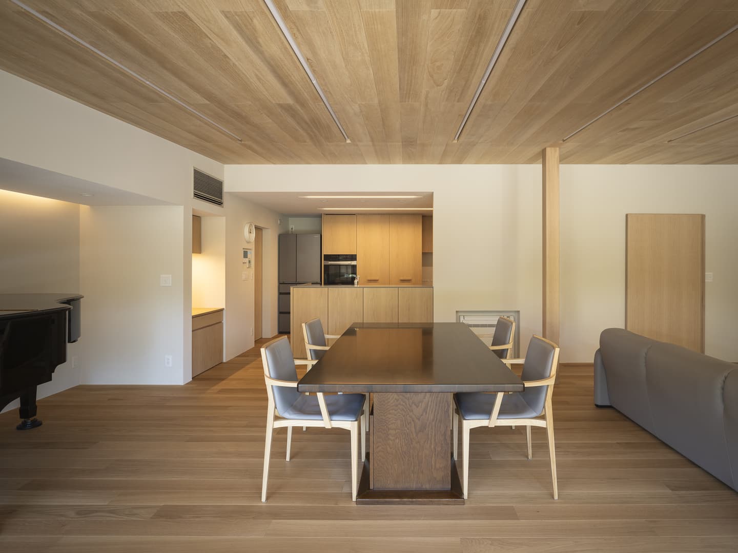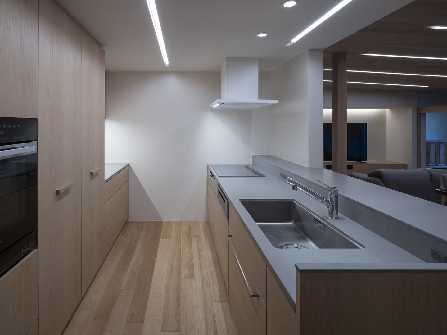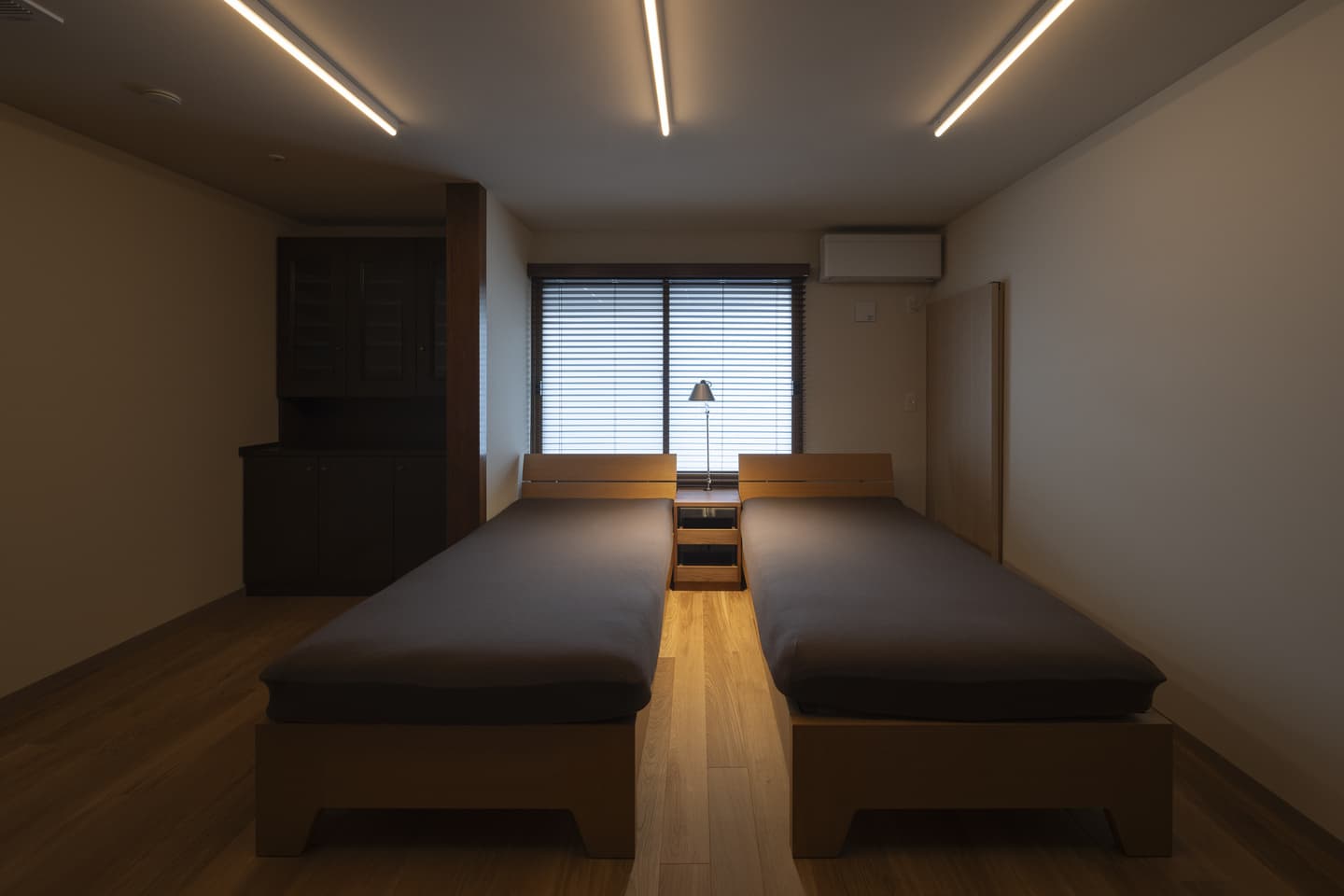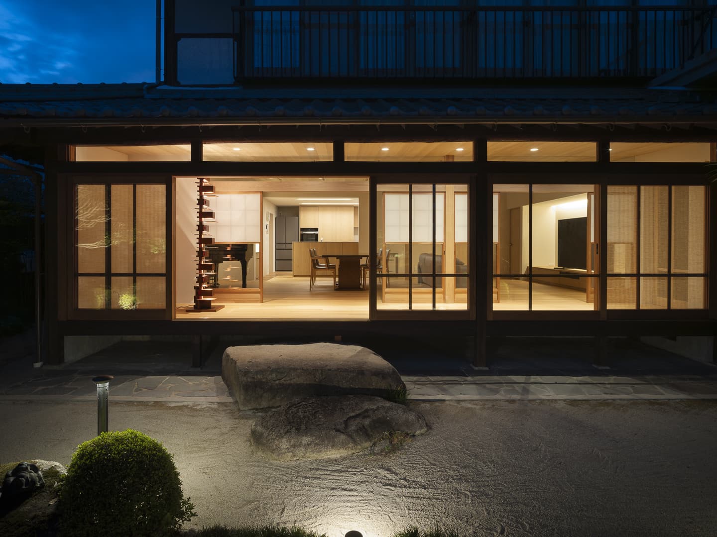 夜を過ごす時間も大切に考えて、広縁を通して庭とつながるライティング計画にしました。ベース照明は天井のスリットに埋め込み、調光を最大にすると平均照度526lx確保できます。