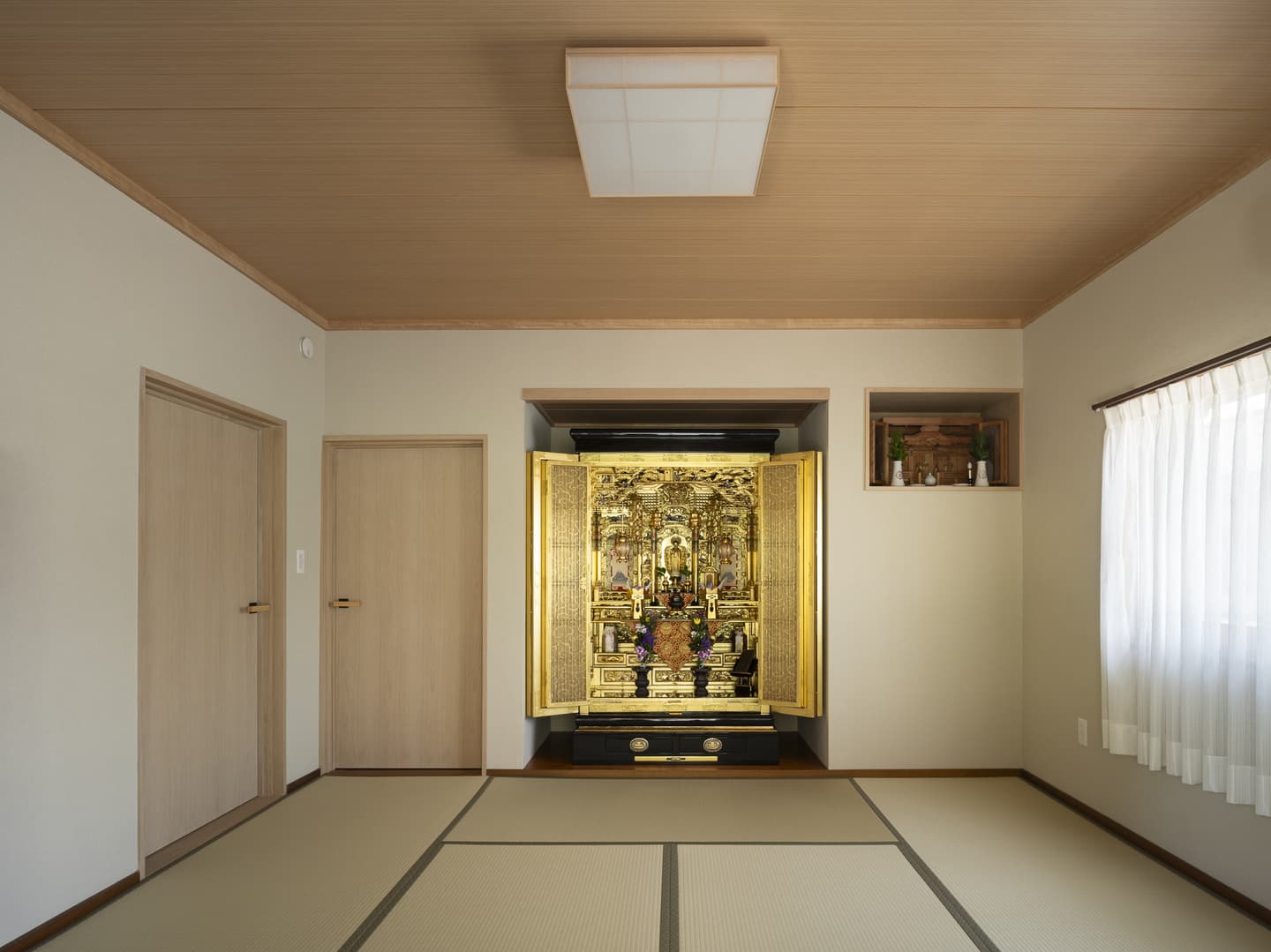 LDK以外は最小限の変更に抑え、仏間は神棚と合わせて一部屋にしました。寝室にはスタンドを設置できるテーブルを設け、トイレは間接照明で明るくしました。