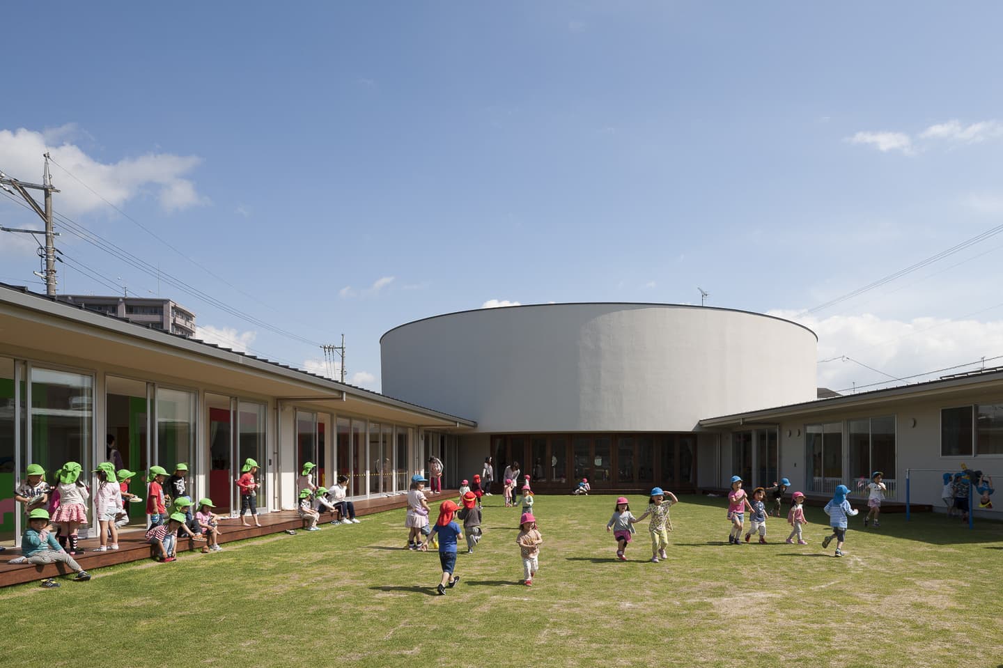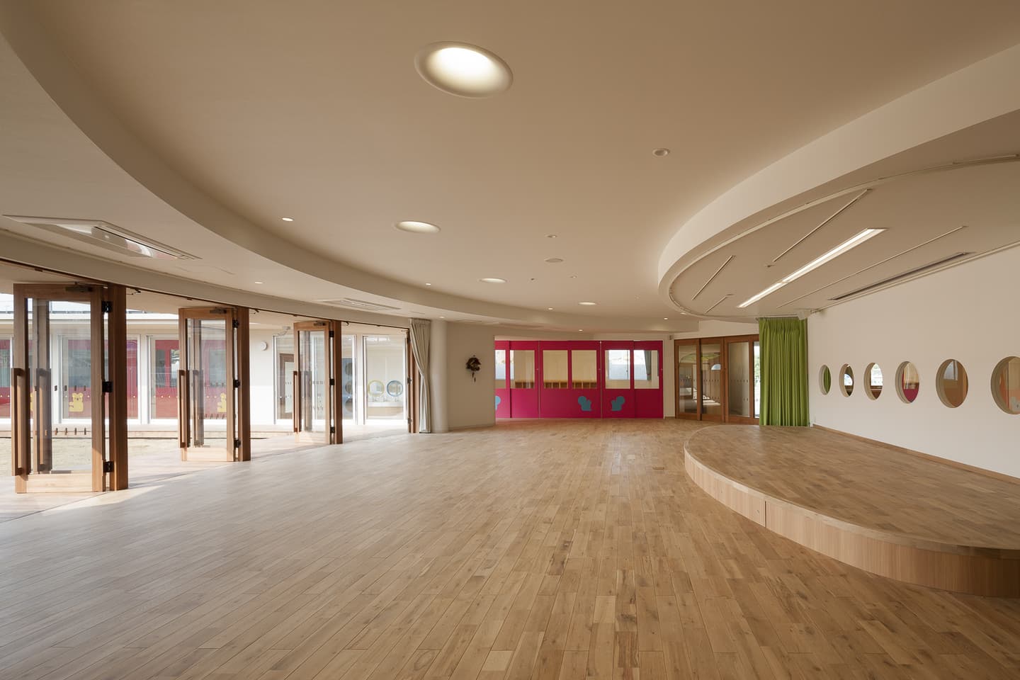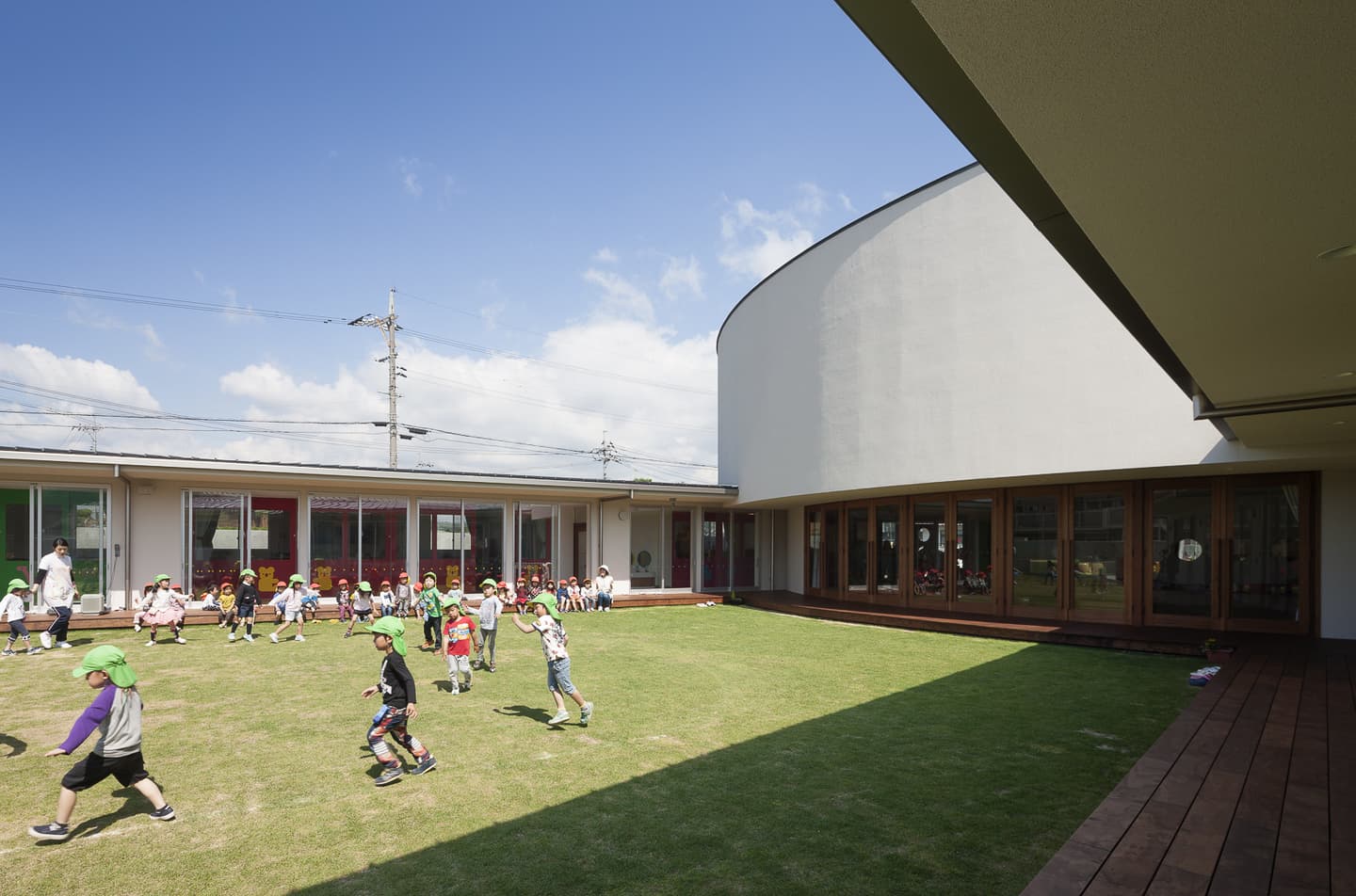 建物の配置は敷地形状にあわせて円形のホール棟と、V字型に広がる低層の保育棟で構成されています。玄関からすぐにホールに入り、そこからそれぞれの保育室へと分岐していく動線が特徴です。一般的には行事の時しか使用されない遊戯室兼ホールが、日常の活動の全ての中心としてフル活用されています。V字型に配置された低層棟には園庭に面して軒の深いデッキを設け、外廊下や運動会の観客席として利用されています。海が近いこともあり、津波を想定して園庭南側の塀は松永湾からの漂流物を堰き止めるために2mの塀を設置しました。園舎の被害を最小限にとどめるための対策です。