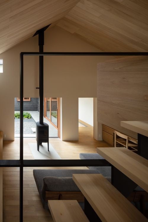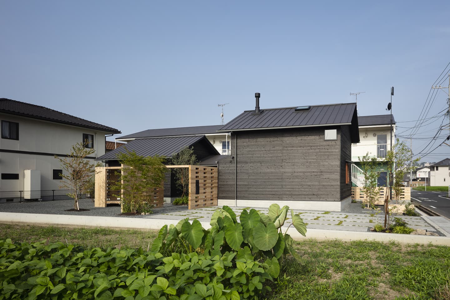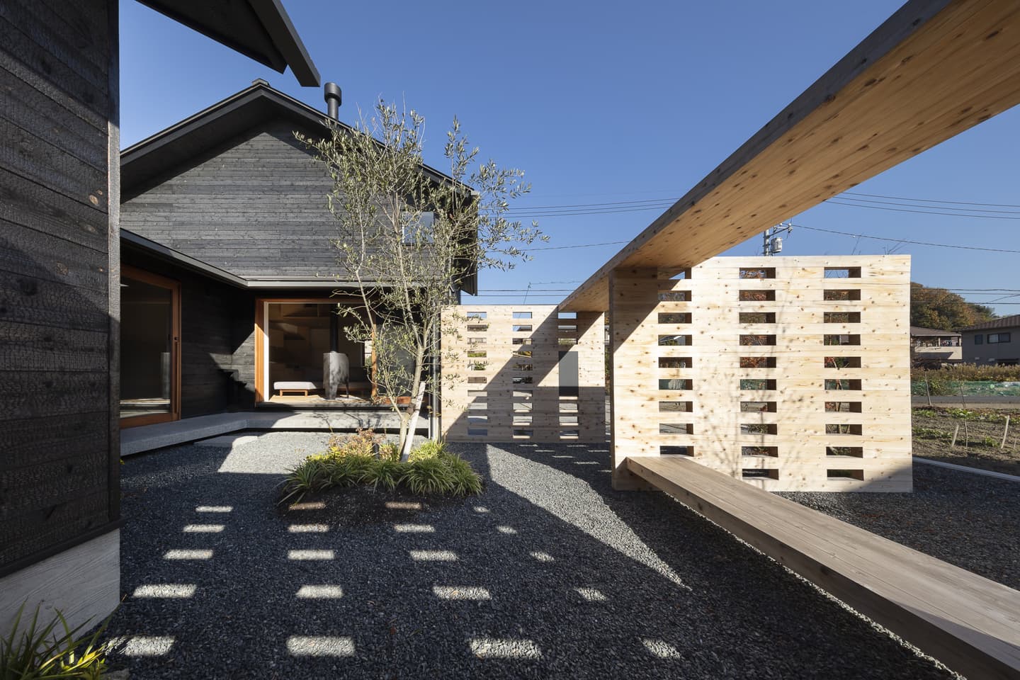 両親が耕す畑に隣接した敷地に建つ、コンパクトな住宅です。住まいと畑の間にの作業の合間に対話が生まれる屋外の居場所を設けて「畑の間」と名付けました。そこには天蓋付きのベンチがあり、畑と家を繋ぐ庭でありながら、「屋外の部屋」でもあります。「畑の間」を中心に、ロフト付きのLDKと、バスルーム付きの寝室が向かい合う配置で、屋内空間を限りなくコンパクトにした最小限の住宅です。ロフトを子供部屋として利用することで、延床面積を小さくすることができ、屋外空間を豊かにすることができました。