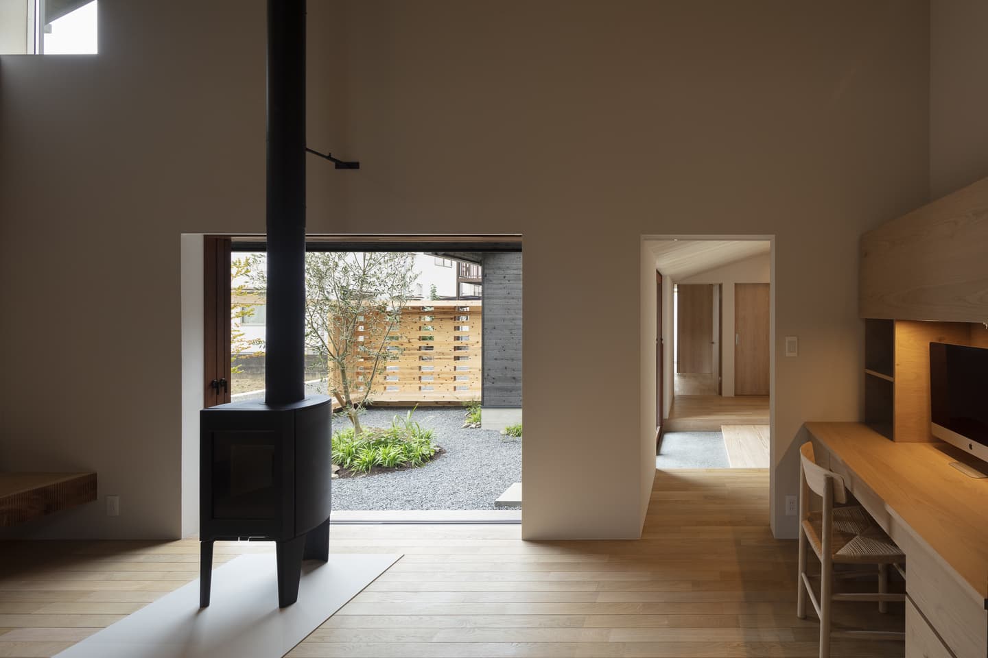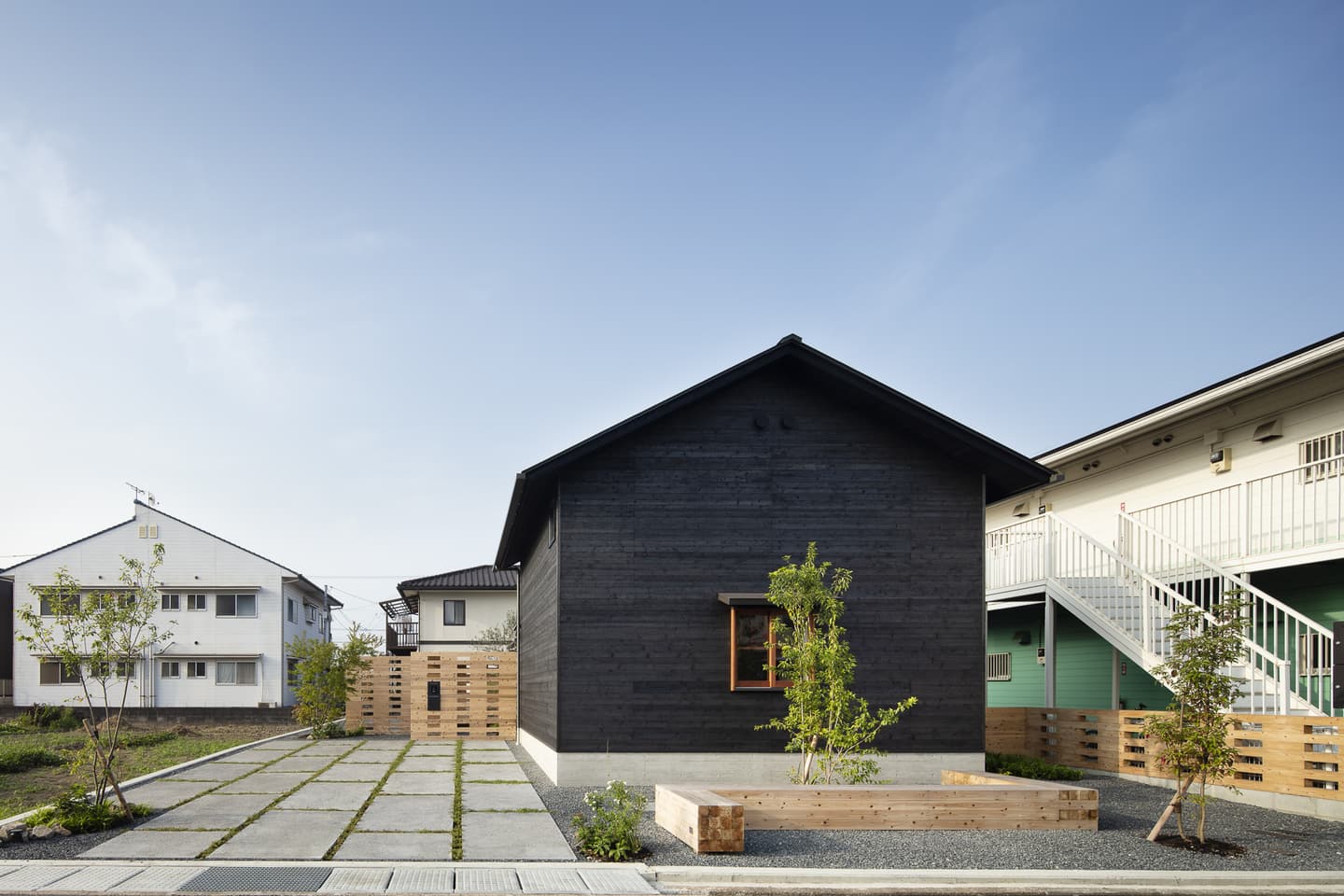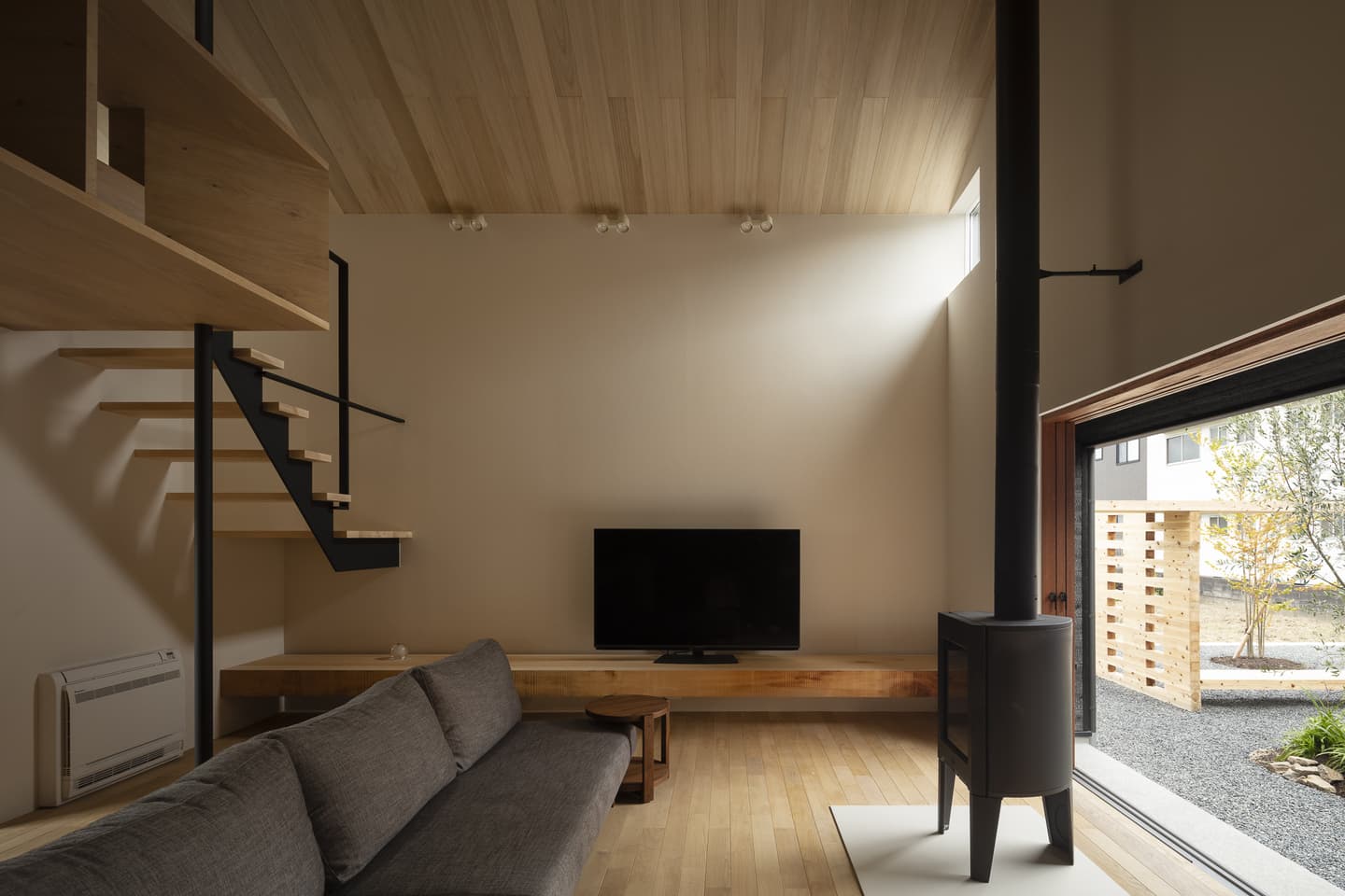 両親が耕す畑に隣接した敷地に建つ、コンパクトな住宅です。住まいと畑の間にの作業の合間に対話が生まれる屋外の居場所を設けて「畑の間」と名付けました。そこには天蓋付きのベンチがあり、畑と家を繋ぐ庭でありながら、「屋外の部屋」でもあります。「畑の間」を中心に、ロフト付きのLDKと、バスルーム付きの寝室が向かい合う配置で、屋内空間を限りなくコンパクトにした最小限の住宅です。ロフトを子供部屋として利用することで、延床面積を小さくすることができ、屋外空間を豊かにすることができました。