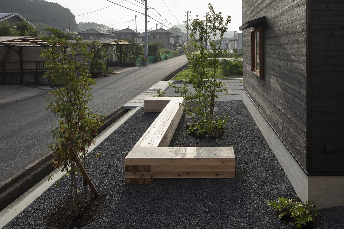 水路を挟んだ前面道路とは木の束で作ったベンチで領域を区切り、隣の畑とはゲートを兼ねた天蓋付きのベンチが両側からの居場所を作ります。