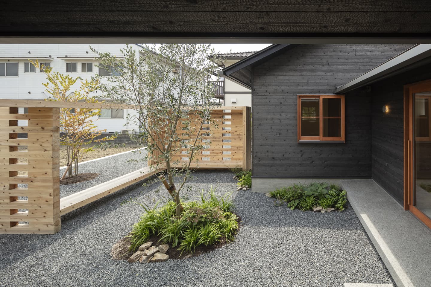 畑の間 と名付けた屋外の居場所は、畑からも室内からもつながる心地よい空間。玄関の前庭も兼ねているので、誰もがここを通って家に入ります。