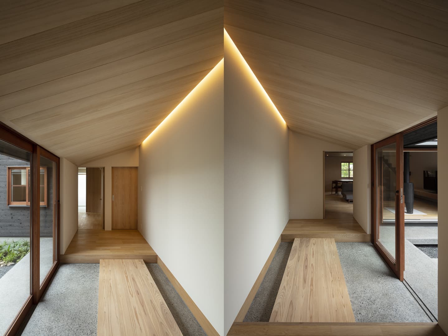 玄関が北側のパブリックゾーンと南側のプライベートゾーンを繋ぐ渡り廊下になります。床は100角の角材を繋ぎ合わせた板を置いてあるだけで、廊下は左右に移動できます。