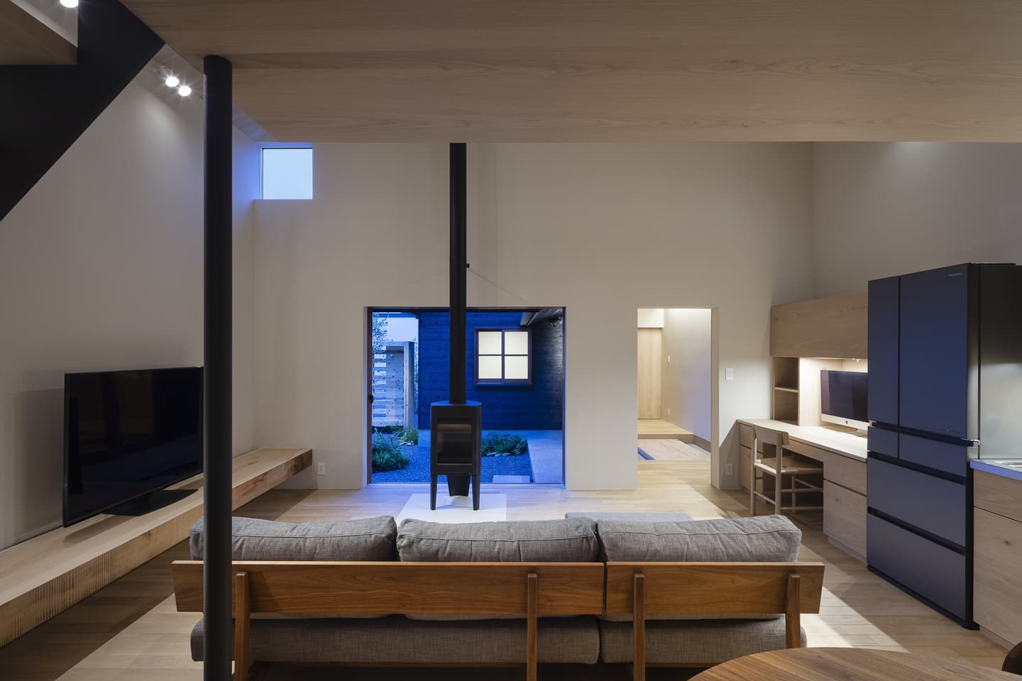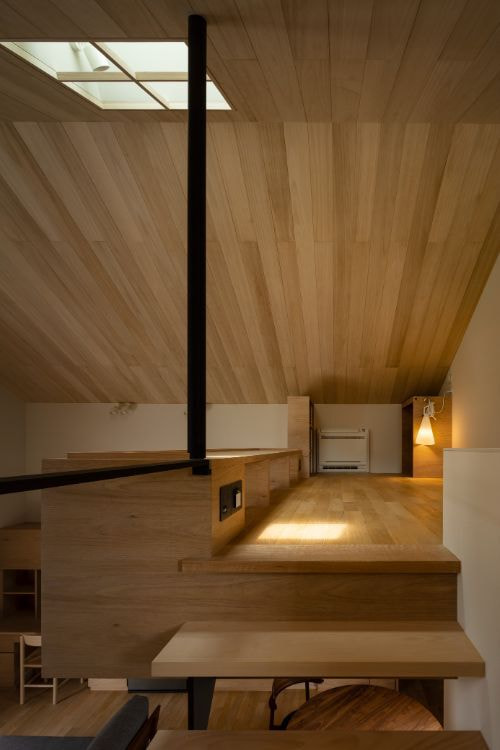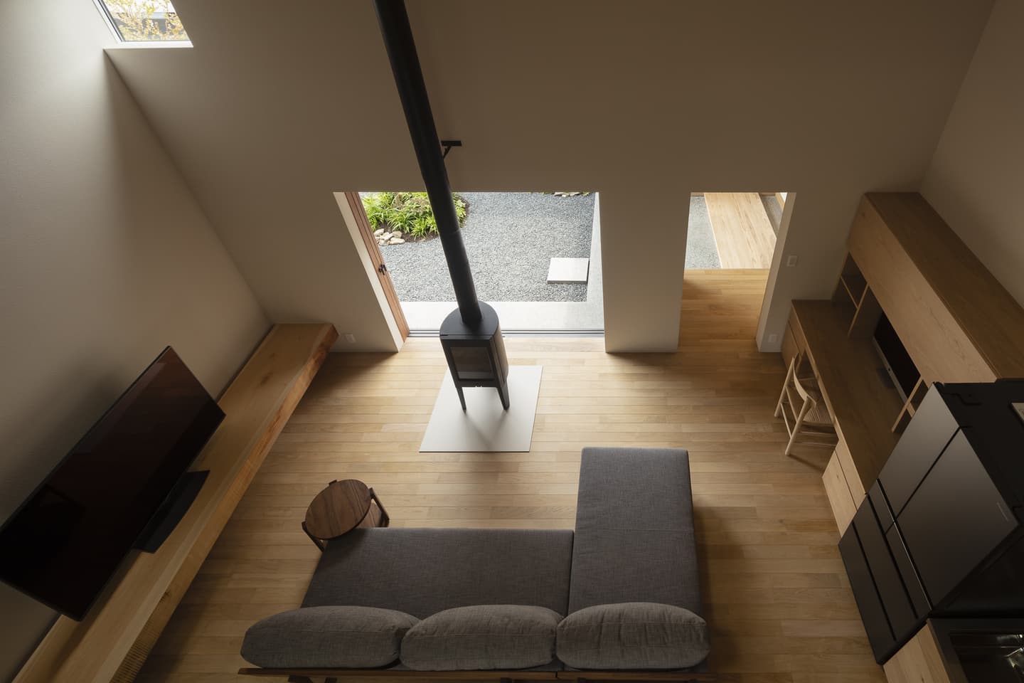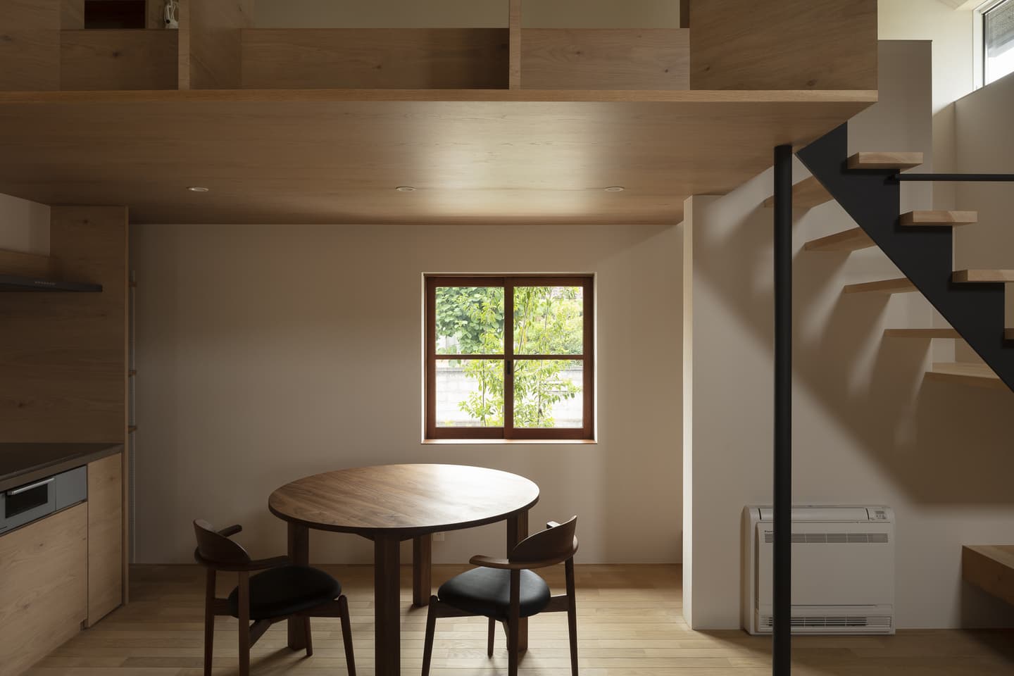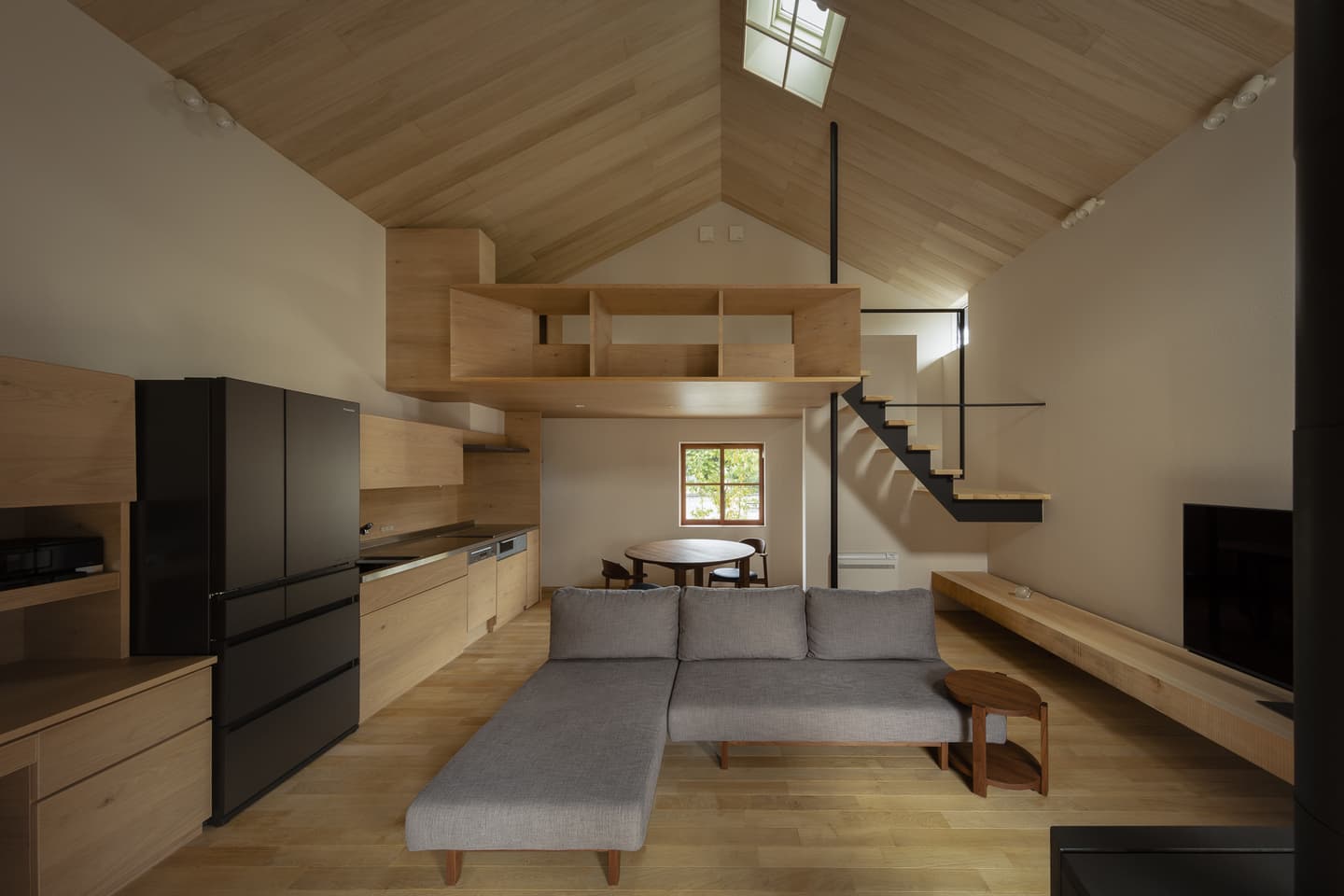 北側はワンボリュームのロフト付きLDK。子供部屋は設けず、ロフトが子供部屋を兼ねます。ダイニングの天井高を2100にして、床に座る机で宙に浮いた家具のようなロフトは、居場所の距離を近づけます。
