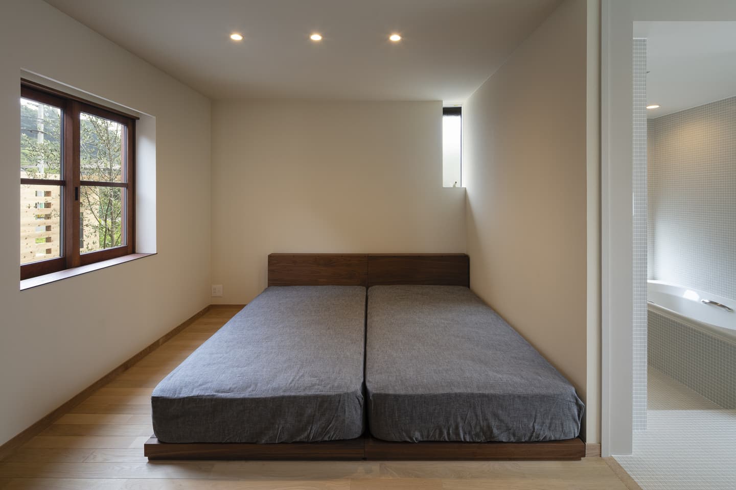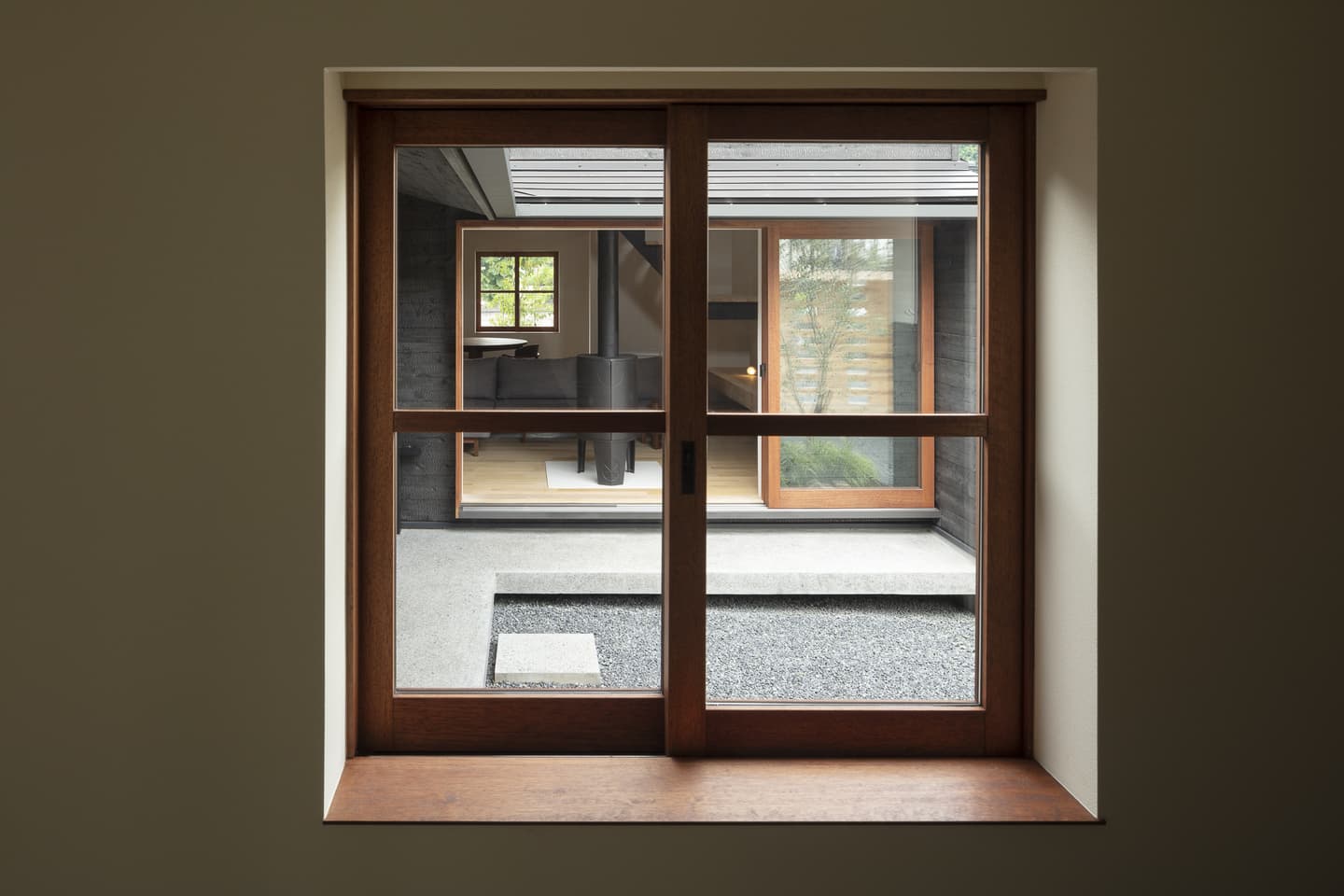 前庭越しに寝室の窓からは北側のLDKを超えて、道路の向かいの庭木まで見通すことができます。