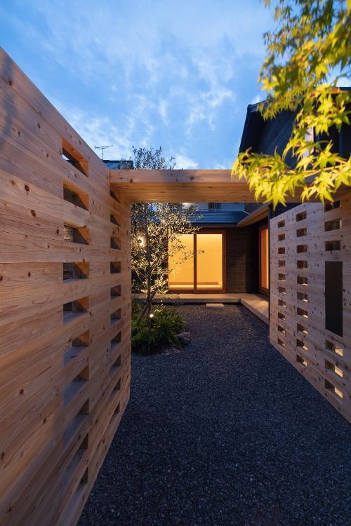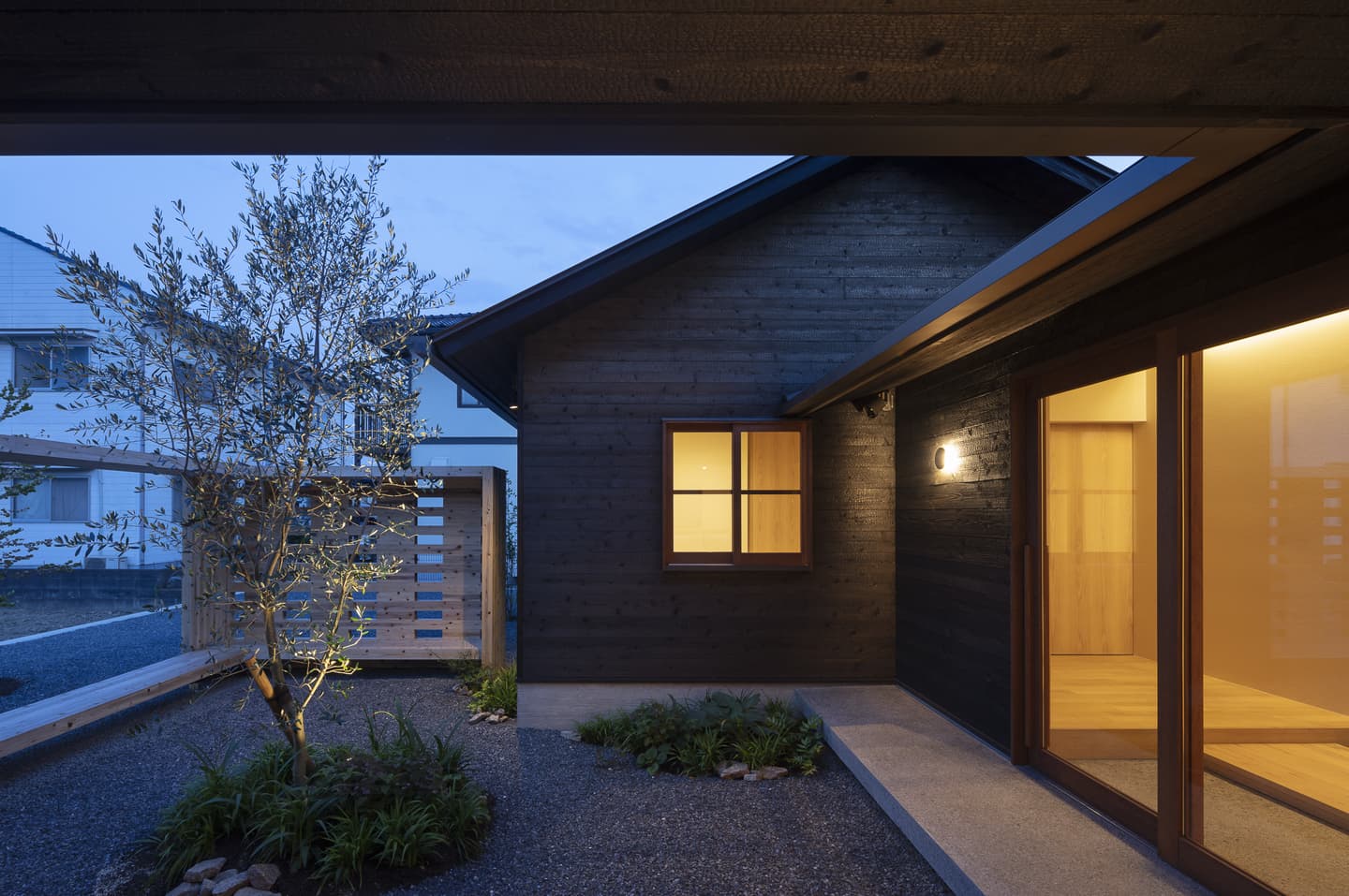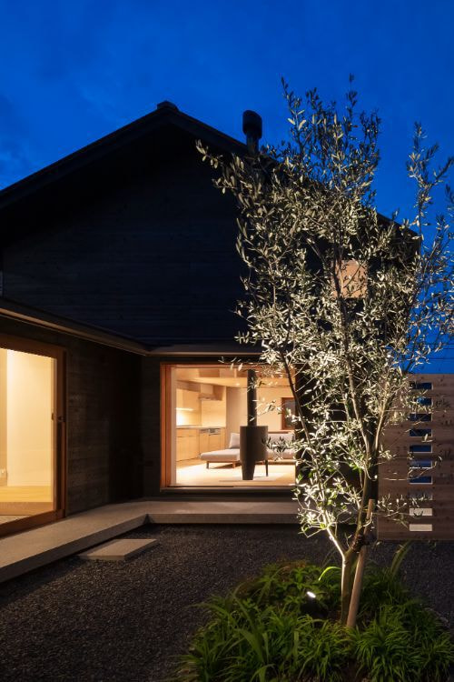 室内の光が溢れてくる畑の間。夜の玄関庭としても暖かな光で包みます。
