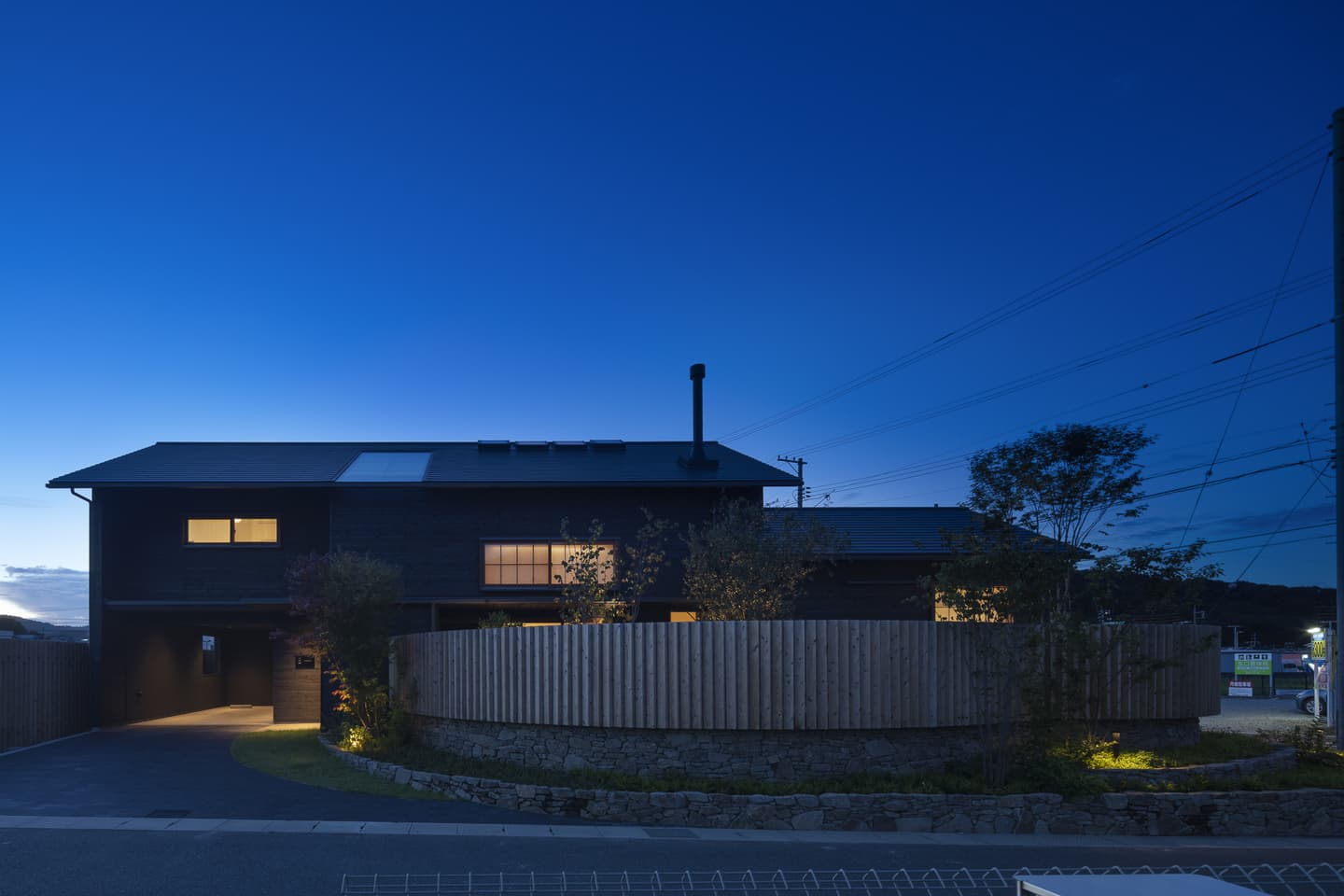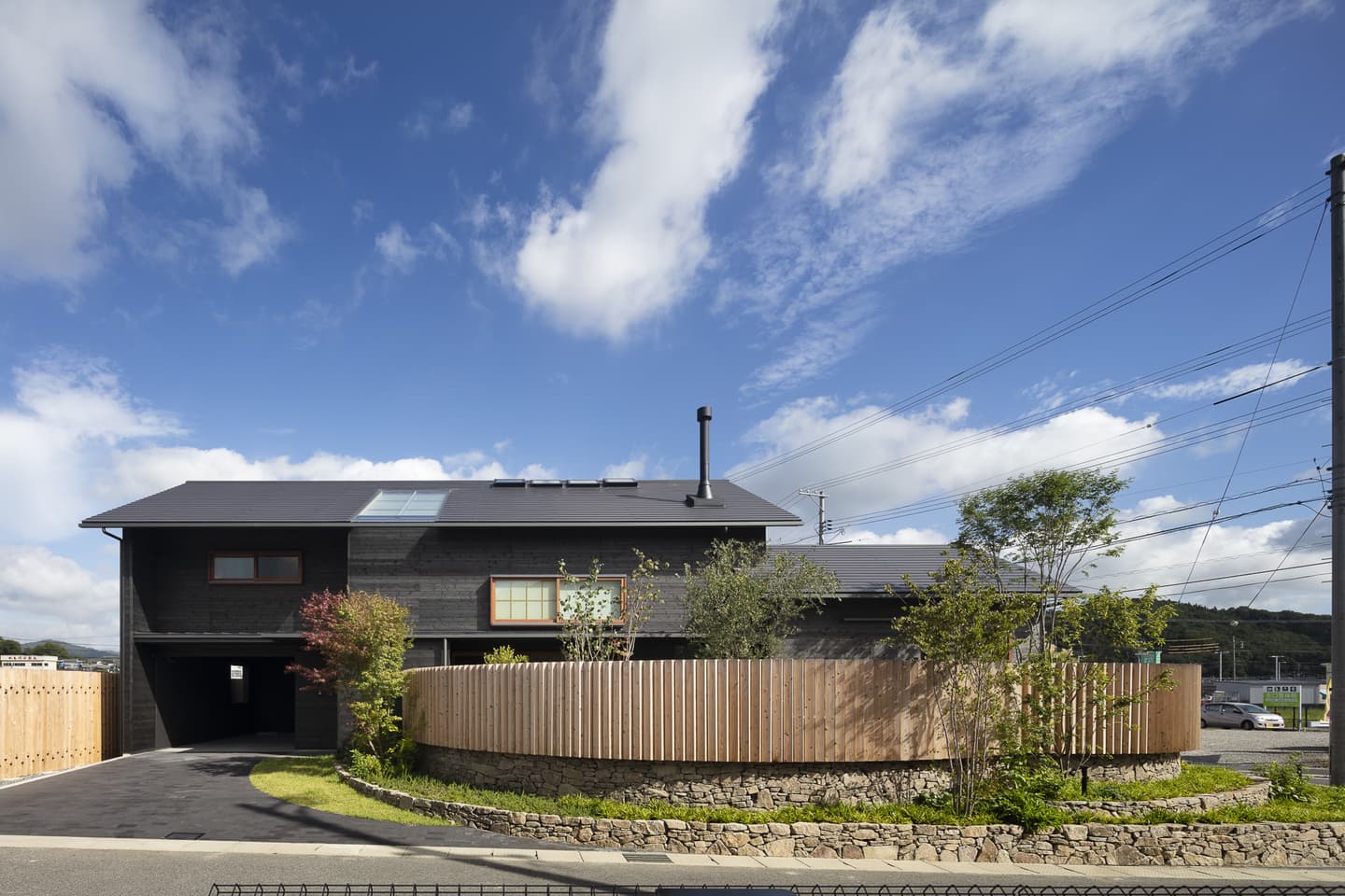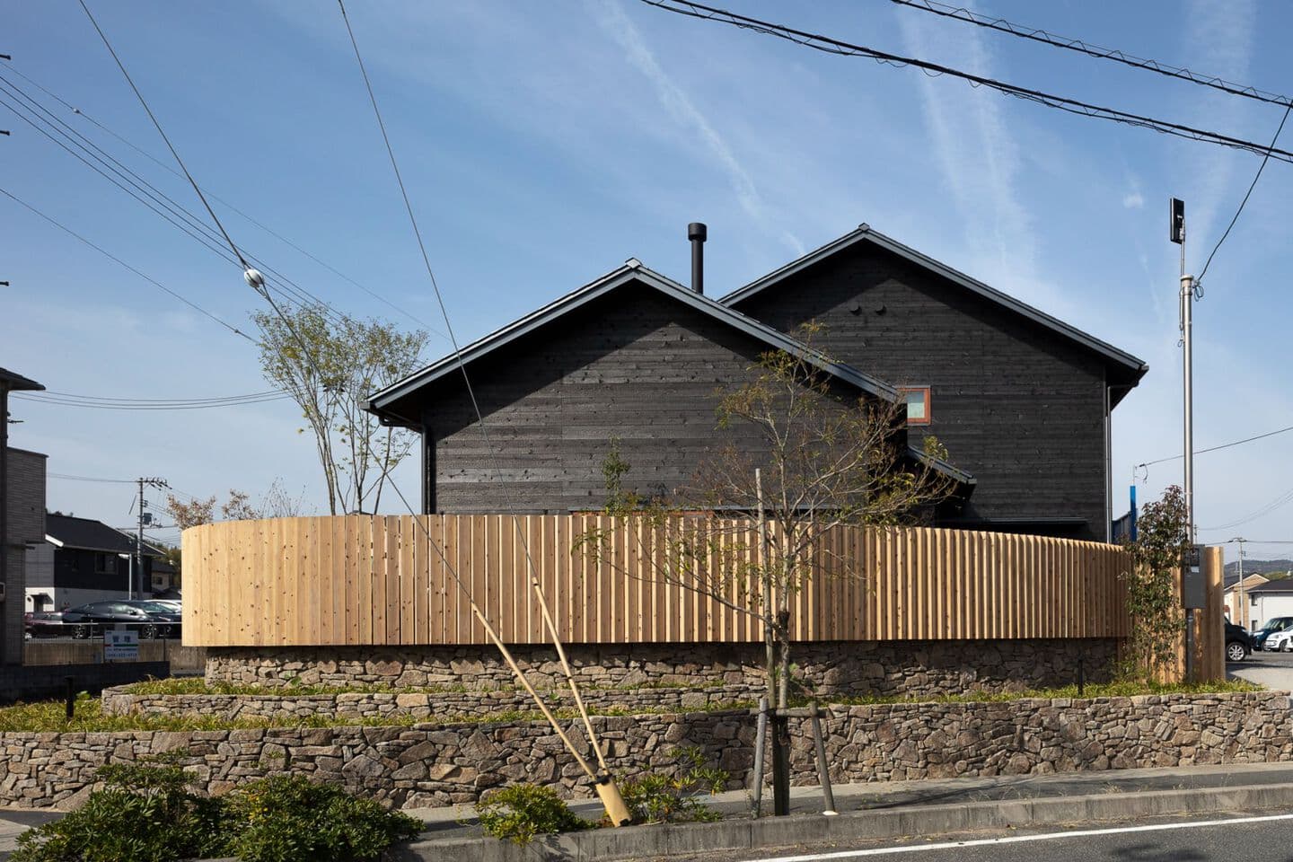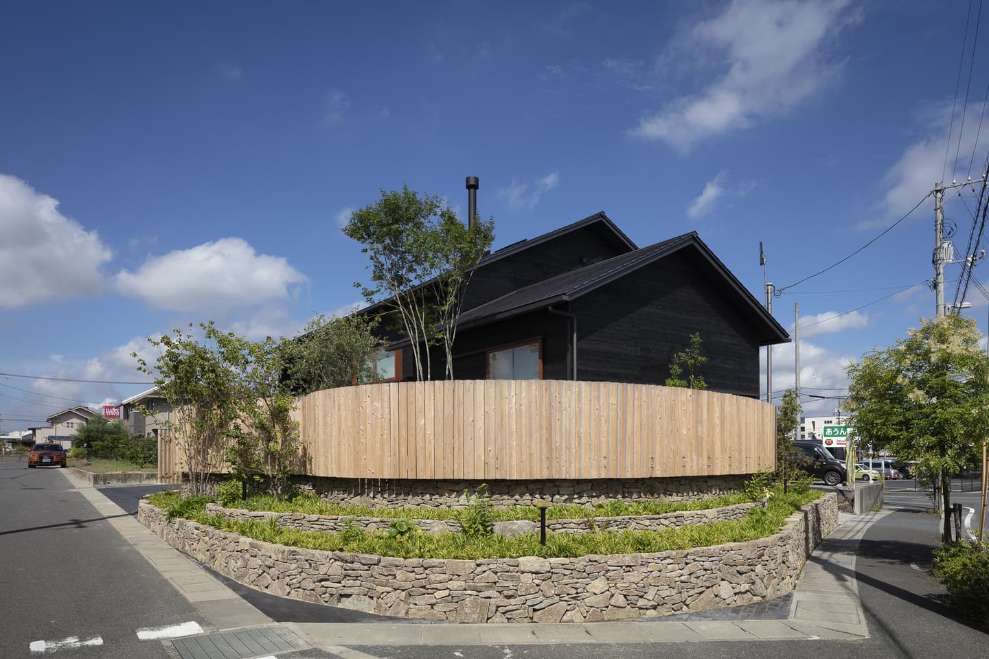 角張った角地の擁壁を撤去して、緩やかなカーブの棚田に見立てた外構。切り妻屋根と焼杉の外観はこの地域によく見られる外観です。角にあたる部分は平屋にして、街に対してひっそりとした佇まいを醸し出しています。