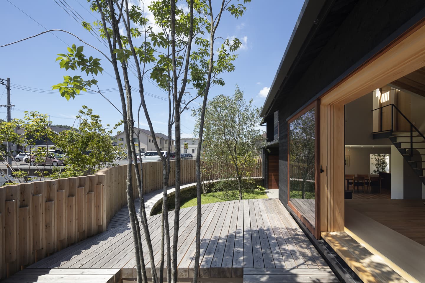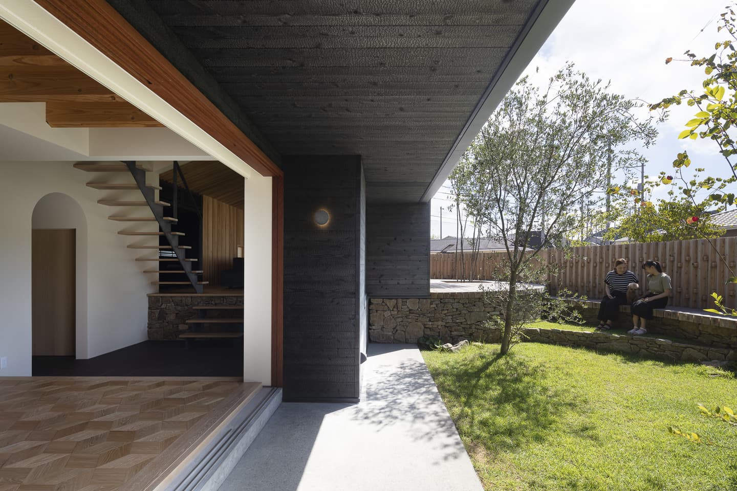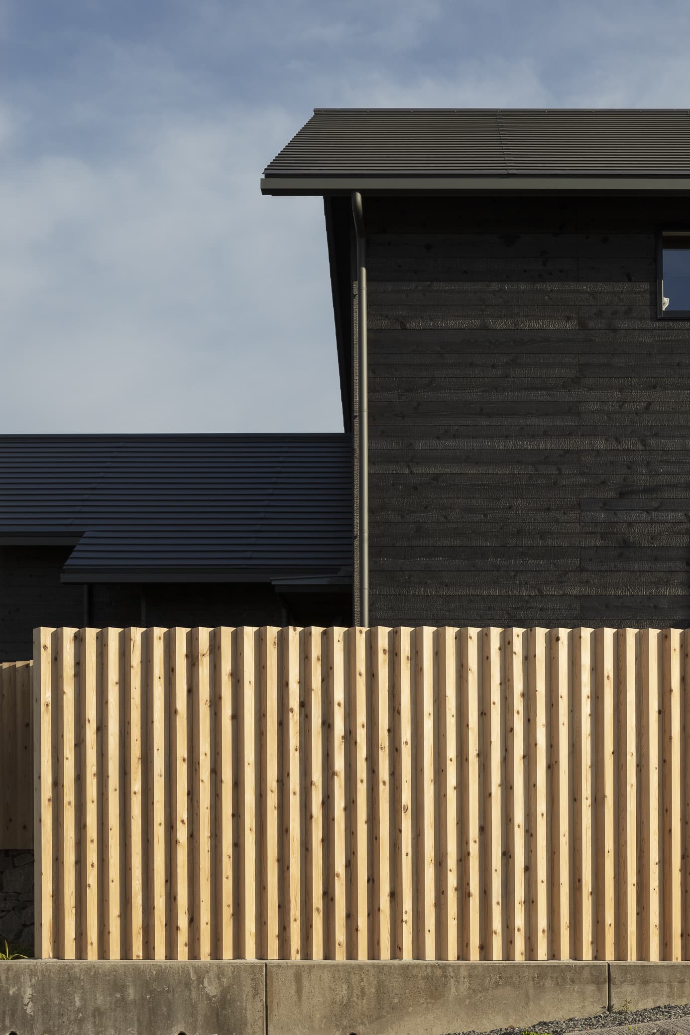 角張った角地の擁壁を撤去して、緩やかなカーブの棚田に見立てた外構。切り妻屋根と焼杉の外観はこの地域によく見られる外観です。角にあたる部分は平屋にして、街に対してひっそりとした佇まいを醸し出しています。