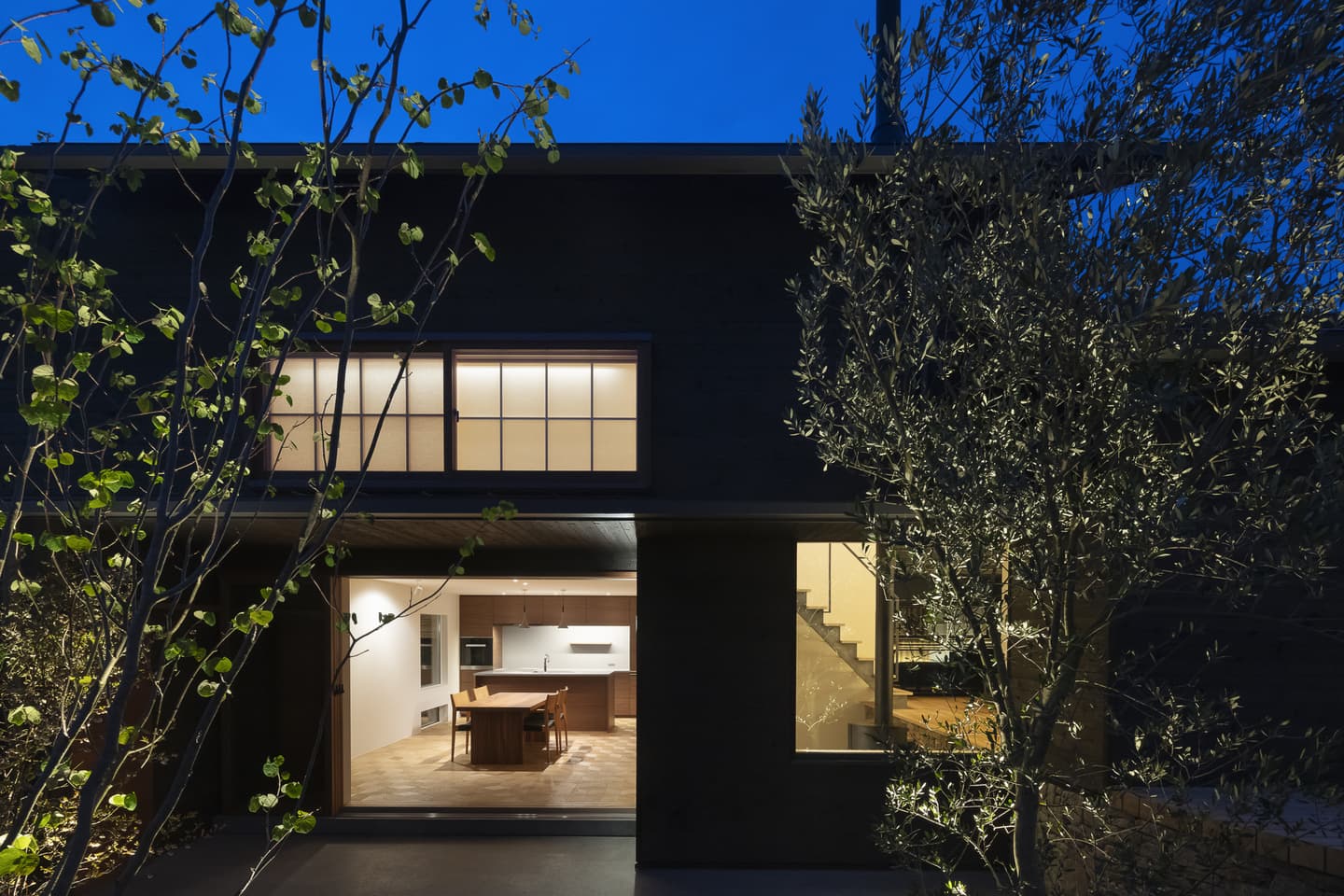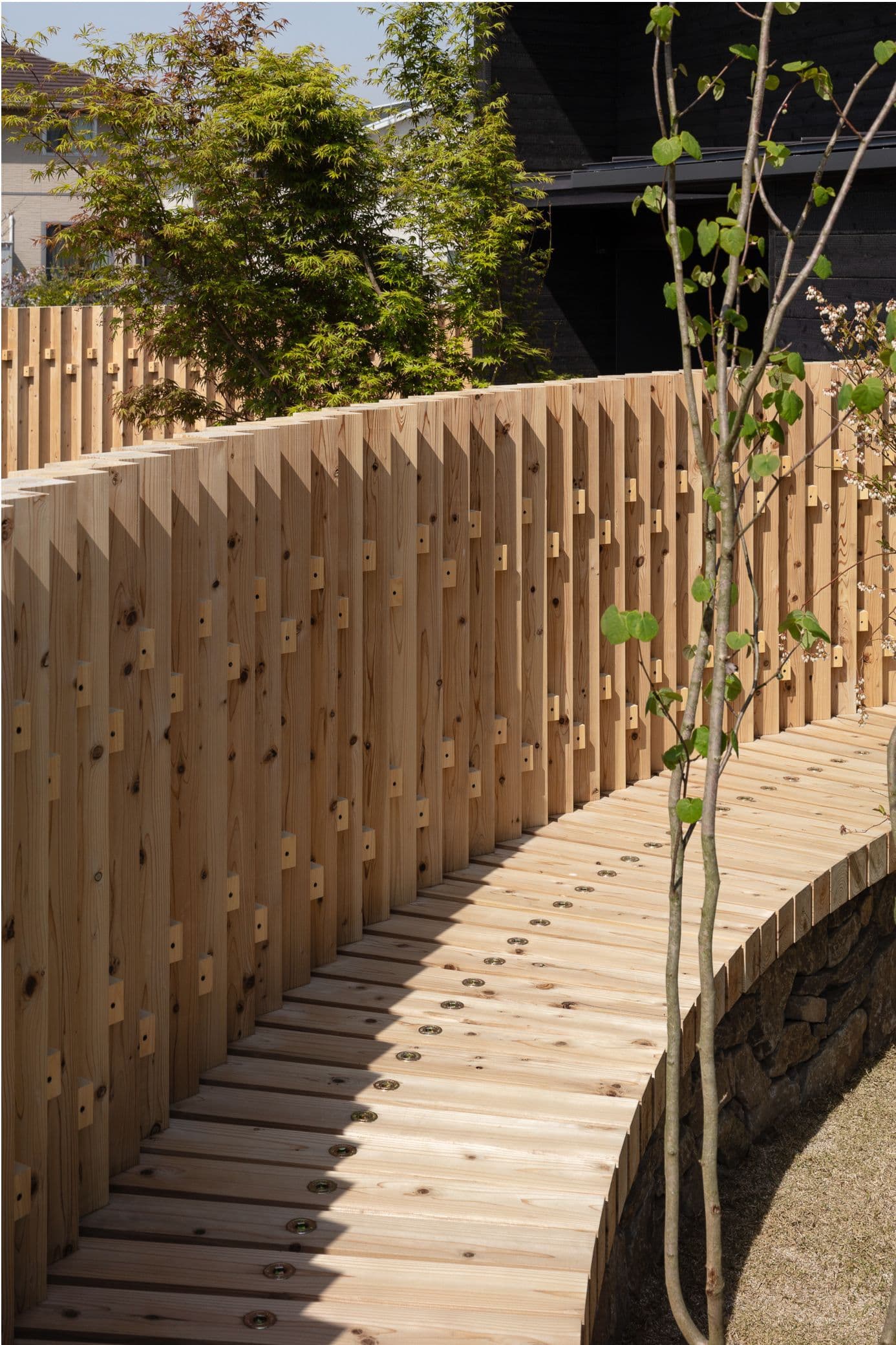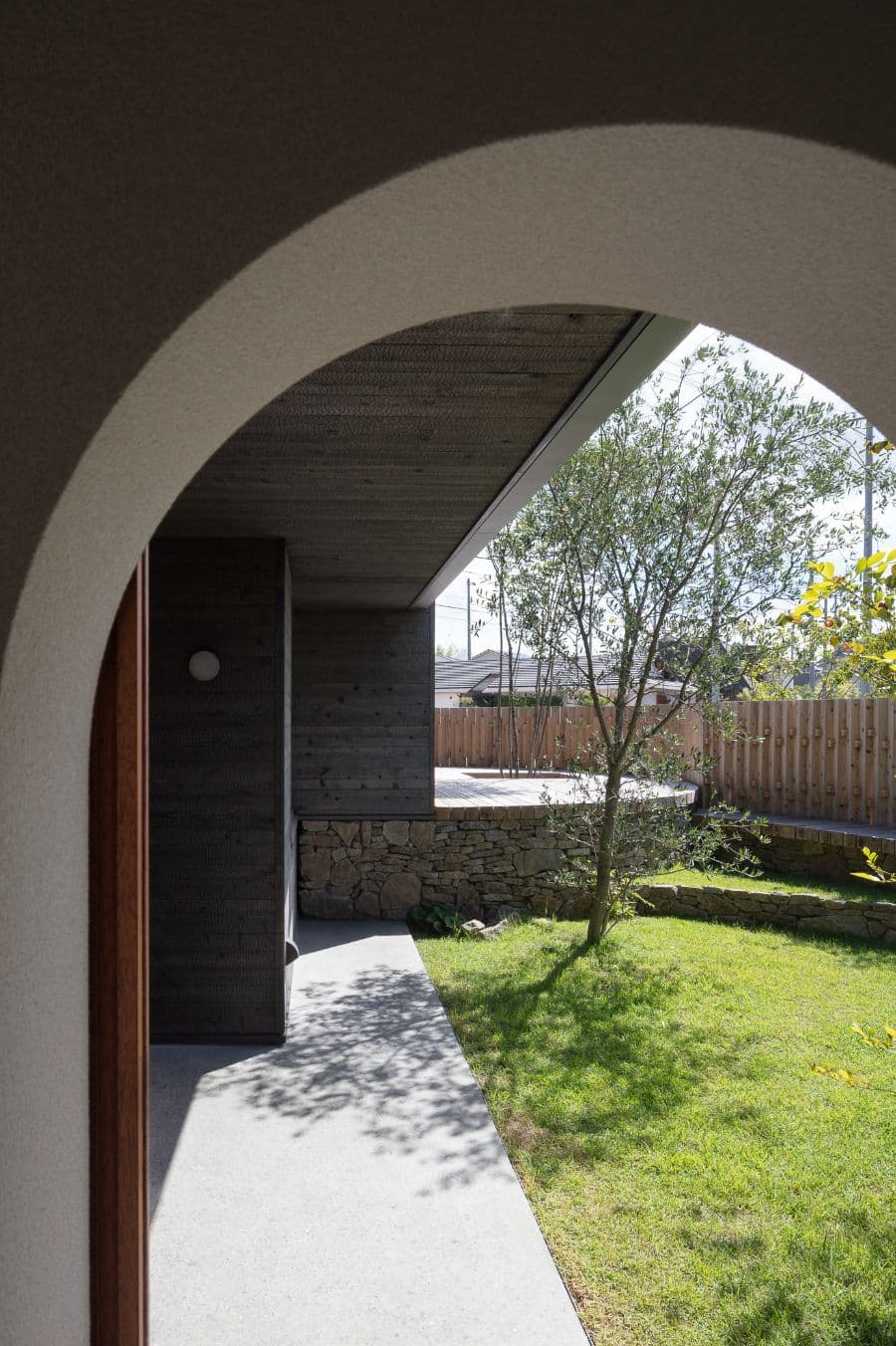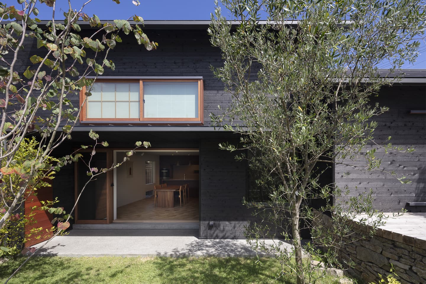 角張った角地の擁壁を撤去して、緩やかなカーブの棚田に見立てた外構。切り妻屋根と焼杉の外観はこの地域によく見られる外観です。角にあたる部分は平屋にして、街に対してひっそりとした佇まいを醸し出しています。