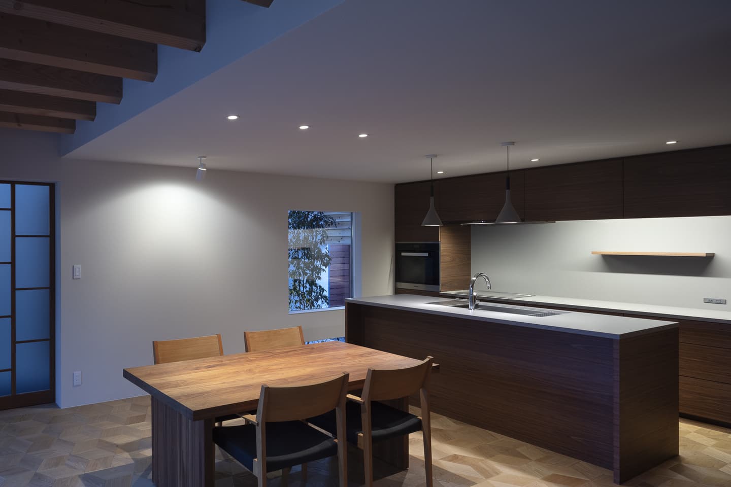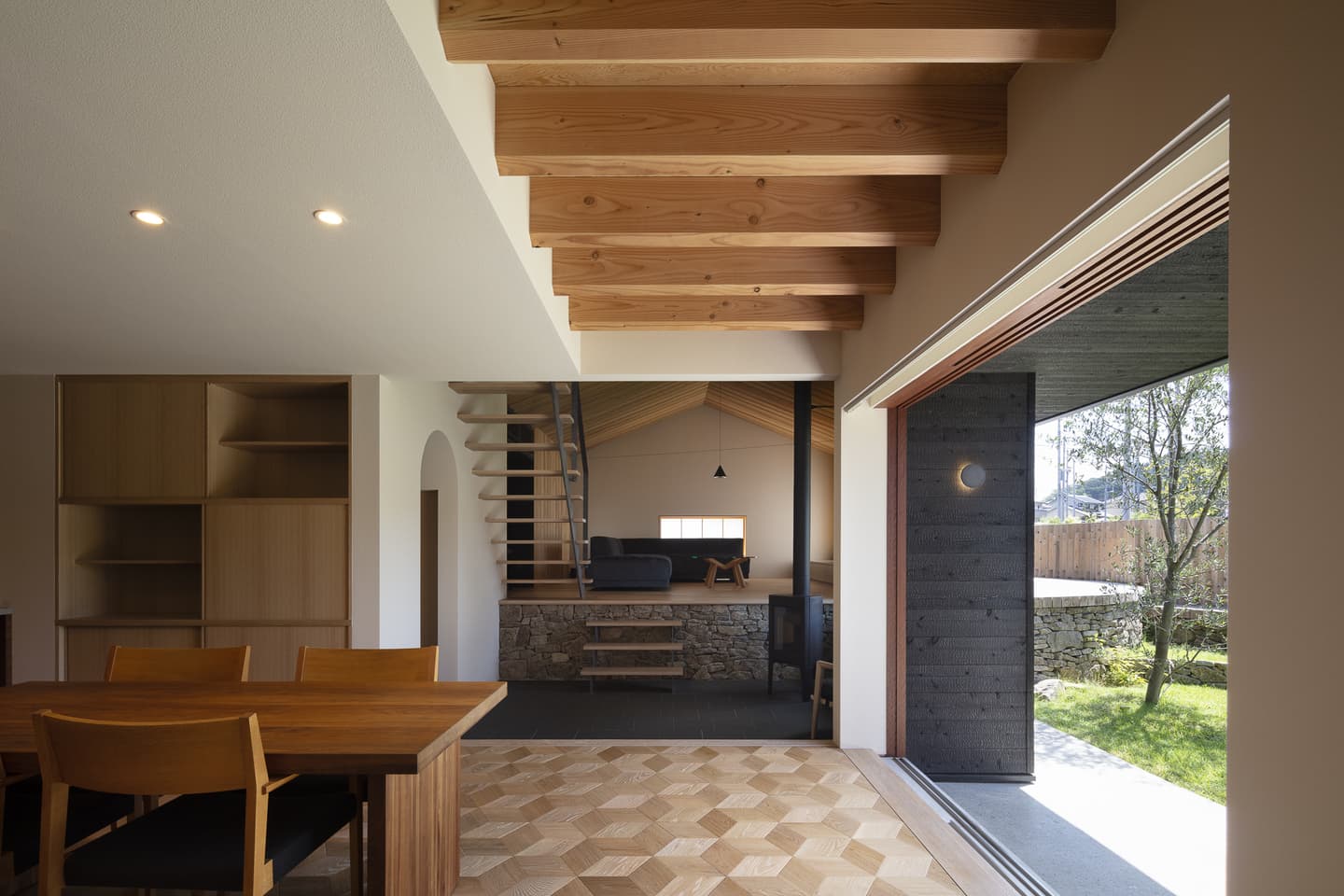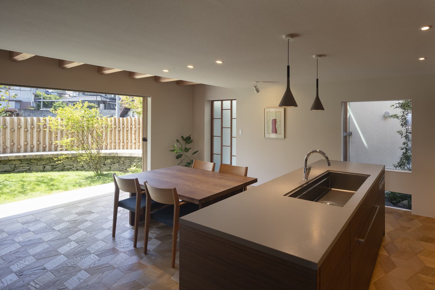 ダイニングは庭のテラスと全面開口の引き戸で繋がり、開け放すと庭と一体化します。