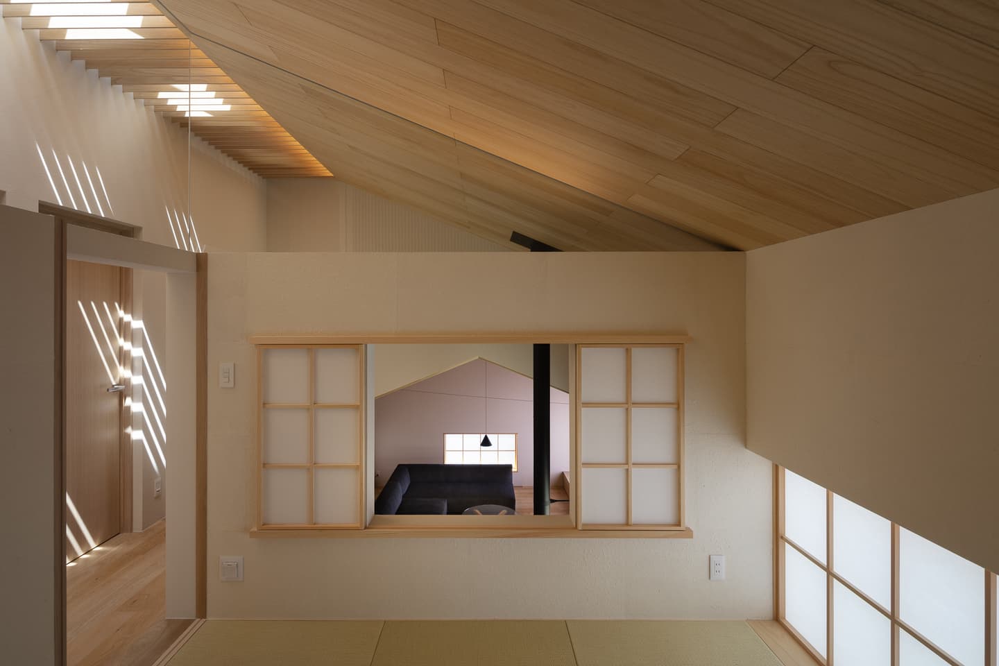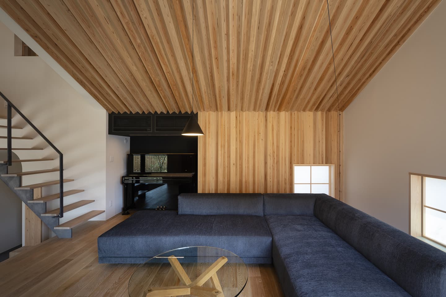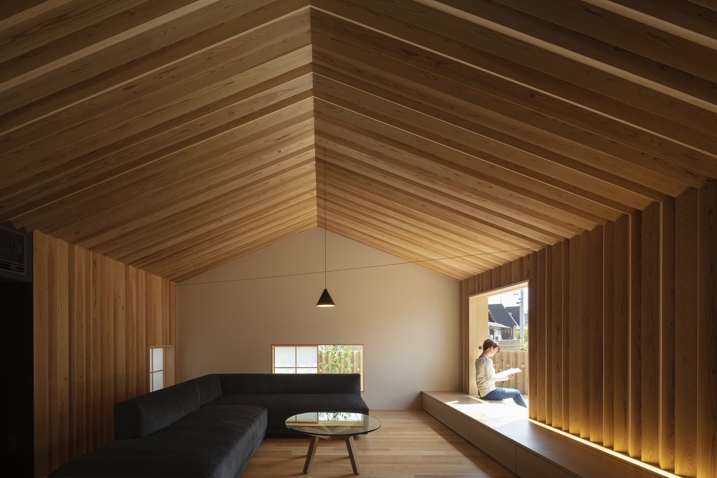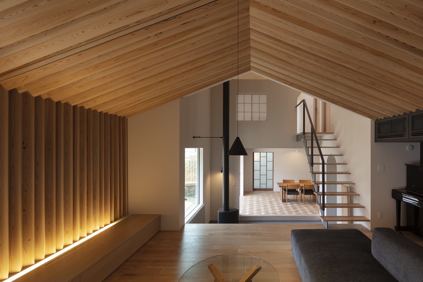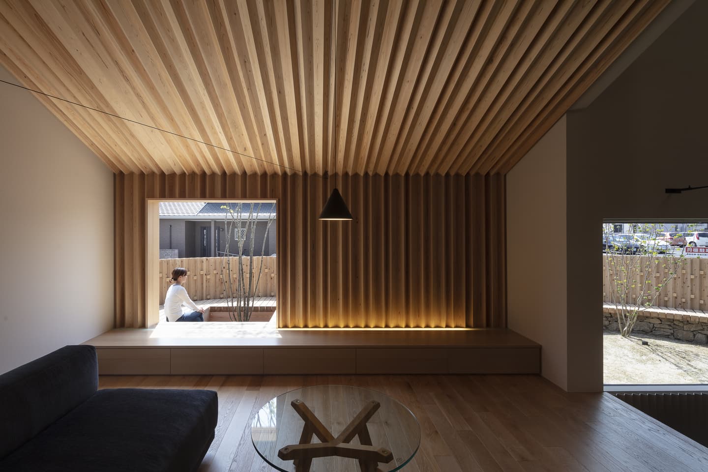 リビングの壁と天井は100㎜角の杉の角材を角度を変えながら並べた造形で陰影が美しい空間です。