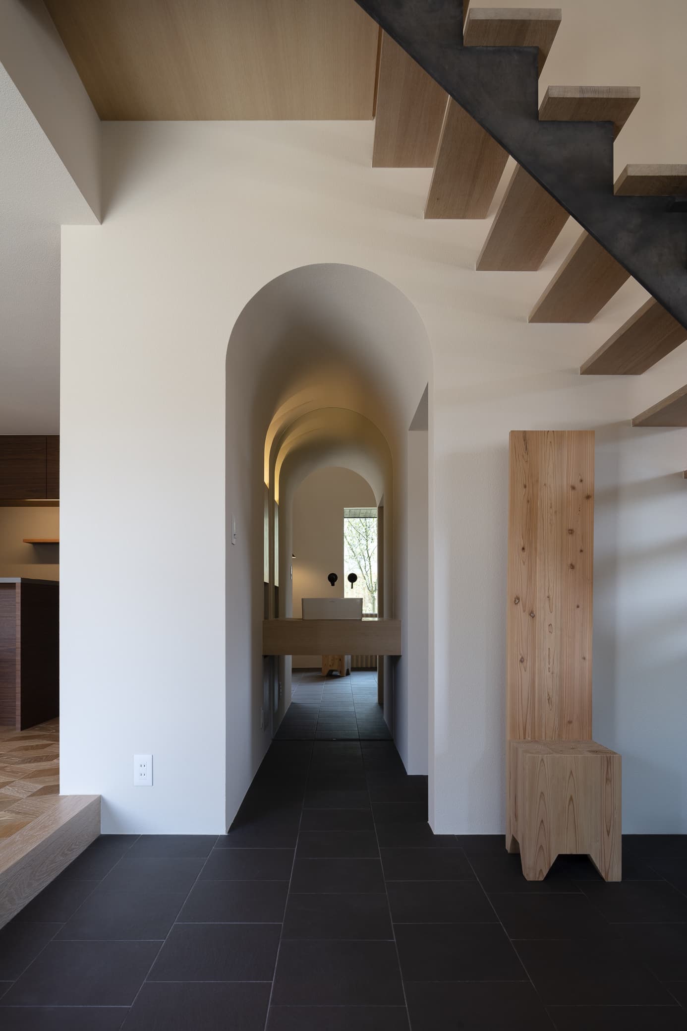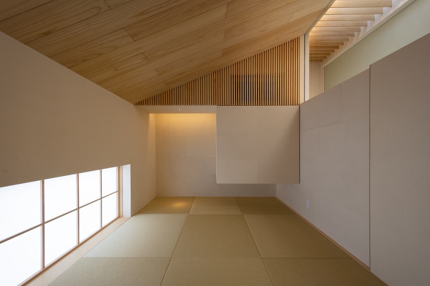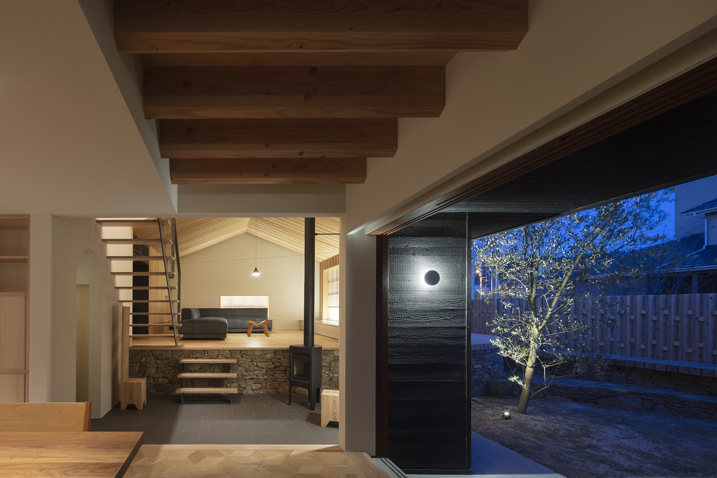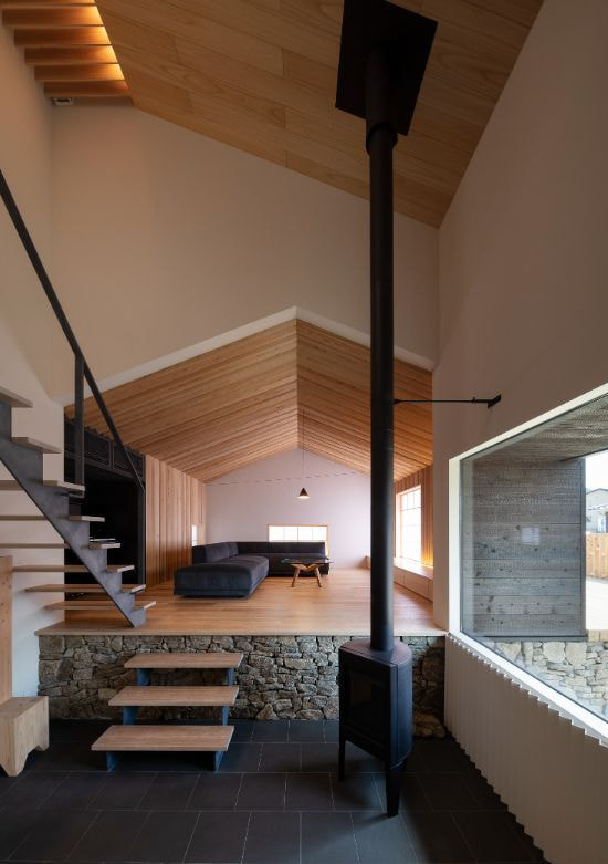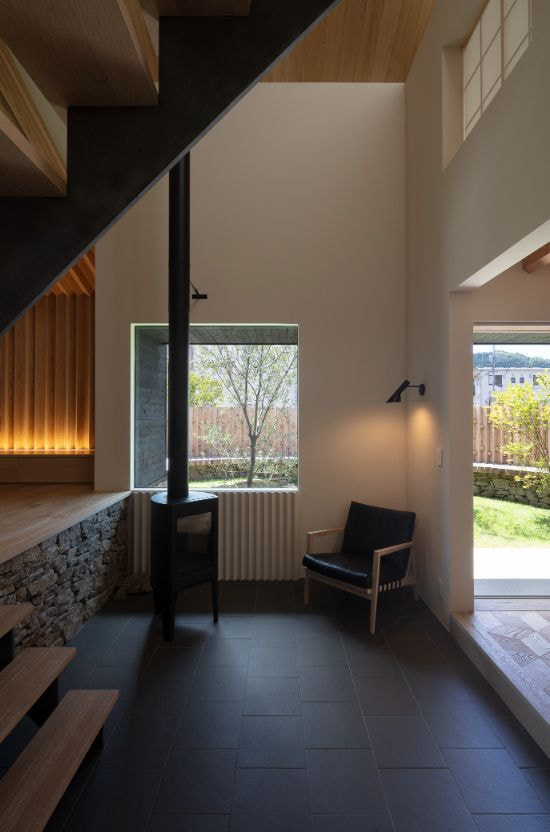 250年ものあいだ棚田だった土地の記憶を追想し、風景を再現した住宅。段状の石積みの上に、キチジョウソウを茂らせ棚田に見立て、その上に暮らすという敷地の歴史に敬意を払う建ち方です。外構や室内には杉の角材の角を活かした用い方をし、陰影がもたらす新鮮な意匠を生み出しています。素朴な佇まいと、高密度なディティールで、懐かしくも新しい世界観を描いています。緩やかに弧を描く棚田の石垣は、室内にまで侵入して、元々あったかのような高低差が日常生活の動線にも変化を与える豊かなシークエンスの住宅です。