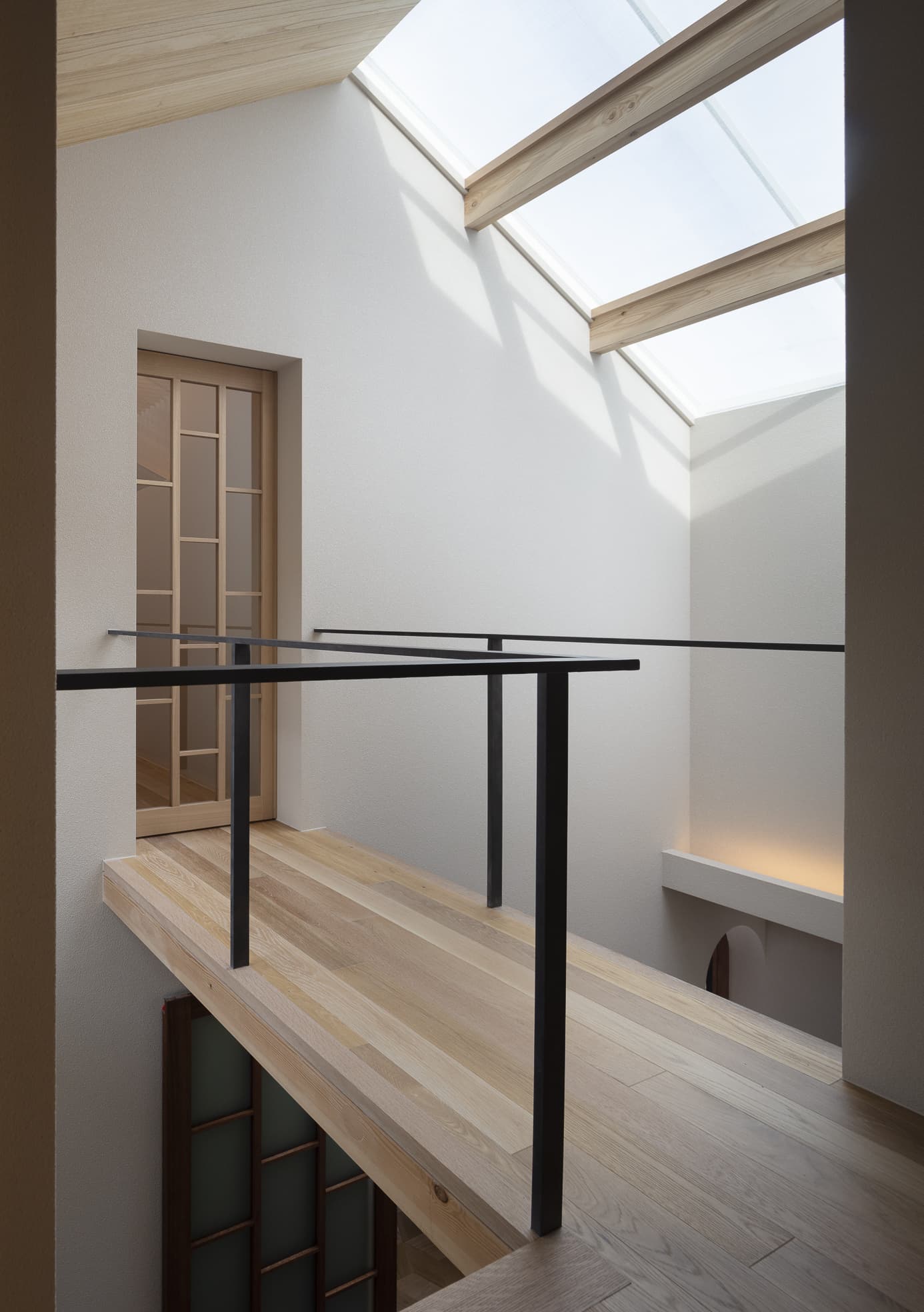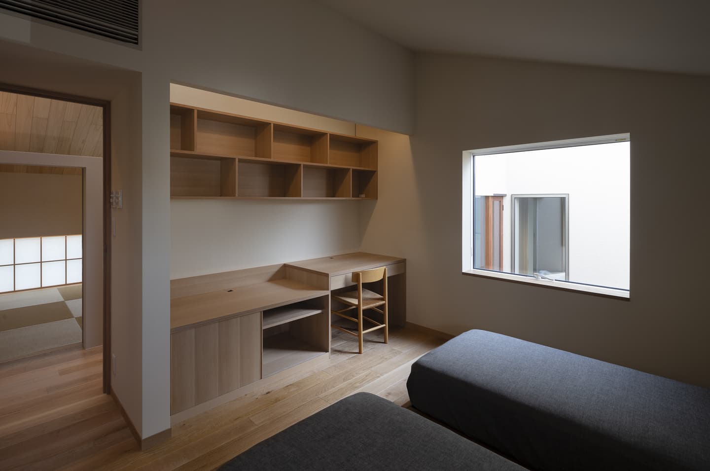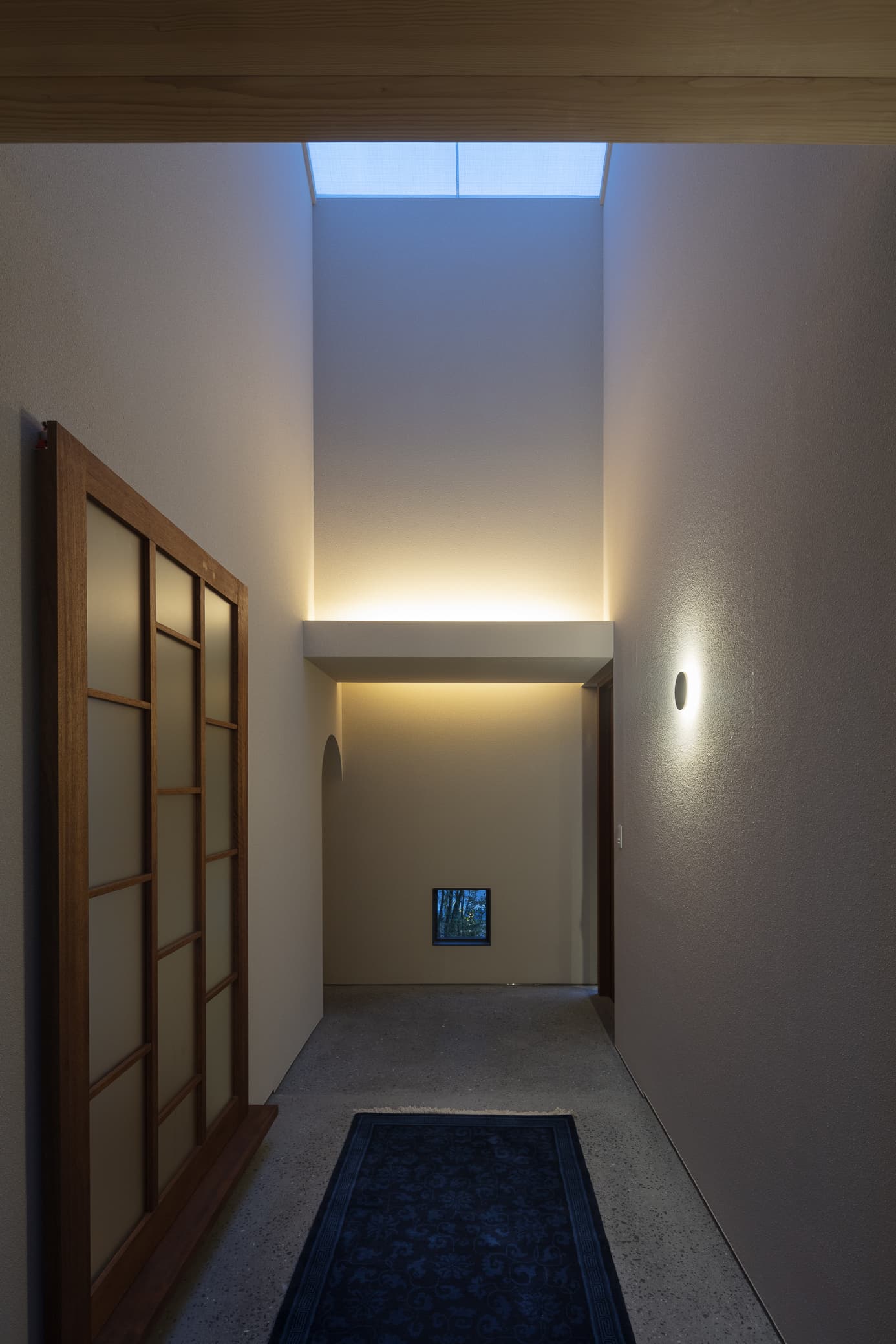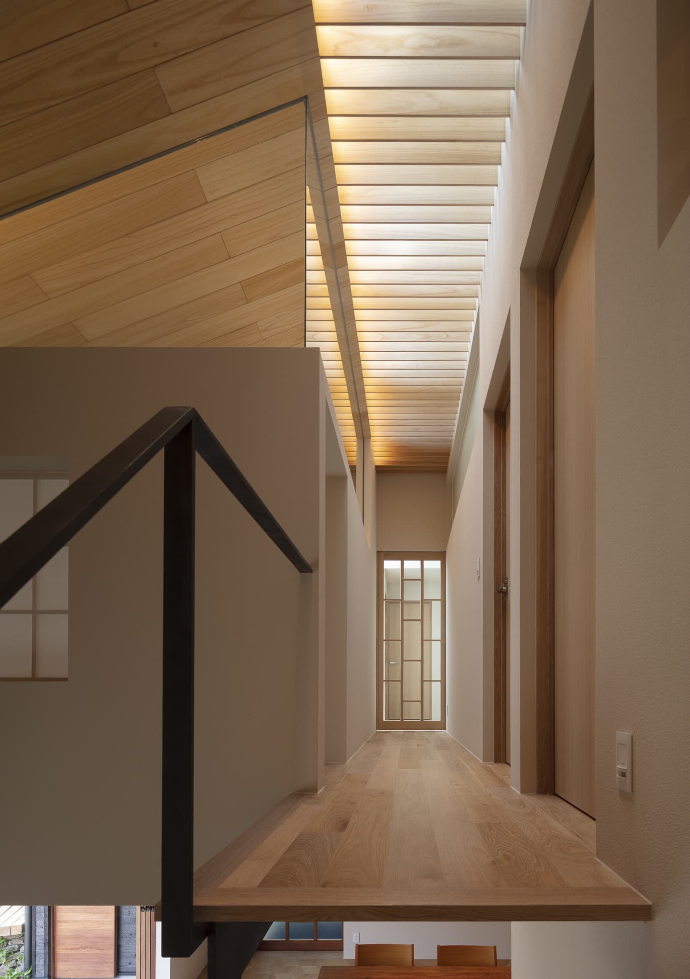 250年ものあいだ棚田だった土地の記憶を追想し、風景を再現した住宅。段状の石積みの上に、キチジョウソウを茂らせ棚田に見立て、その上に暮らすという敷地の歴史に敬意を払う建ち方です。外構や室内には杉の角材の角を活かした用い方をし、陰影がもたらす新鮮な意匠を生み出しています。素朴な佇まいと、高密度なディティールで、懐かしくも新しい世界観を描いています。緩やかに弧を描く棚田の石垣は、室内にまで侵入して、元々あったかのような高低差が日常生活の動線にも変化を与える豊かなシークエンスの住宅です。