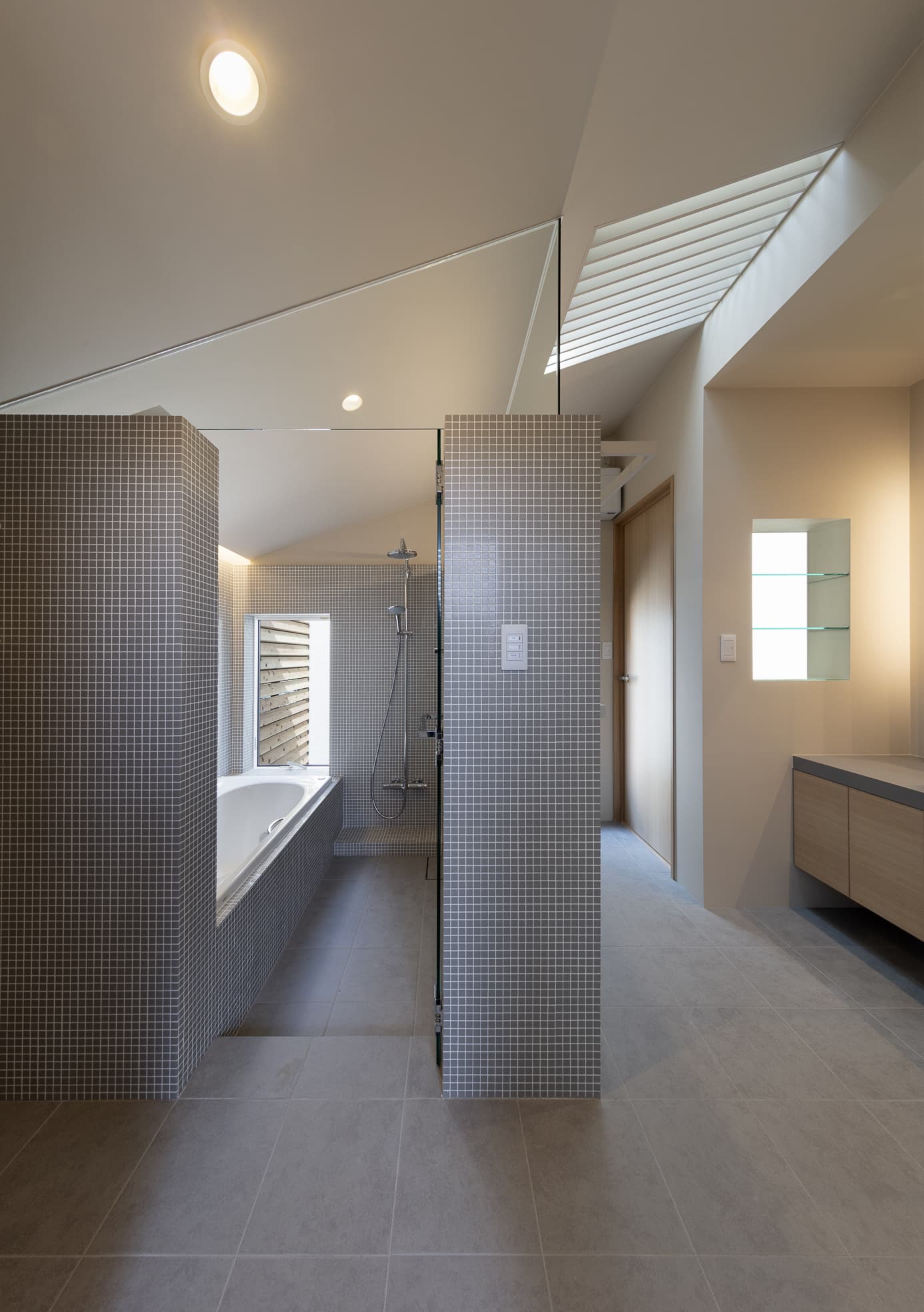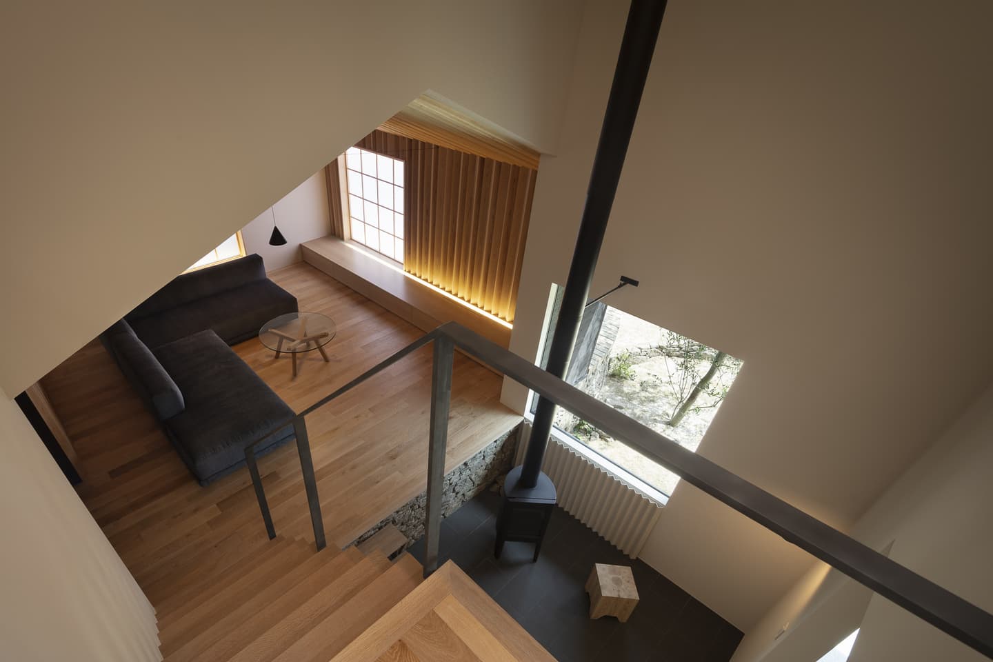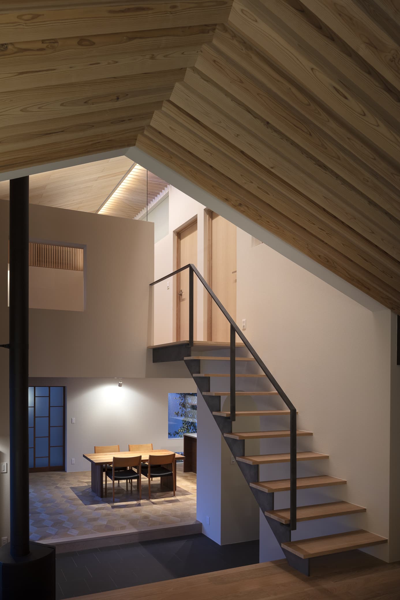 歩みをすすめると、一段下がったタイル貼りのファイヤープレースがあり、その先の棚田の段差を上がったような位置にリビングがあります。ファイヤープレースはダイニングの前のテラスと同じ高さになっていて、生活動線が屋内外を行き来するような感覚になります。