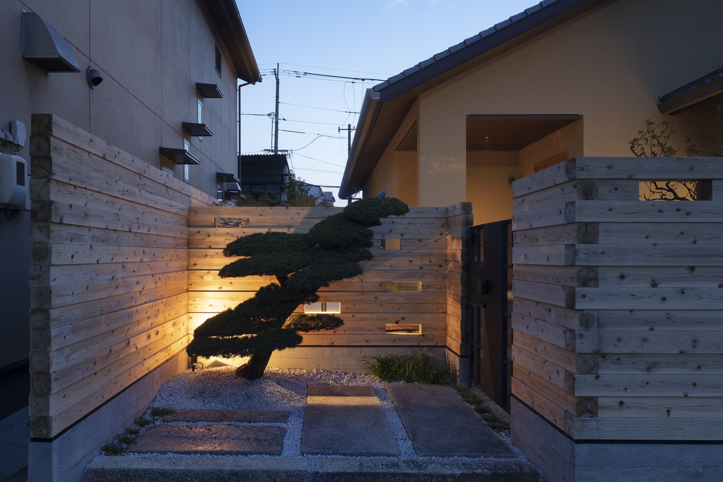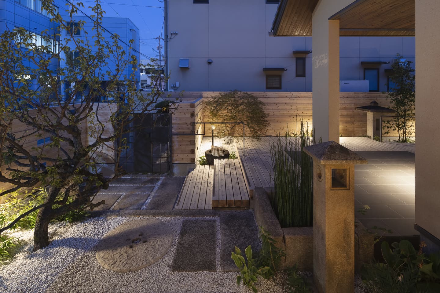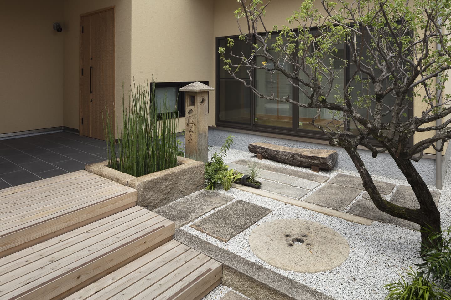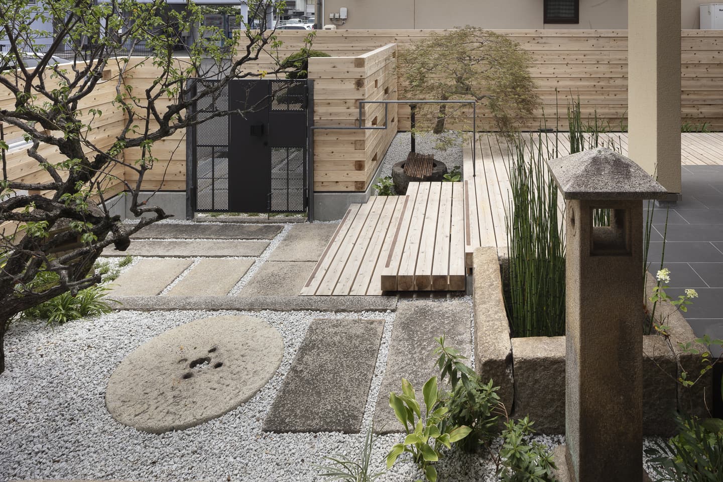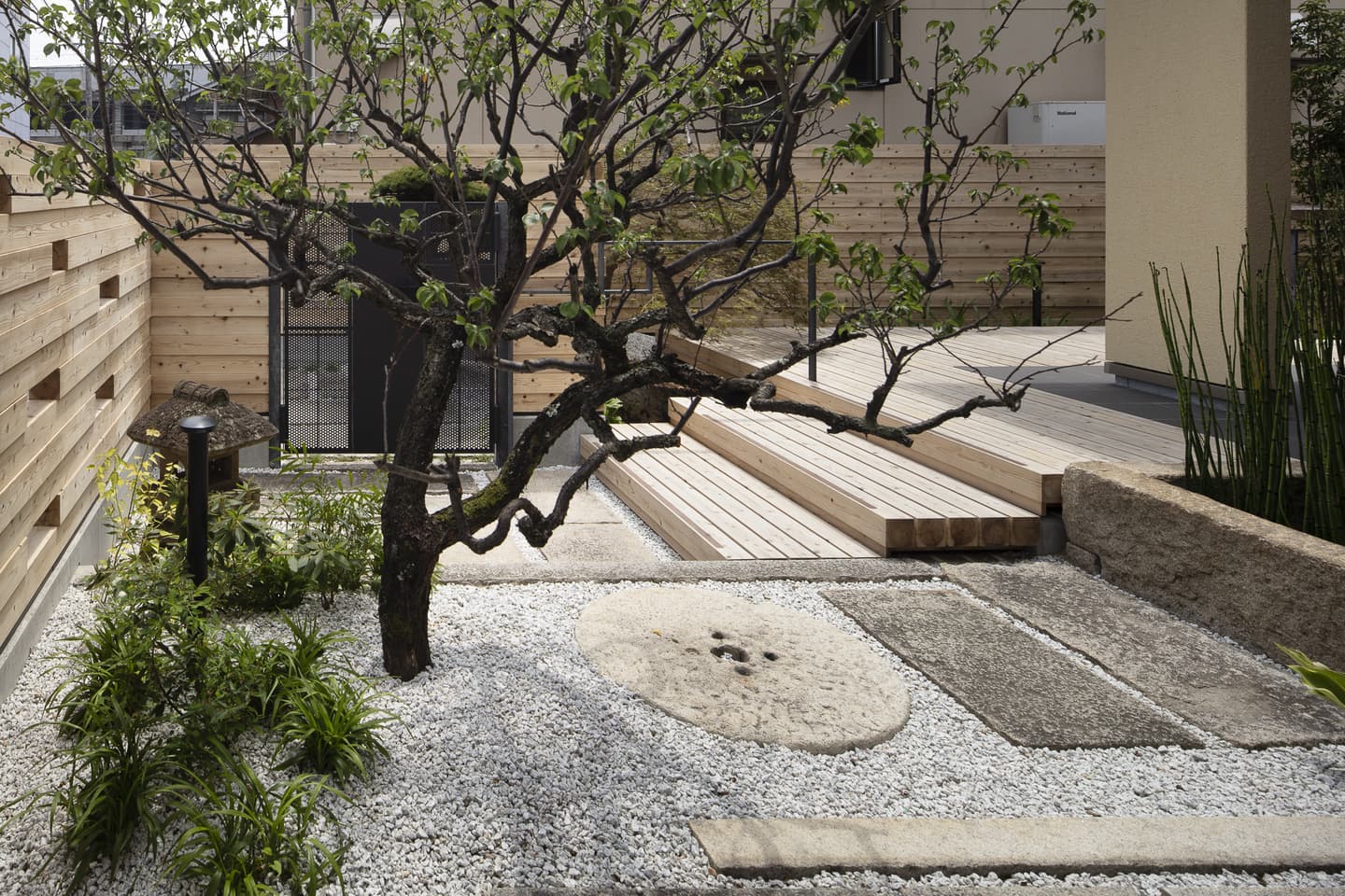 100年近くの歴史ある庭の移築。都心への住み替えに際し、長年親しんでこられた庭をコンパクトに抽出して再構築。木の塀は杉の注入材を積層して陰影をつけました。キリリとした五葉松、悠然とした梅、光を包み込むような枝垂れ紅葉を移植し、石畳や石灯籠も移設しました。枯れ井戸にはトクサを植えて、時間の流れを表現しました。駐車場から玄関までを繋ぐスロープは少し浮いた桟橋に見立てて、地面の玉砂利に埋めた瓦や長石で波を描いています。