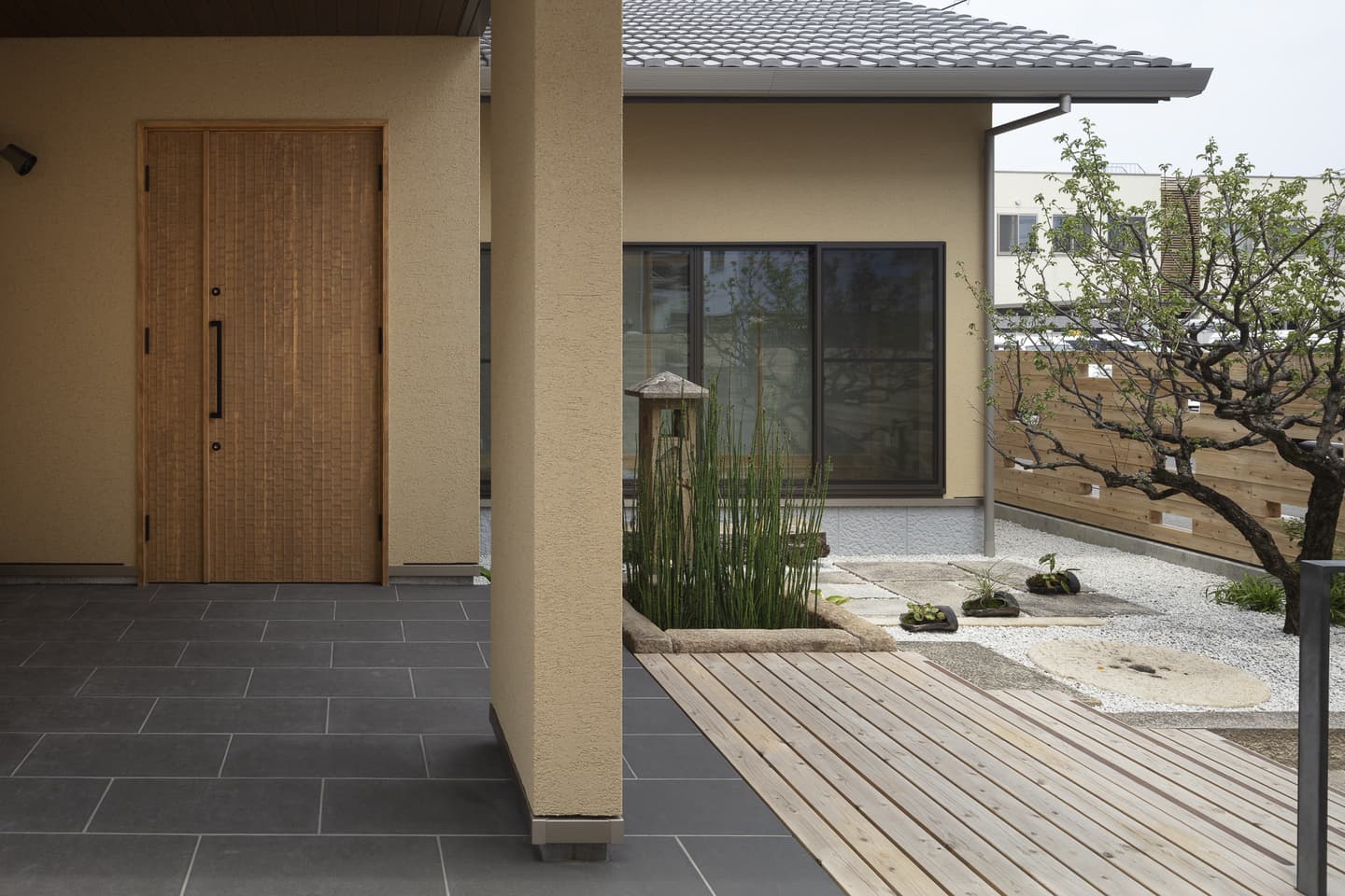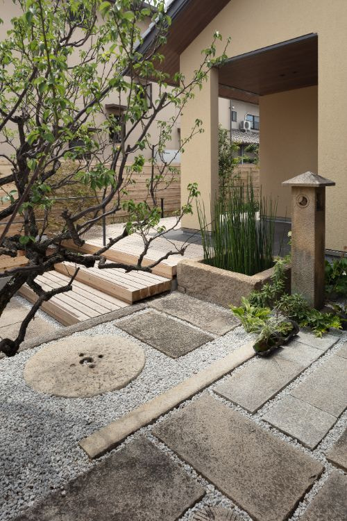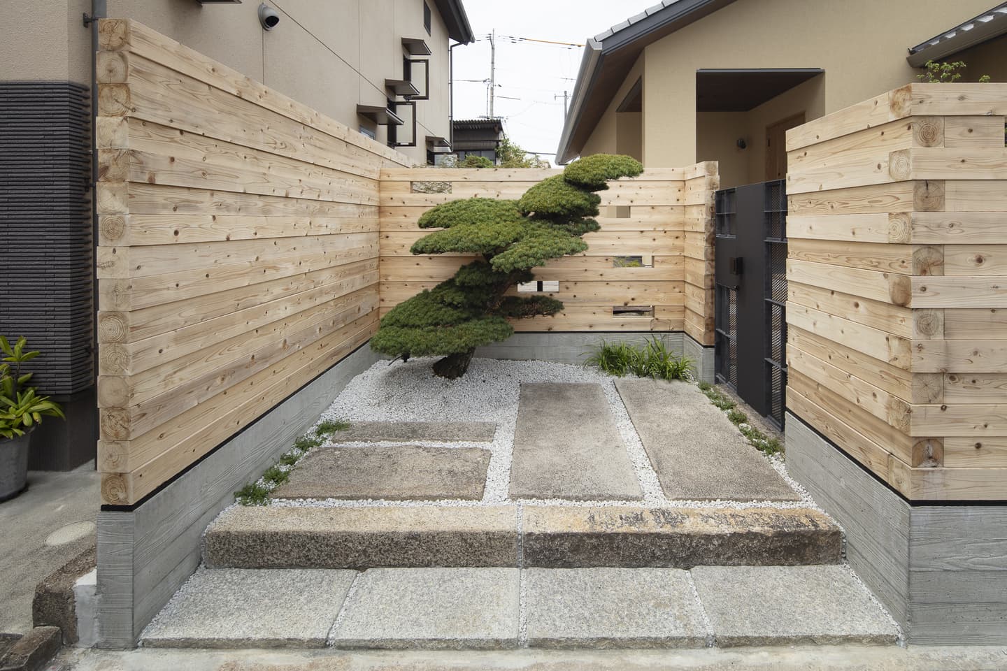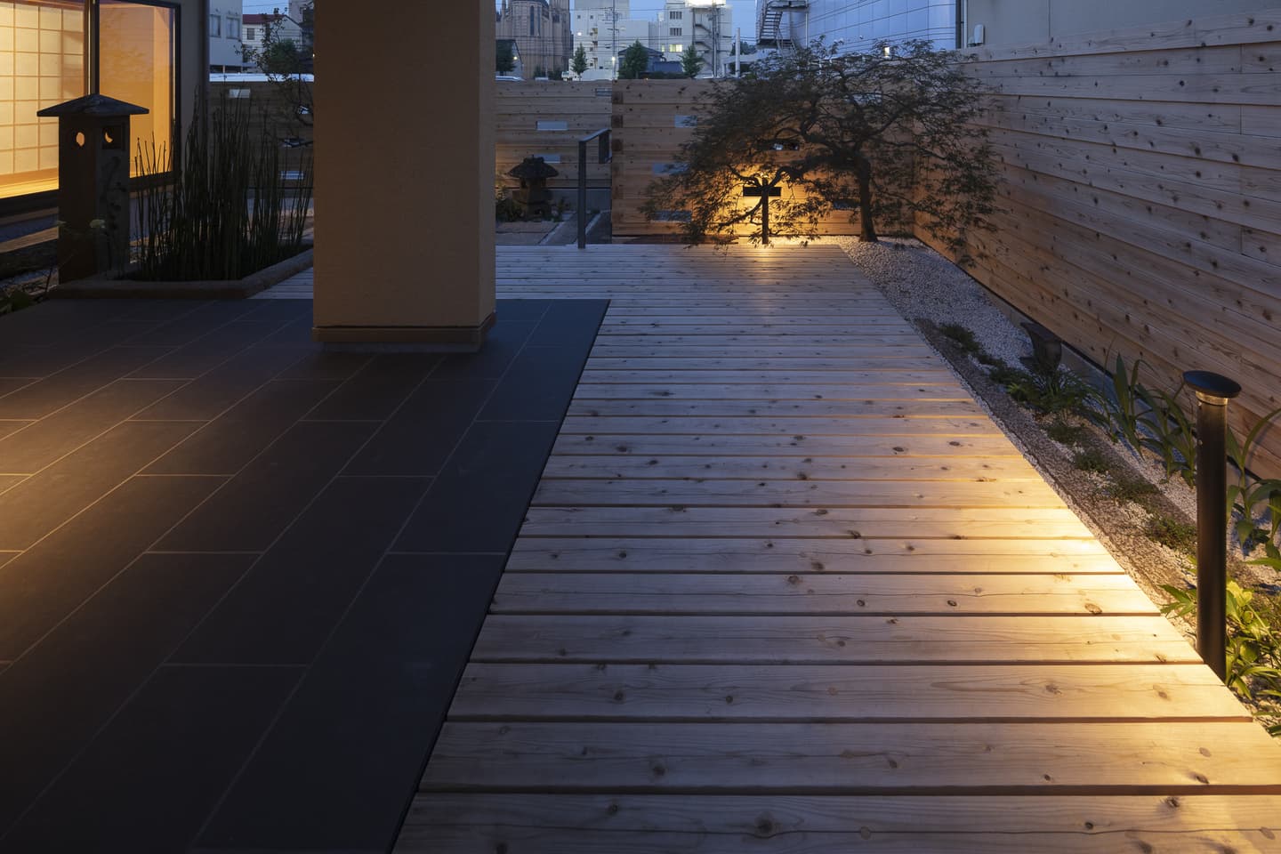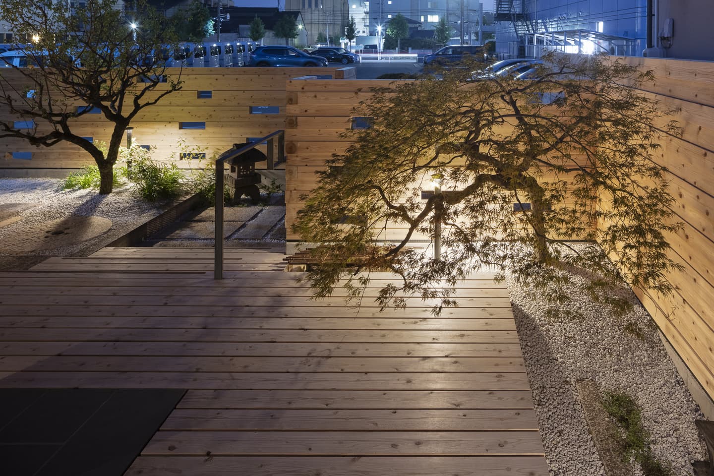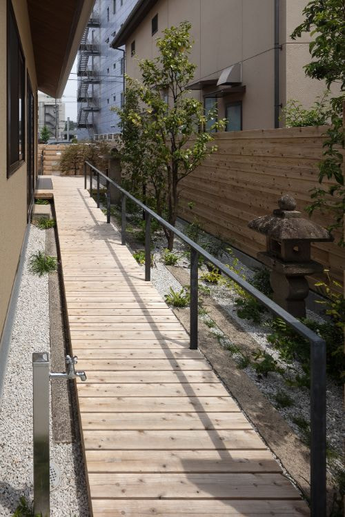 100年近くの歴史ある庭の移築。都心への住み替えに際し、長年親しんでこられた庭をコンパクトに抽出して再構築。木の塀は杉の注入材を積層して陰影をつけました。キリリとした五葉松、悠然とした梅、光を包み込むような枝垂れ紅葉を移植し、石畳や石灯籠も移設しました。枯れ井戸にはトクサを植えて、時間の流れを表現しました。駐車場から玄関までを繋ぐスロープは少し浮いた桟橋に見立てて、地面の玉砂利に埋めた瓦や長石で波を描いています。